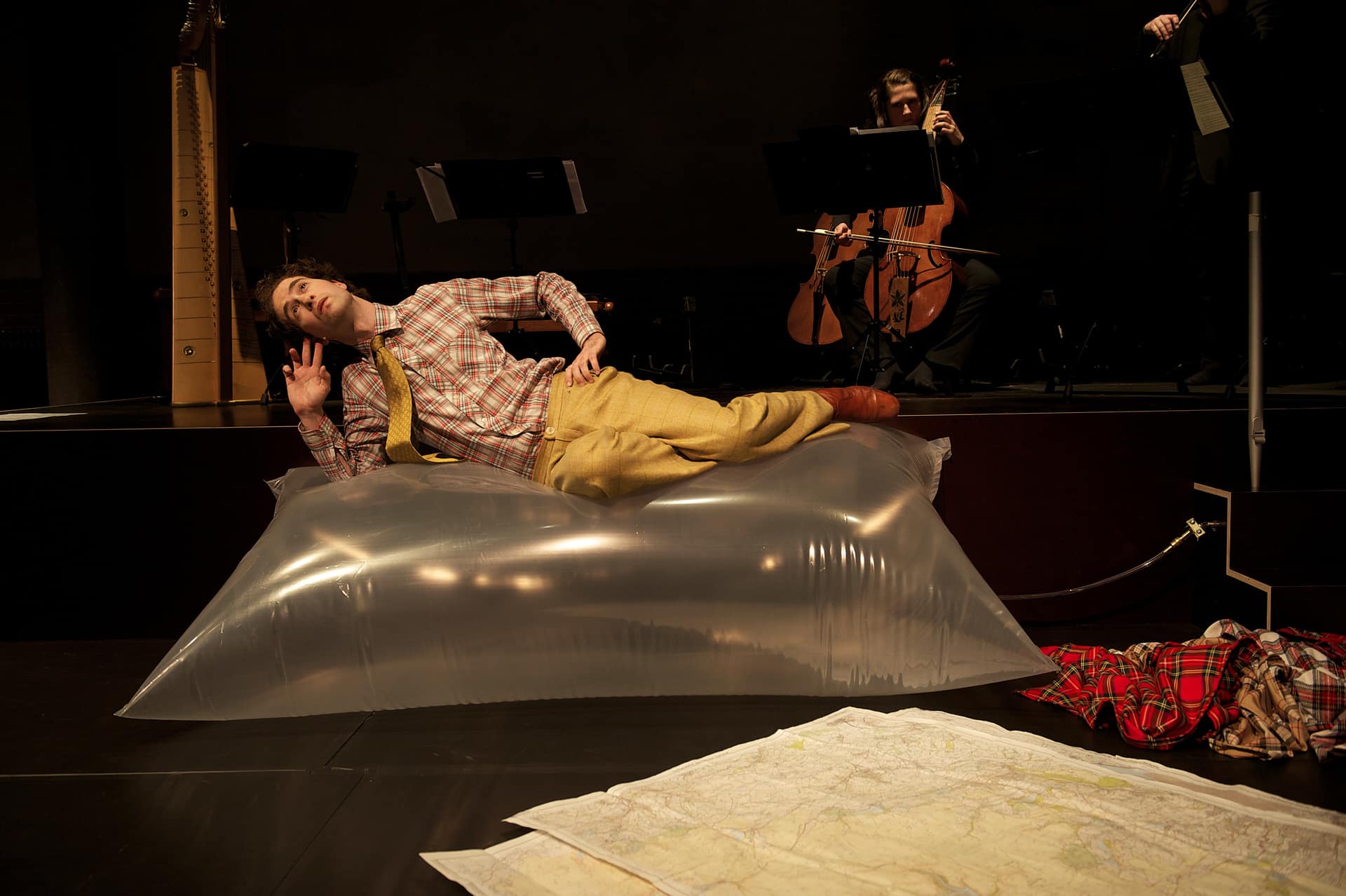Whisky in der Tafelhalle – und das bei der ION, wie geht denn das zusammen? Sehr gut, wie sich beim Auftritt der Musikperformer Nico and the Navigators und des Instrumentalensembles Urban Strings zeigte. Beide führten in einem inszenierten Konzert das Publikum in die schottischen Highlands und ließen die höfische Musik von Henry Purcell, Nicola Matteis, Francesco Corbetta und Thomas Mace mit der Folk-Musik der noch heute gepflegten schottischen Fiddler-Kultur – u. a. des berühmten Niel Gow zusammenfließen. Gemeinsames Lösungsmittel: der Highland-Whisky, den dort schließlich christliche Mönche einst erfanden und dessen so geistiges wir flüchtiges Naturell trefflich im Konzerttitel eingefangen wurde. Als Angels’ Share gilt jener Anteil des Whiskys, der bei der Lagerung verdunstet. Er gehöre den Engeln heißt es, vielleicht hatte deshalb die so unnahbar wie fragil wirkende Tänzerin Nadine Milzner in ihrem Goldkleid einen großen Fächer eingearbeitet, den sie wie einen Englesflügel ausbreiten konnte. Ihre anmutig zögerlich Bewegungspoesie bettete die künstlerische Leiterin Nicola Hümpel in eine mit Situationskomik à la Christoph Marthaler angereicherte Rahmenhandlung. Ein schottischer Fiddler (Georg Kallweit), der mit tragbarem Plattenspieler nach Gehör spielt, und ein Barockensemble geraten erst aneinander, lassen letztlich aber im gemeinsamen Musizieren die leidig Trennung zwischen „ernster“ und „unterhaltender“ Musik obsolet werden. Ein schlacksiger und redseliger junger Engländer (Adrian Gillott) spürt seinem schottischen Herzen nach, nebenbei flirtet er linkisch mit der charmanten Sängerin Julla von Landsberg. Die Idee dahinter: Der neue ION Cher Folkert Uhde will in der im Berliner Radialsystem V zuerst gezeigten Performance die starren Rituale eines herkömmlichen Konzerts aufbrechen. Die augenzwinkernde Mischung aus Komik und Poesie der Spielszenen soll die Konzentration schärfen und einen emotionaleren Zugang zur Musik schaffen. Das funktioniert sehr gut: Etwa wenn von Landsberg mit ihrem herrlich weich timbrierten Barocksopran hingebungsvoll Purcells „Music for a while“ singt während sie von Gillott ehrfürchtig umklammert wird. Oder wenn drei Geiger beim Frost-Stakkato des Cold Song als bedrohliche Schattengestalten and Landsberg heranrücken. Diese körperlicher Qualität lässt auch das Spiel des Barockensembles plastischer wirken, herausragend in Präsenz und Bogenführung agiert hier die Violinistin Mayumi Hirasaki. Gillott breitet derweil eifrig Landkarten und Highland-Lyrik aus, zitiert Shakespeare und Edmund Spenser, macht sich über Kelten-Klischees lustig und schließt an ein riesiges mit Luft gefülltes Sitzkissen eine Orgelpfeife an, womit eine absurd-komische Brücke zwischen Dudelsack-Klang und dem zentralen Instrument der ION geschlagen wäre. Am Ende gibt es Whisky für alle, auch fürs Publikum, was – Puristen mögen es verzeihen – als eine Art der Kommunion körperlicher und intensiver wirkt als so manches herkömmliche sakrale Konzert. Der treibende Rhythmus der Pub-Musik reißt alle mit.