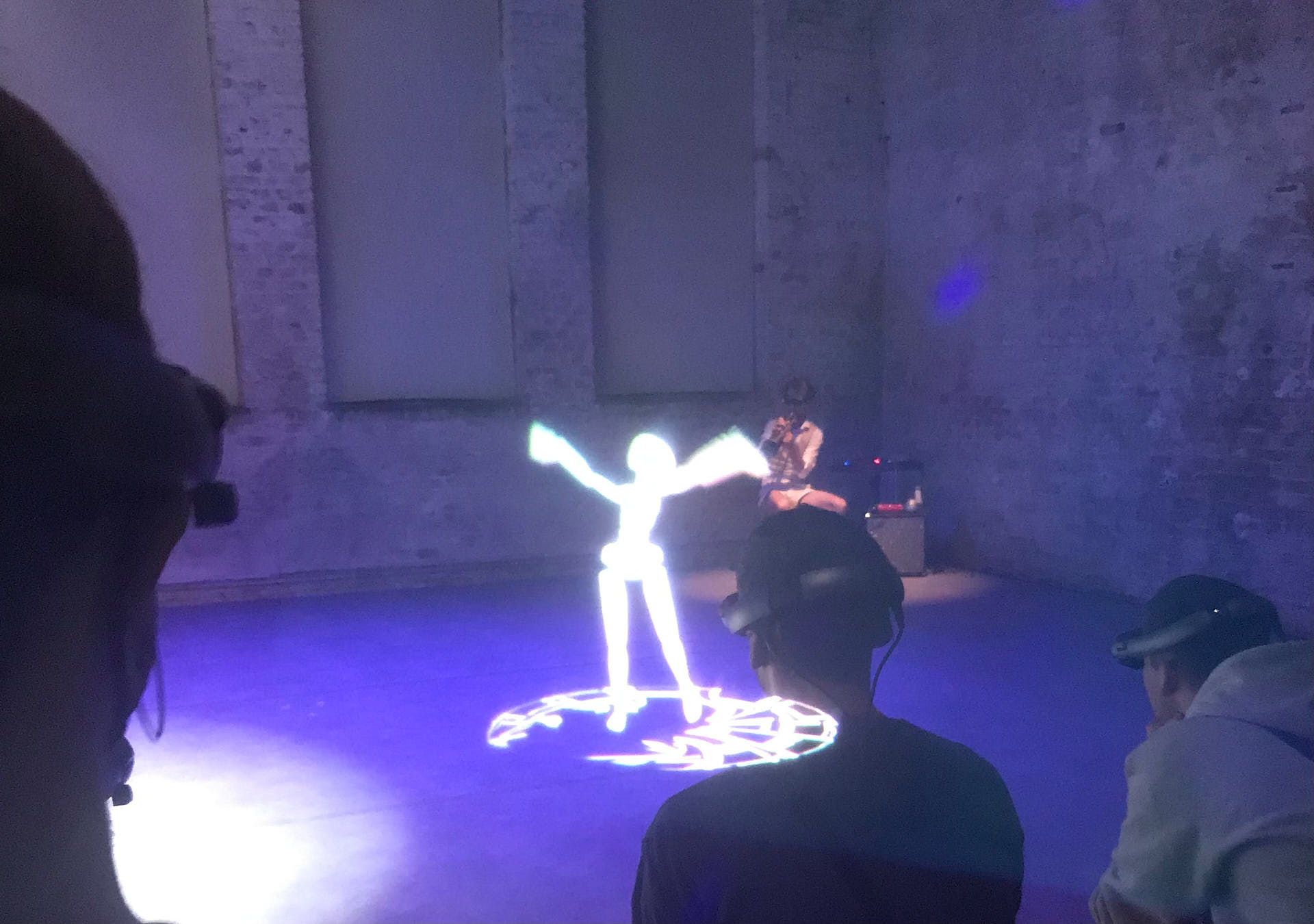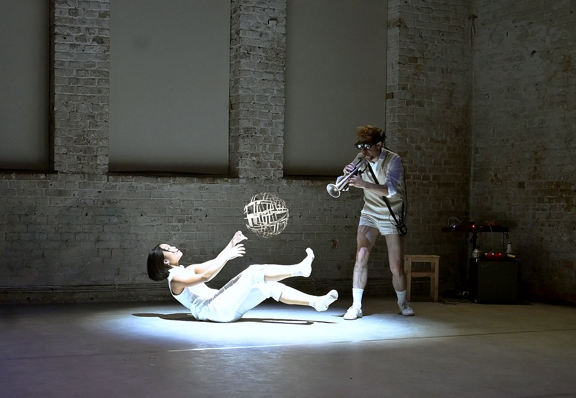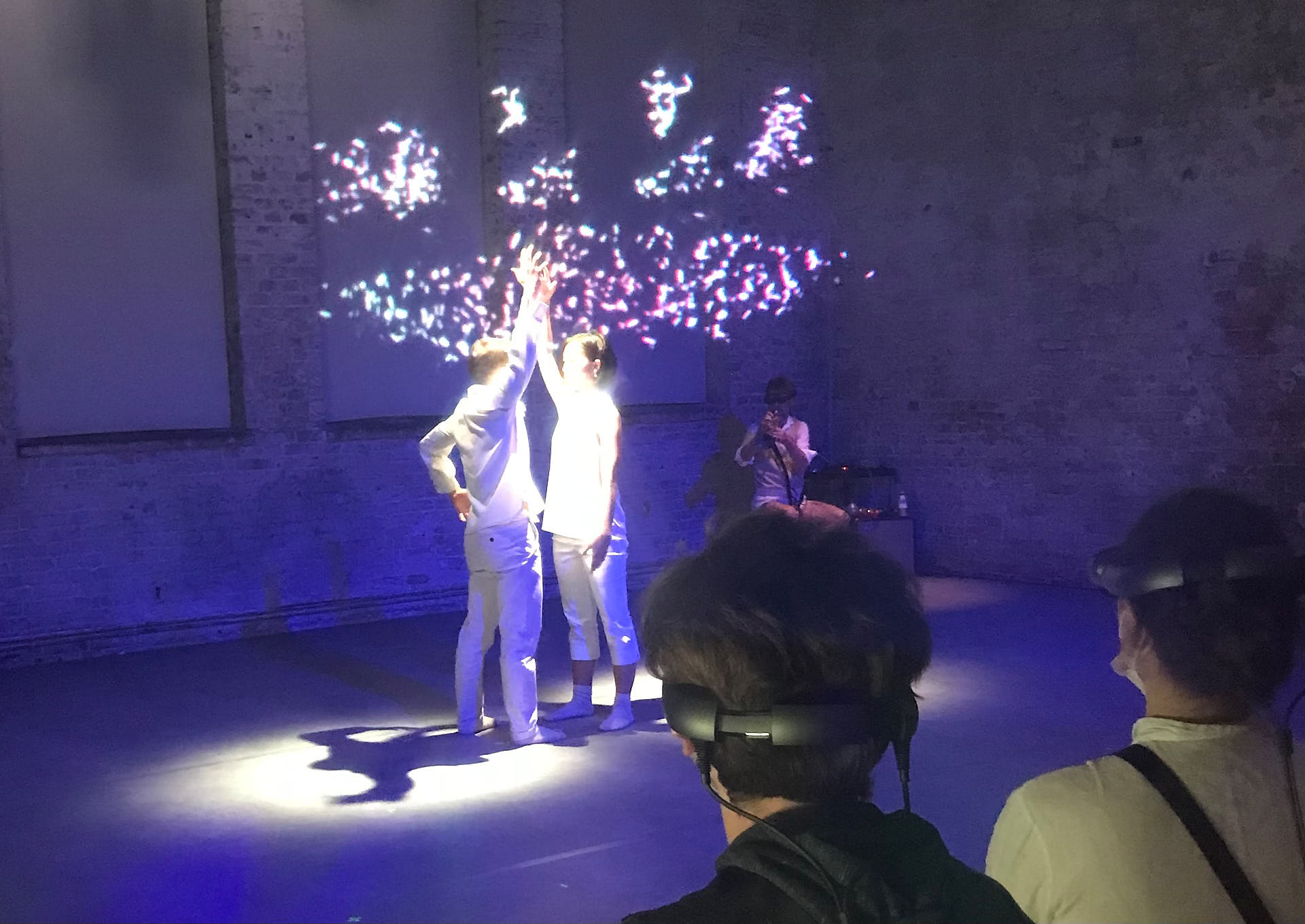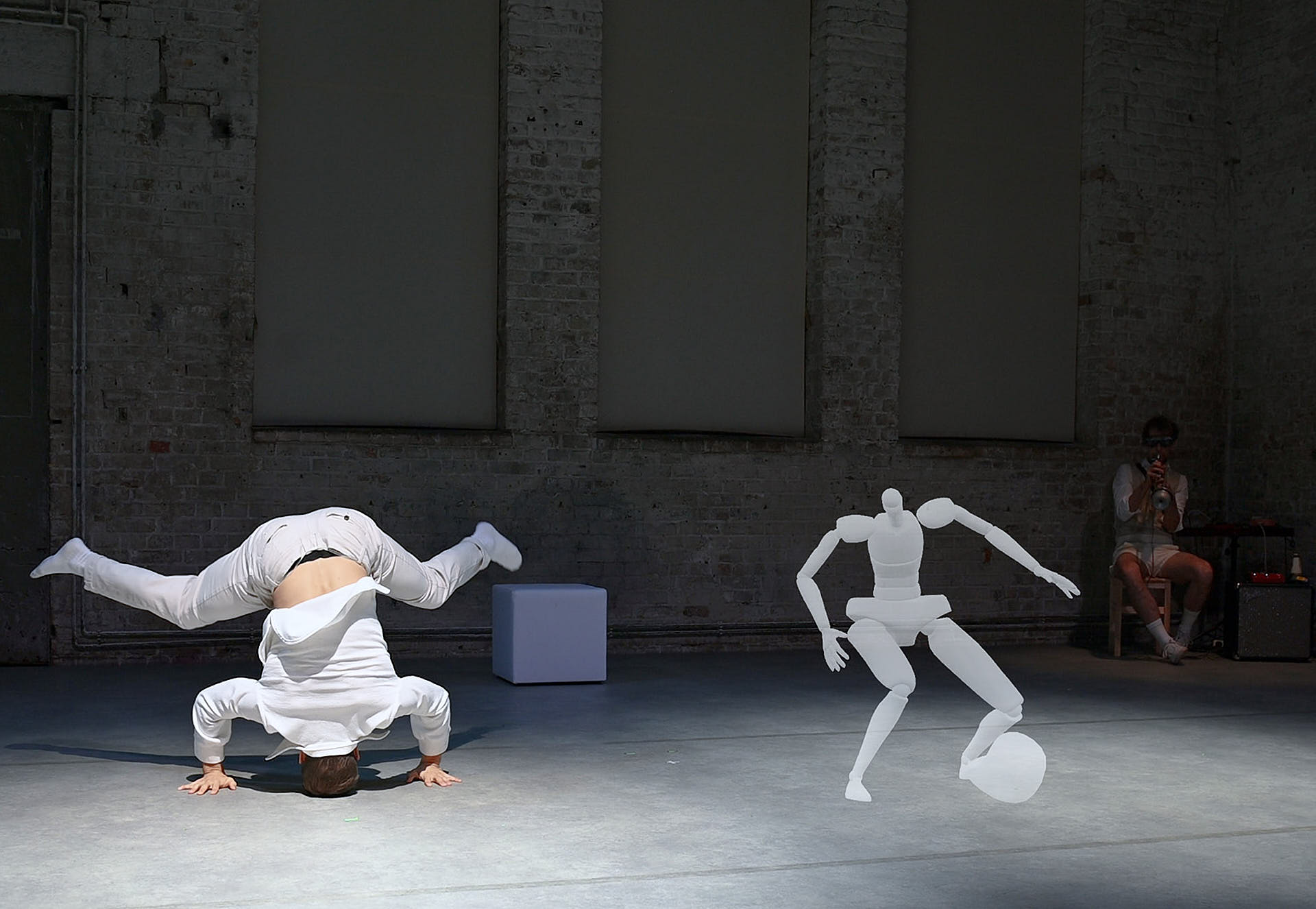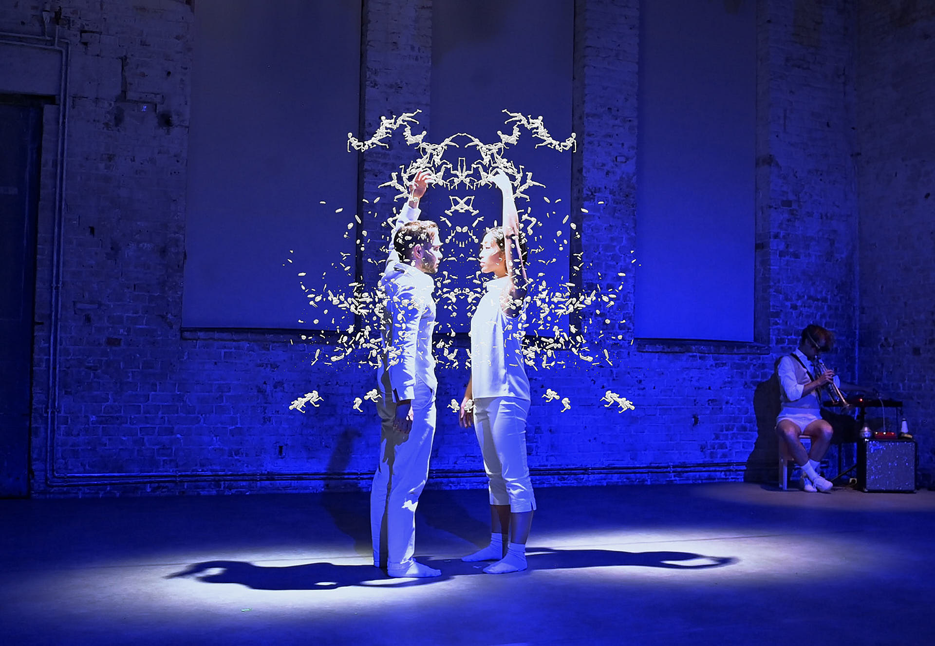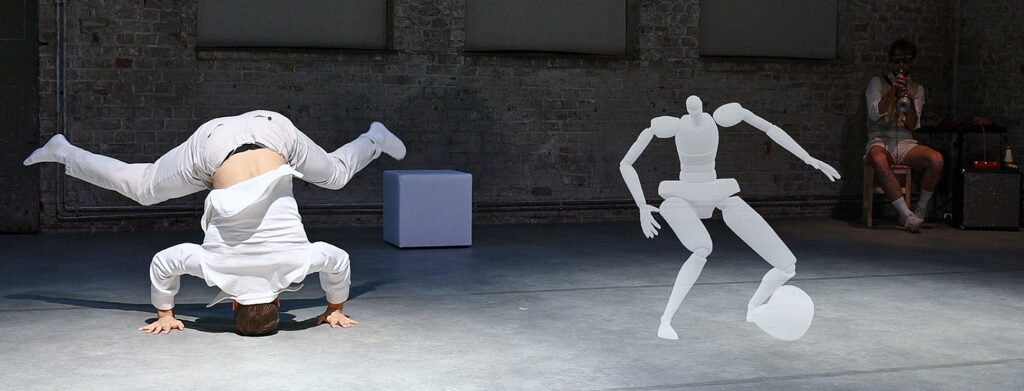The movement sequences of the two dancers, recorded by means of motion capture suits, are transferred to AR glasses. Comparable to a loop station for live musicians, the AR-Loopmachine enables the performers to enter into a dialogue with their own moves and to dance a duet with themselves. This apparent interaction between real body and artificially created image is accompanied by the sound surfaces of trumpeter Paul Hübner. The relation between analogue reality and virtual extension shifts with the audience’s selectable point of view, which can move freely in the space: real and virtual bodies multiply, change their size – the game begins.