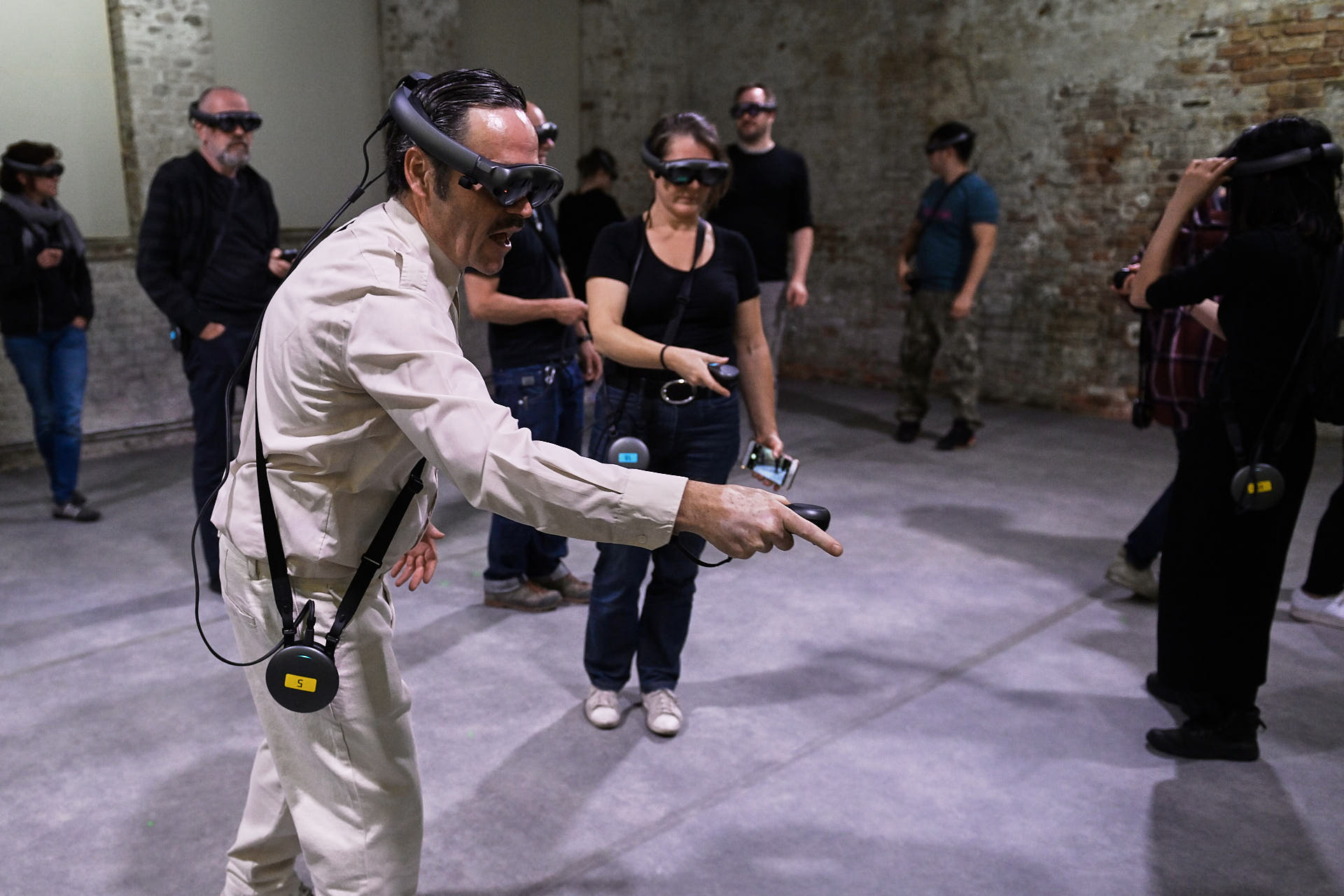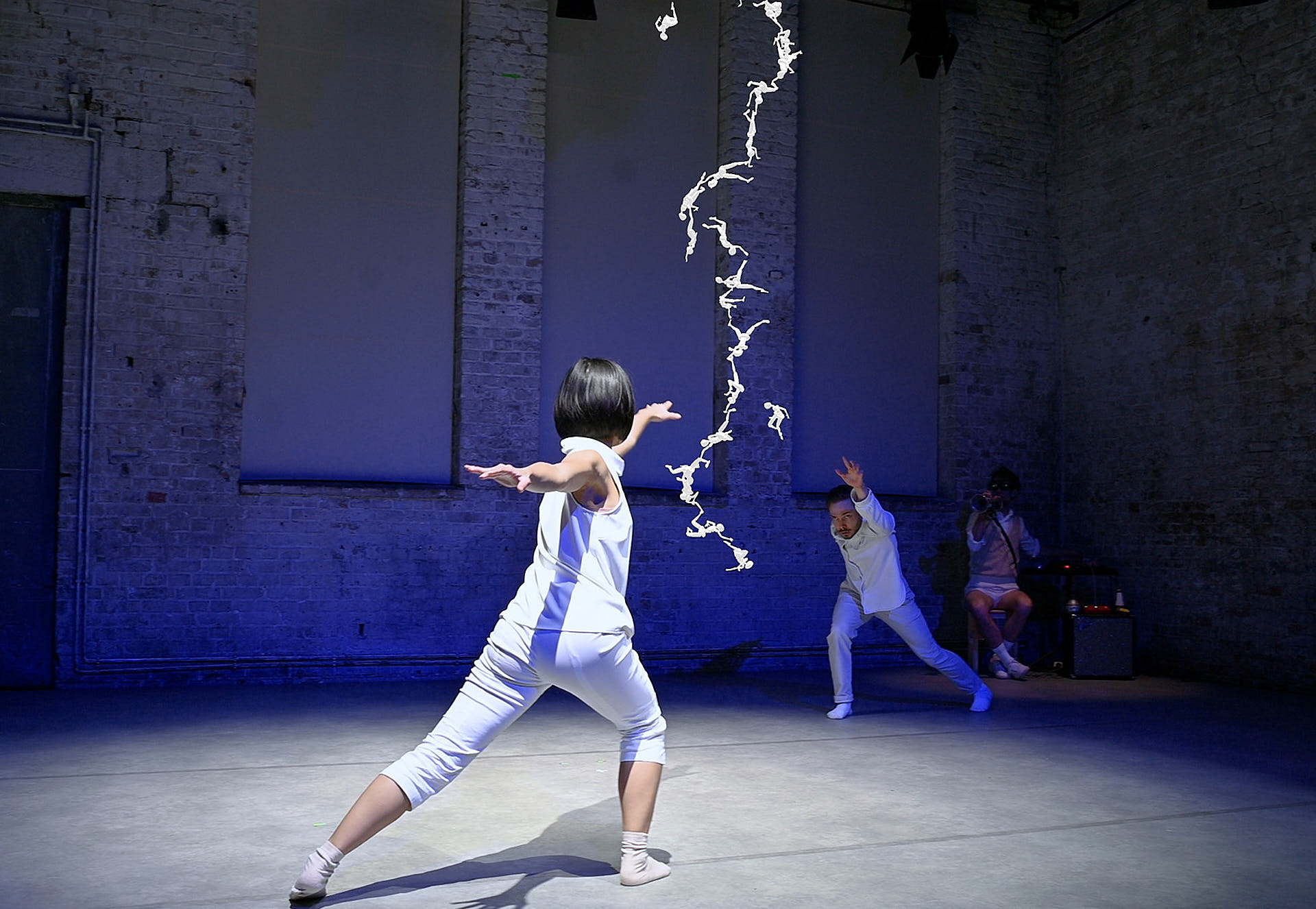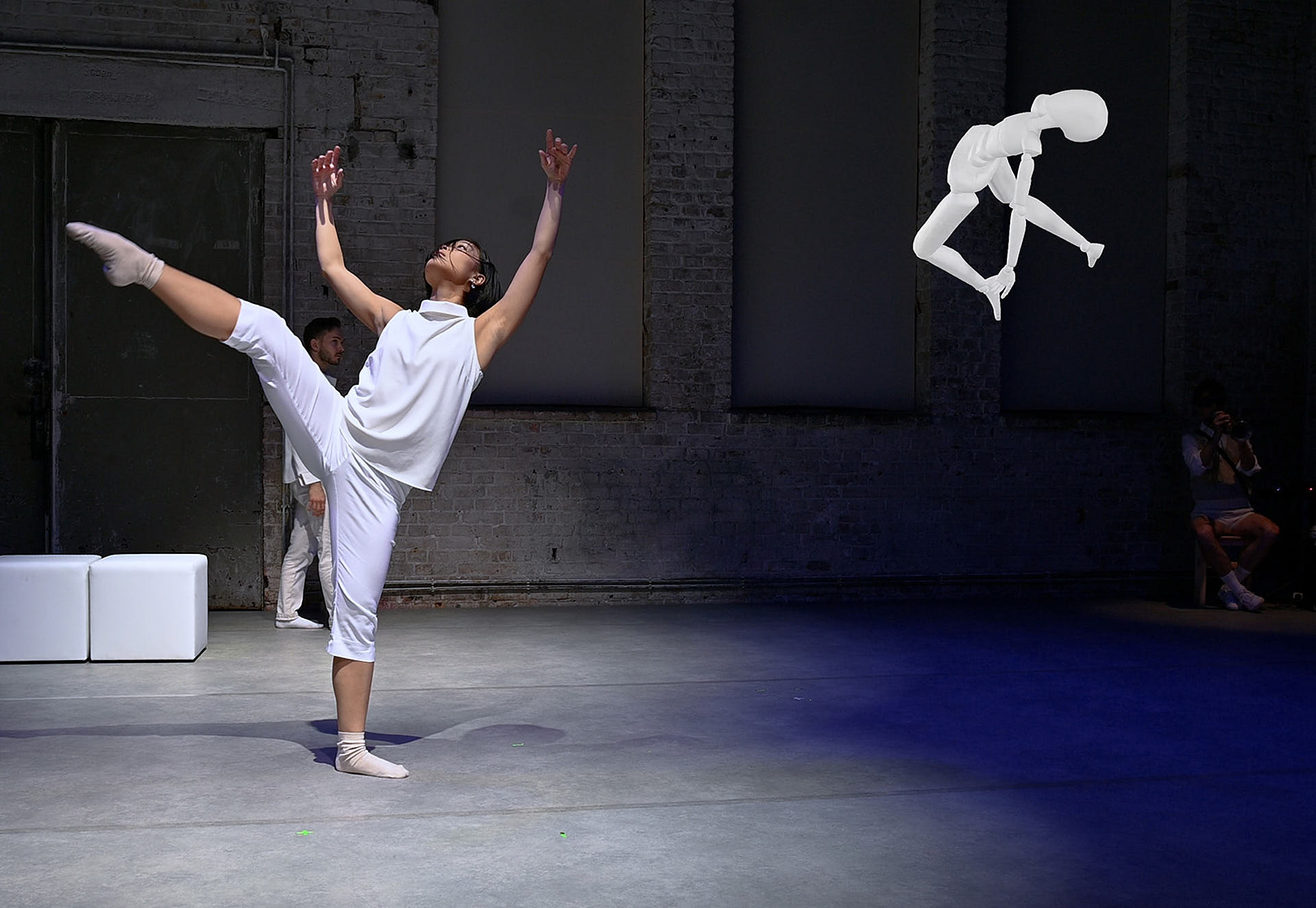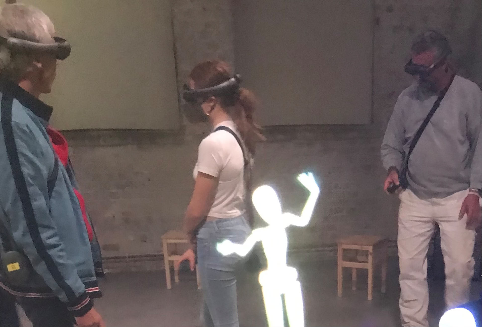 The movement sequences of the two dancers, recorded by means of motion capture suits, are transferred to AR glasses. Comparable to a loop station for live musicians, the AR-Loopmachine enables the performers to enter into a dialogue with their own moves and to dance a duet with themselves. This apparent interaction between real body and artificially created image is accompanied by the sound surfaces of trumpeter Paul Hübner. The relation between analogue reality and virtual extension shifts with the audience’s selectable point of view, which can move freely in the space: real and virtual bodies multiply, change their size – the game begins.