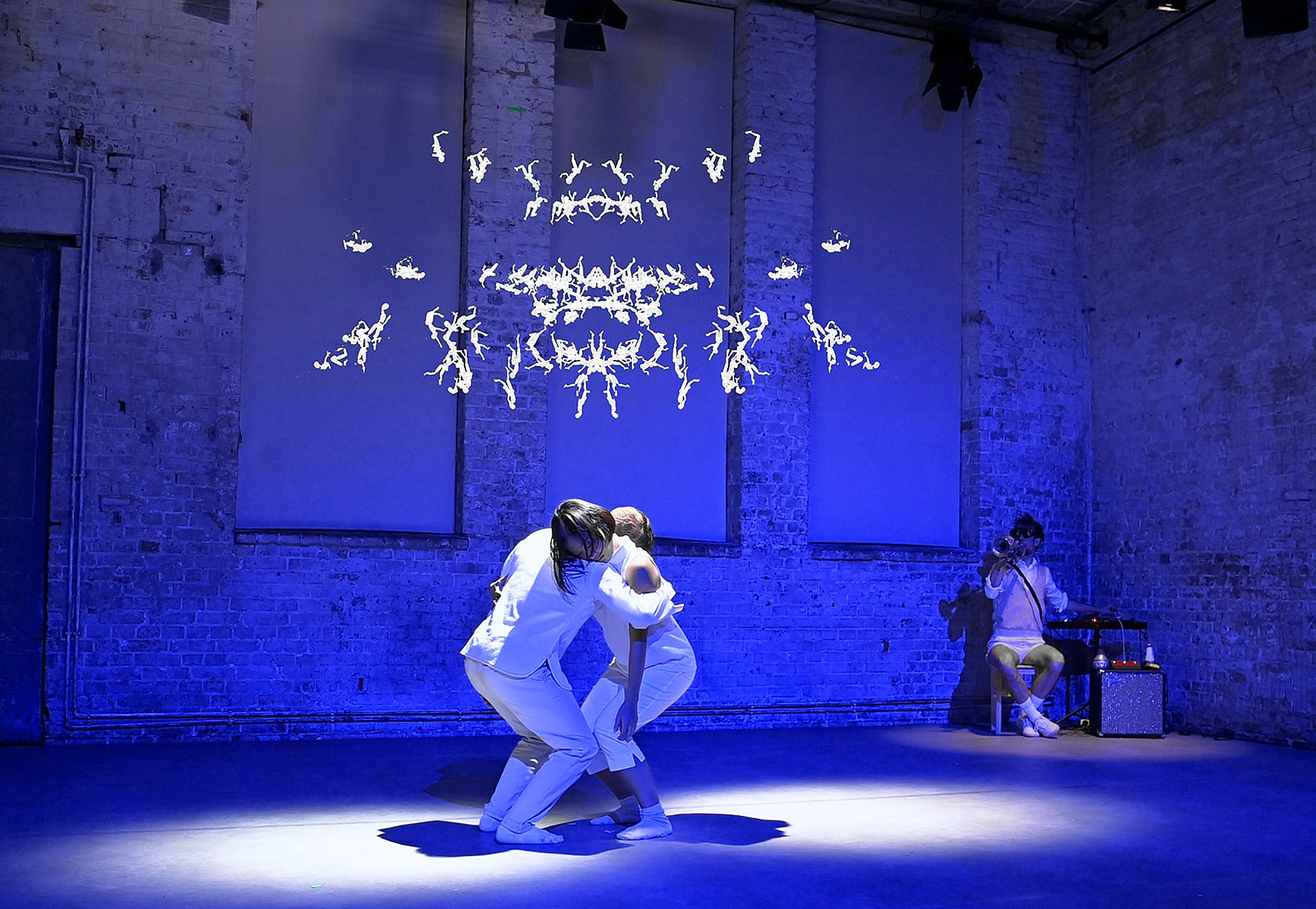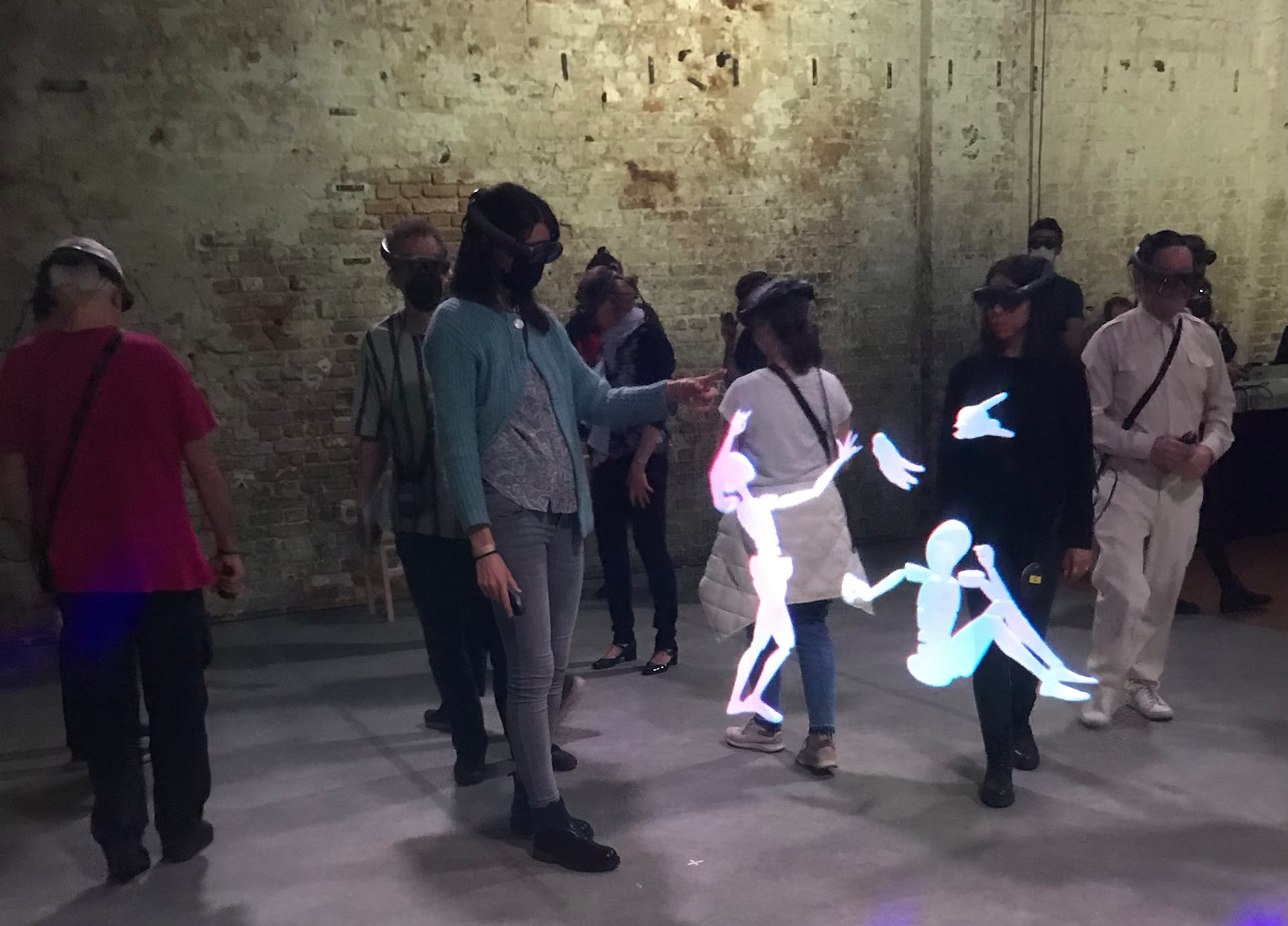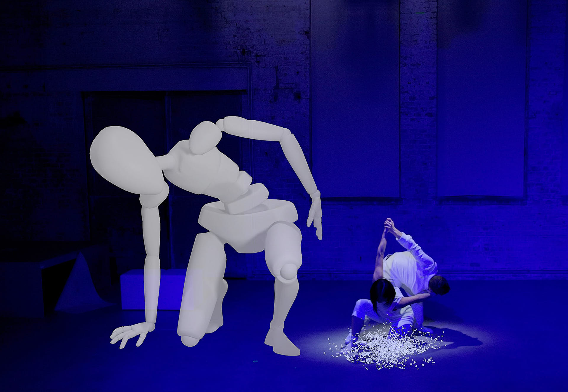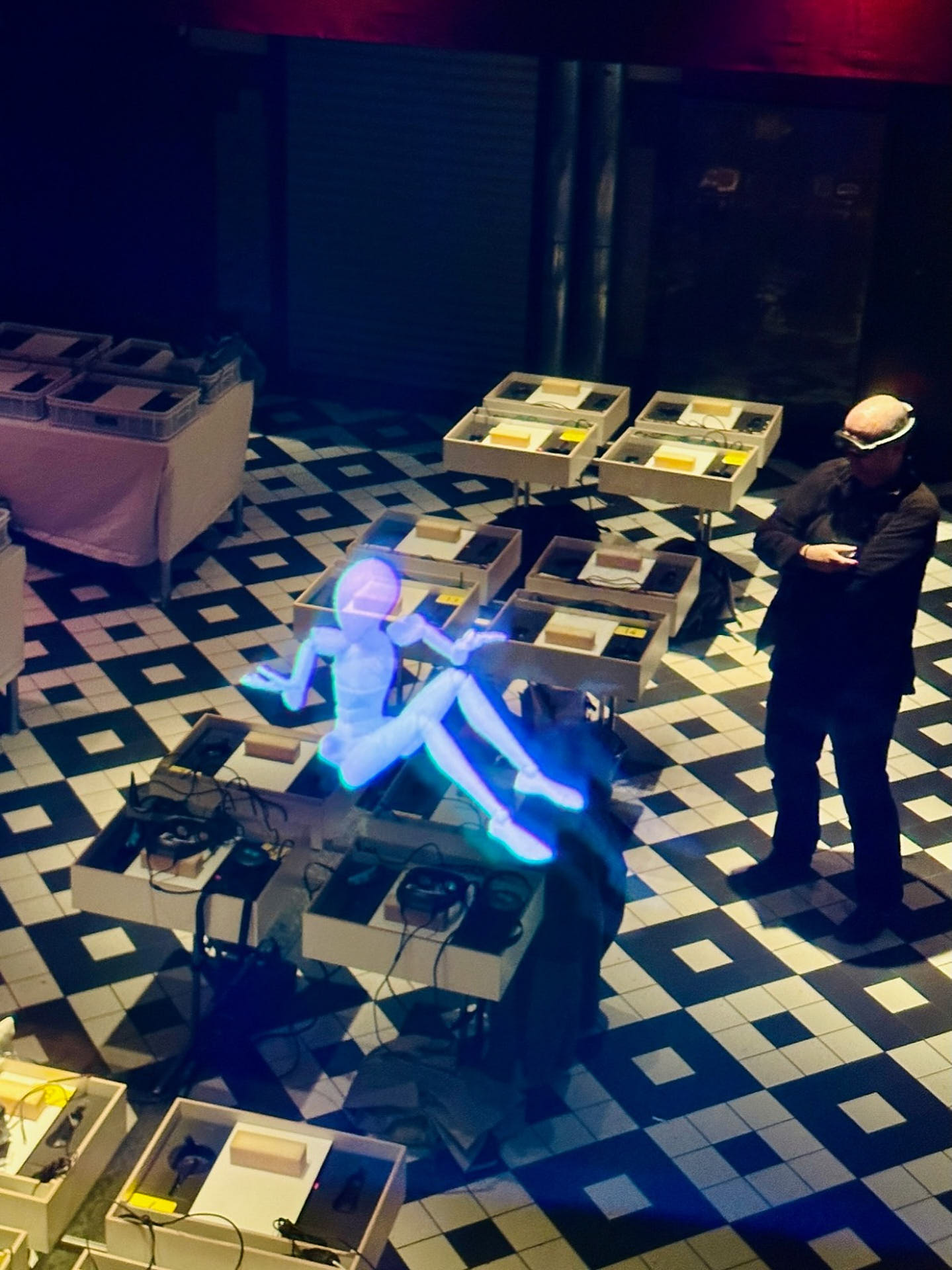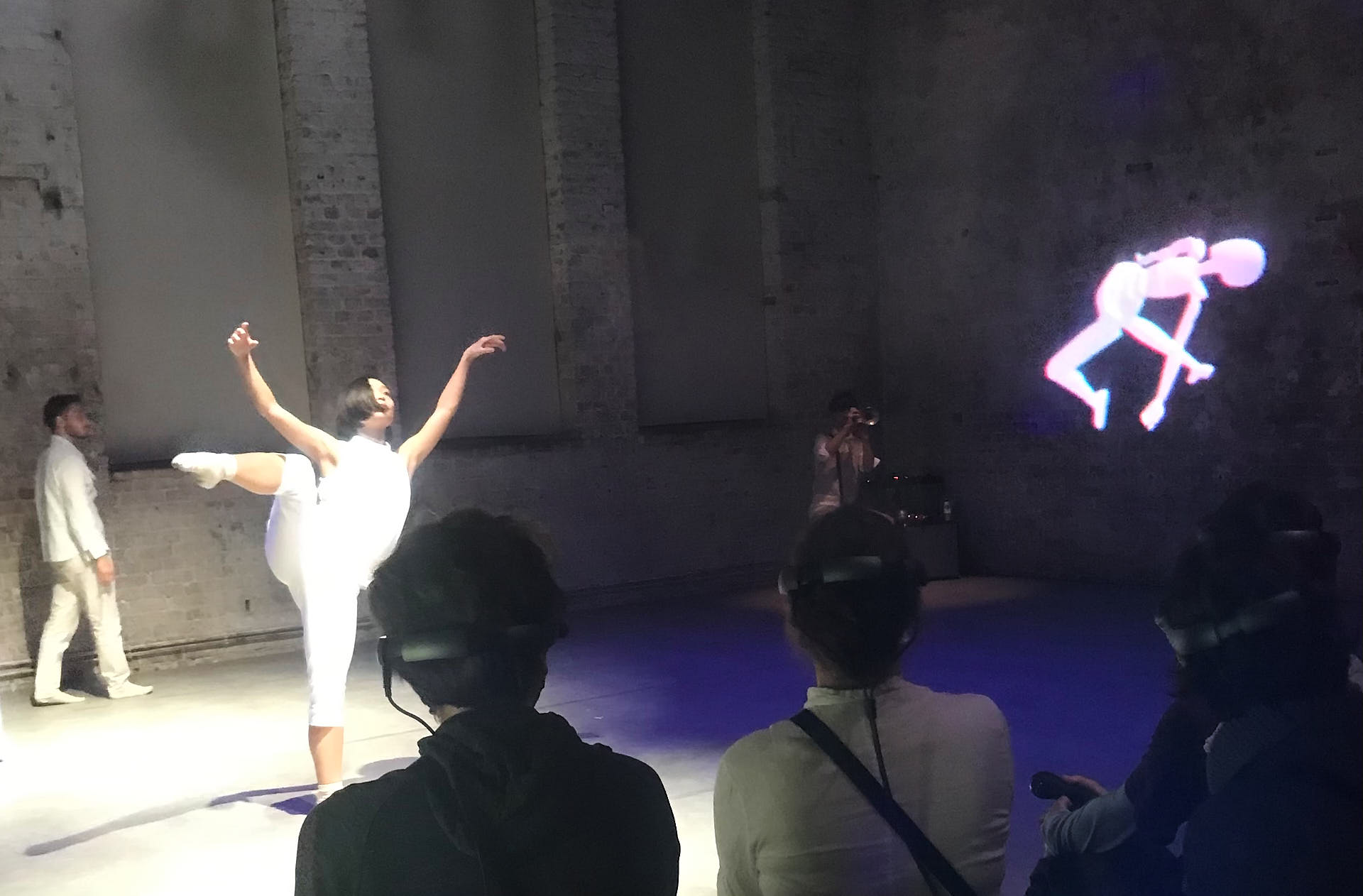 The movement sequences of the two dancers, recorded by means of motion capture suits, are transferred to AR glasses. Comparable to a loop station for live musicians, the AR-Loopmachine enables the performers to enter into a dialogue with their own moves and to dance a duet with themselves. This apparent interaction between real body and artificially created image is accompanied by the sound surfaces of trumpeter Paul Hübner. The relation between analogue reality and virtual extension shifts with the audience’s selectable point of view, which can move freely in the space: real and virtual bodies multiply, change their size – the game begins.