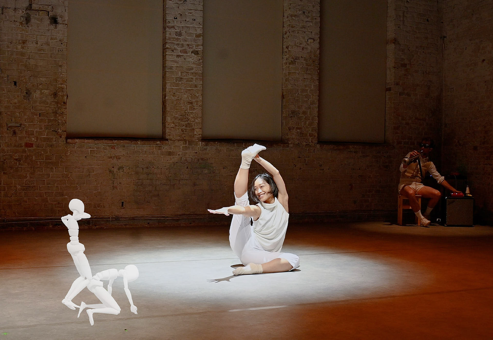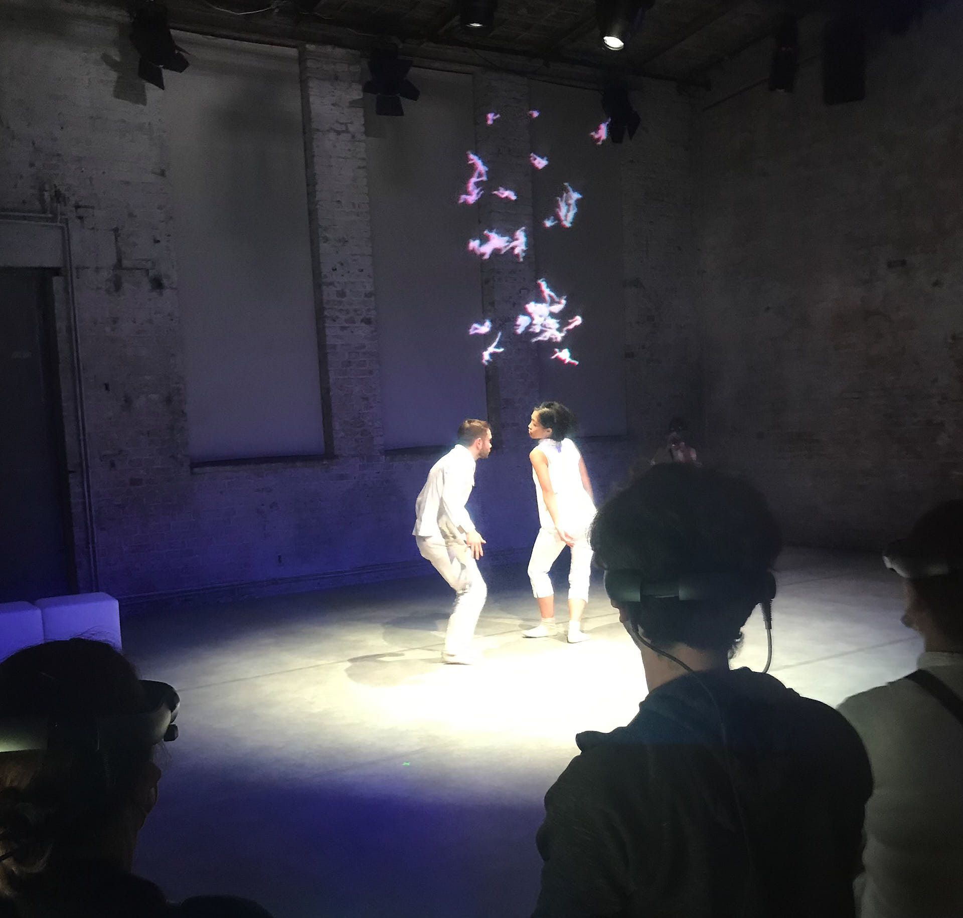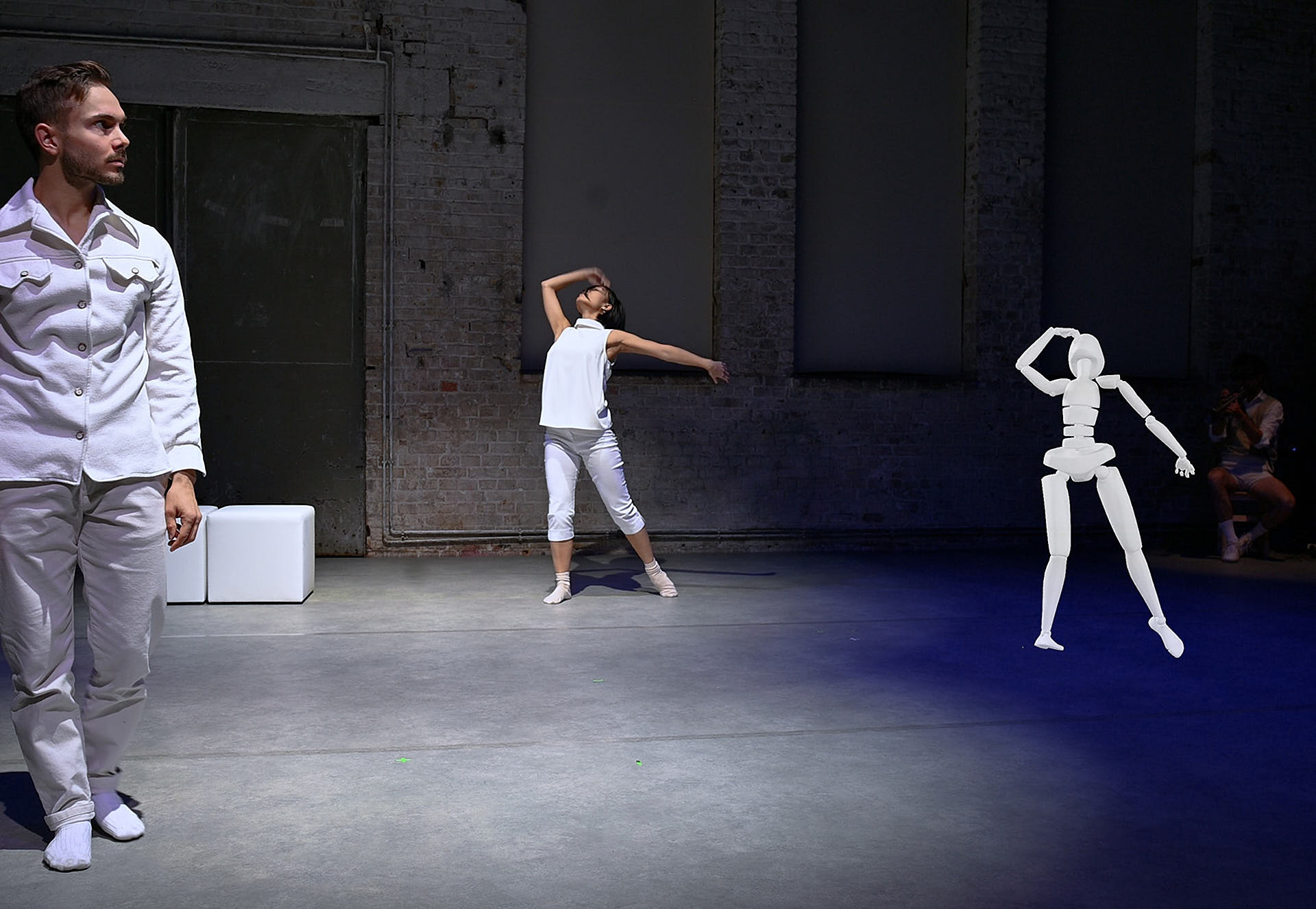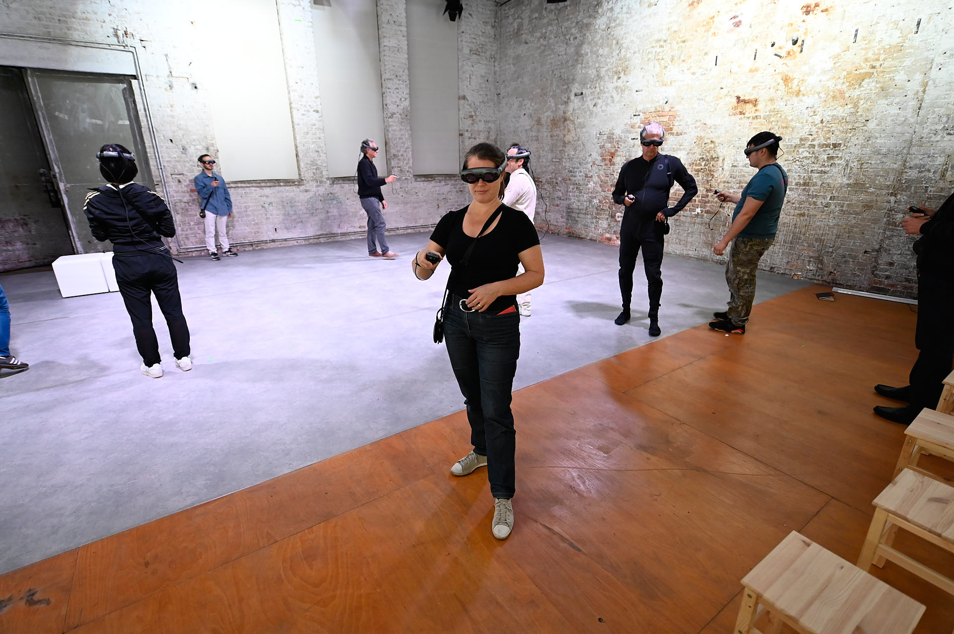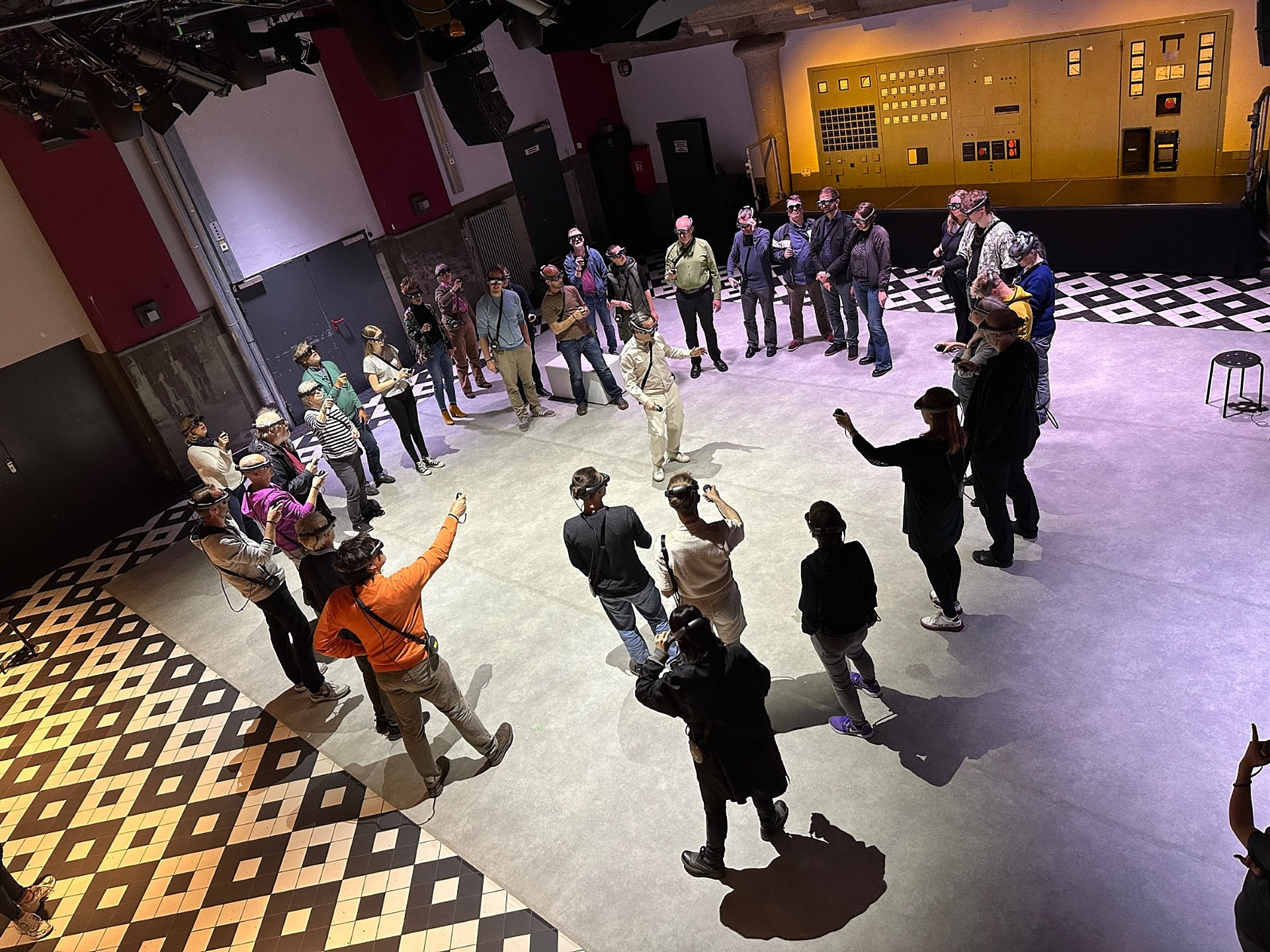 The movement sequences of the two dancers, recorded by means of motion capture suits, are transferred to AR glasses. Comparable to a loop station for live musicians, the AR-Loopmachine enables the performers to enter into a dialogue with their own moves and to dance a duet with themselves. This apparent interaction between real body and artificially created image is accompanied by the sound surfaces of trumpeter Paul Hübner. The relation between analogue reality and virtual extension shifts with the audience’s selectable point of view, which can move freely in the space: real and virtual bodies multiply, change their size – the game begins.