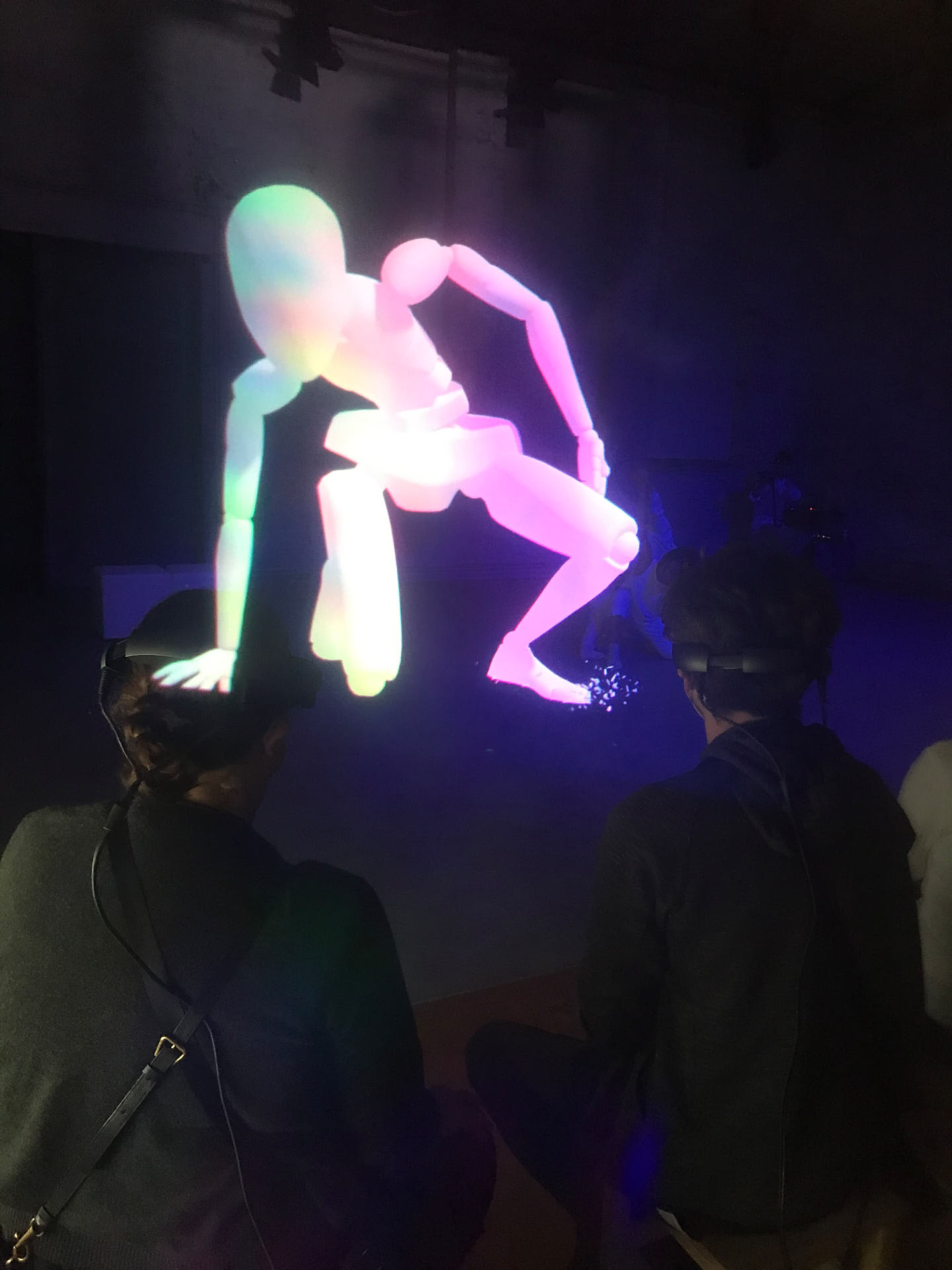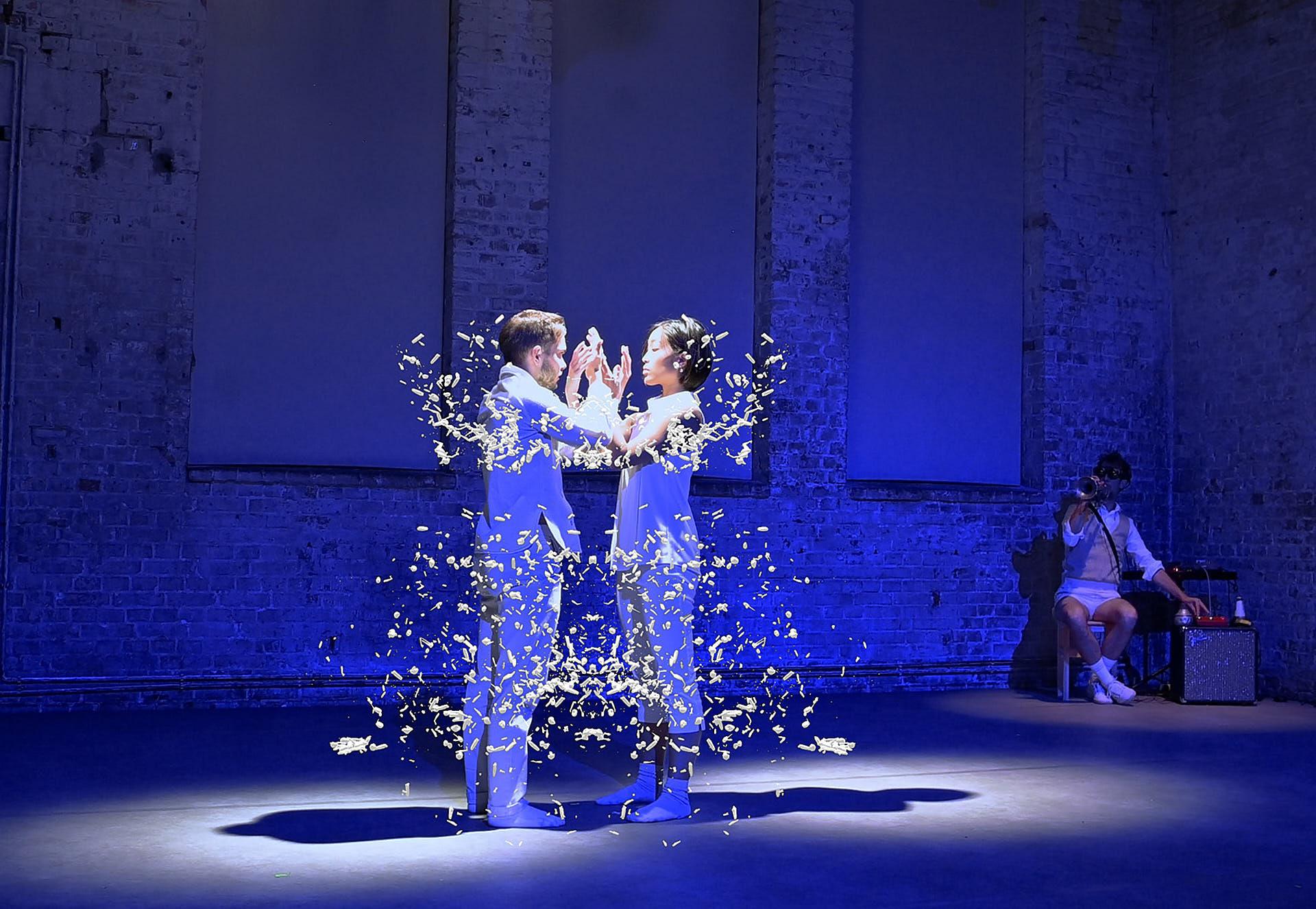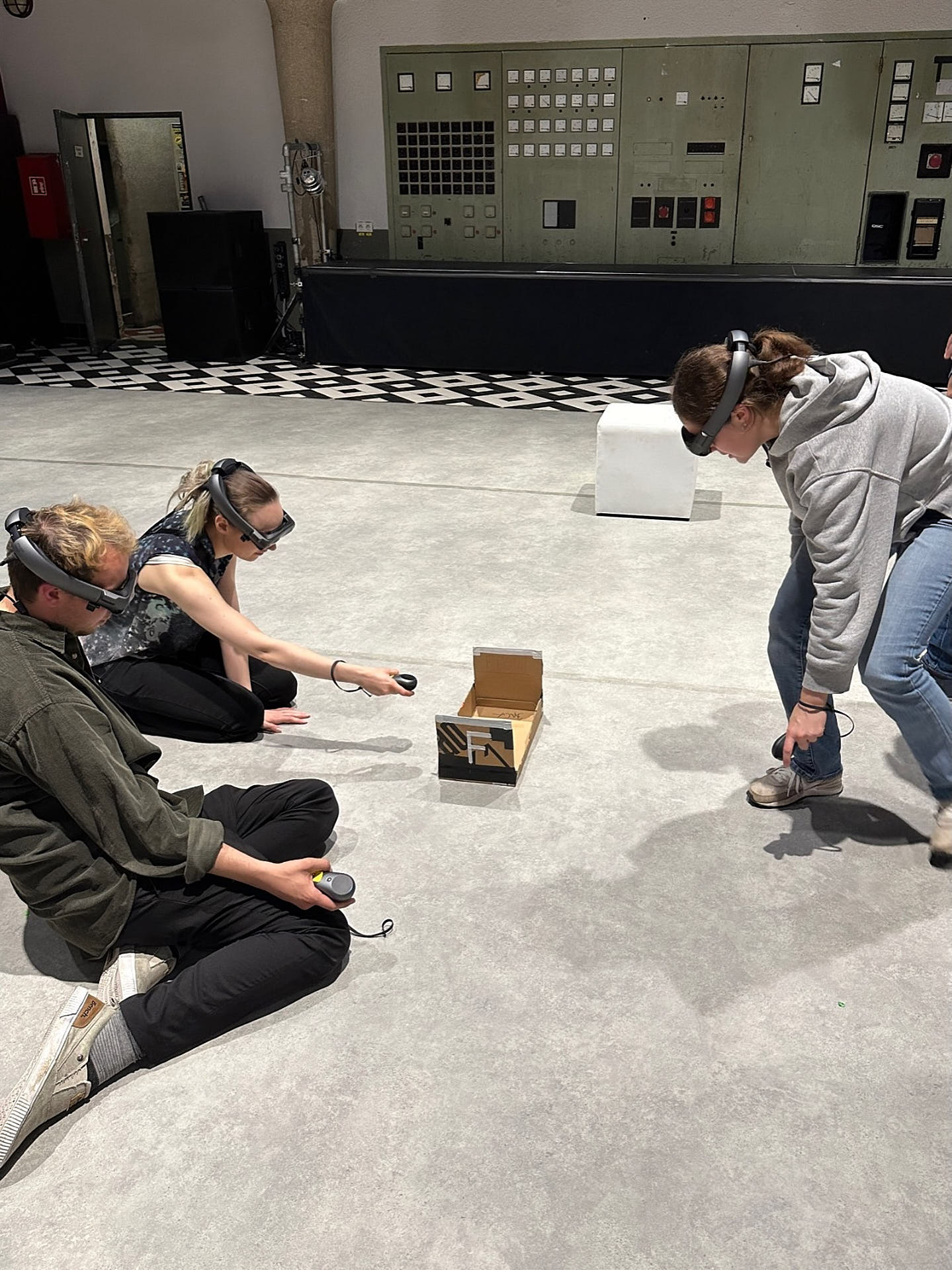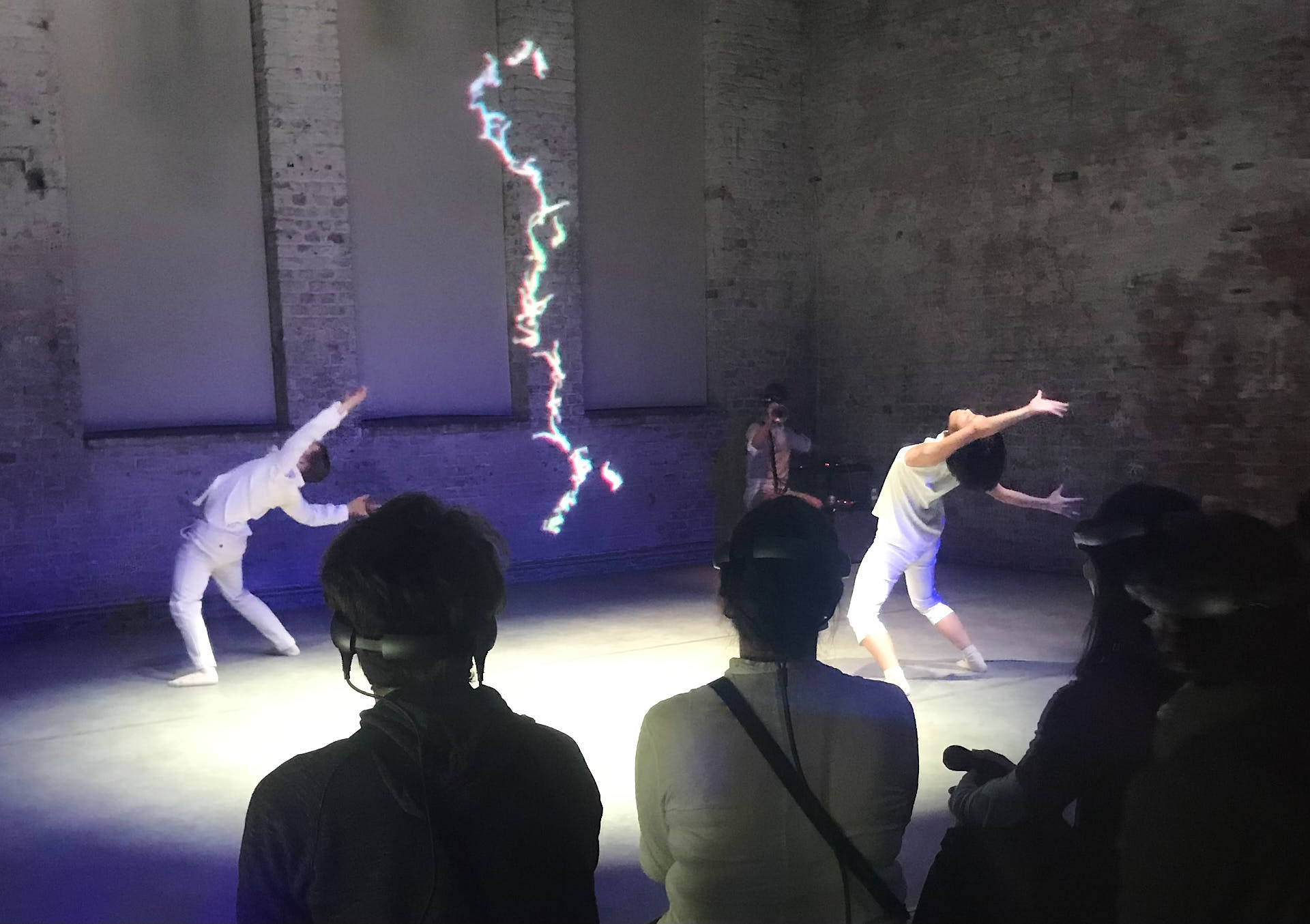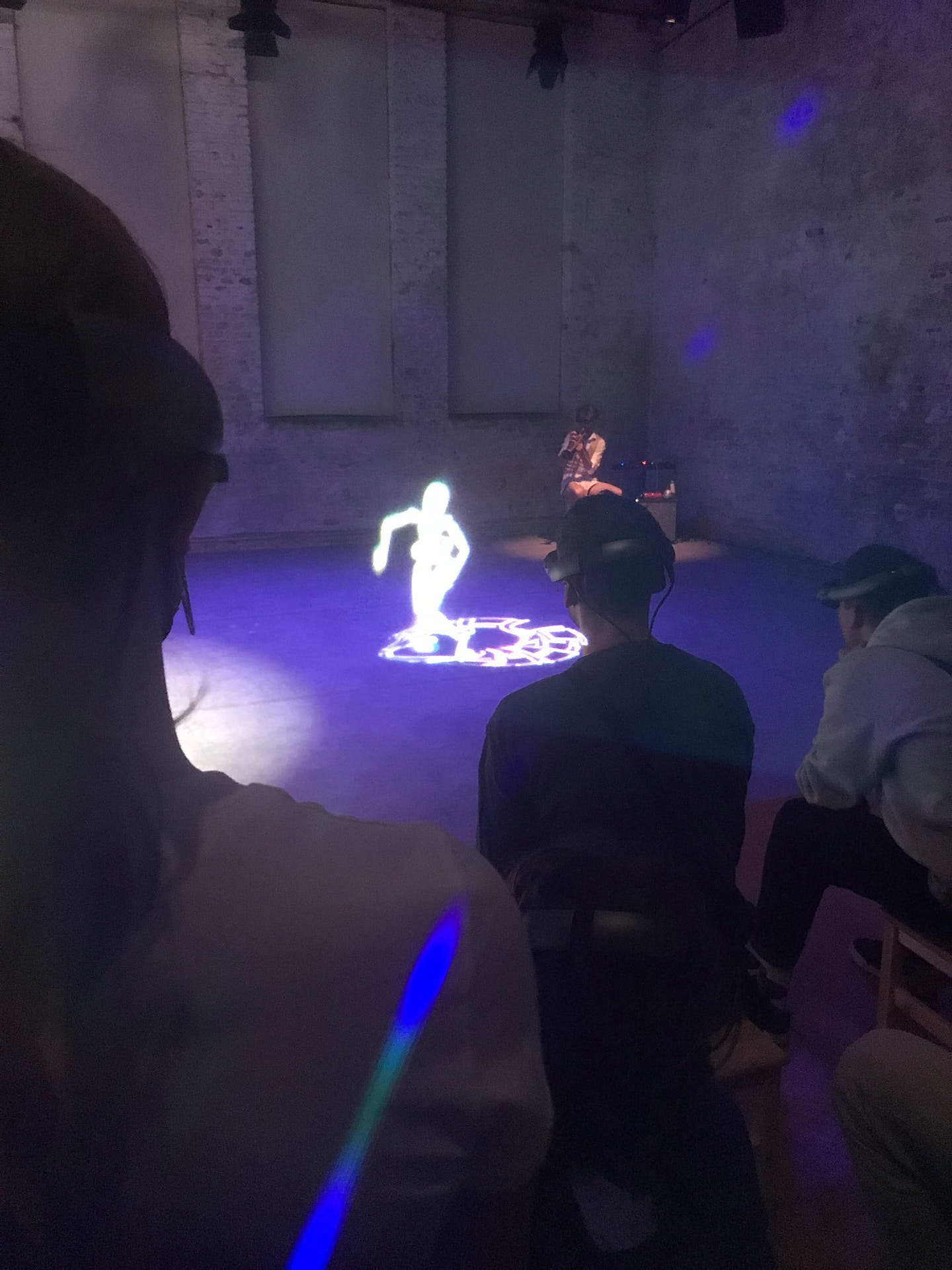 The movement sequences of the two dancers, recorded by means of motion capture suits, are transferred to AR glasses. Comparable to a loop station for live musicians, the AR-Loopmachine enables the performers to enter into a dialogue with their own moves and to dance a duet with themselves. This apparent interaction between real body and artificially created image is accompanied by the sound surfaces of trumpeter Paul Hübner. The relation between analogue reality and virtual extension shifts with the audience’s selectable point of view, which can move freely in the space: real and virtual bodies multiply, change their size – the game begins.