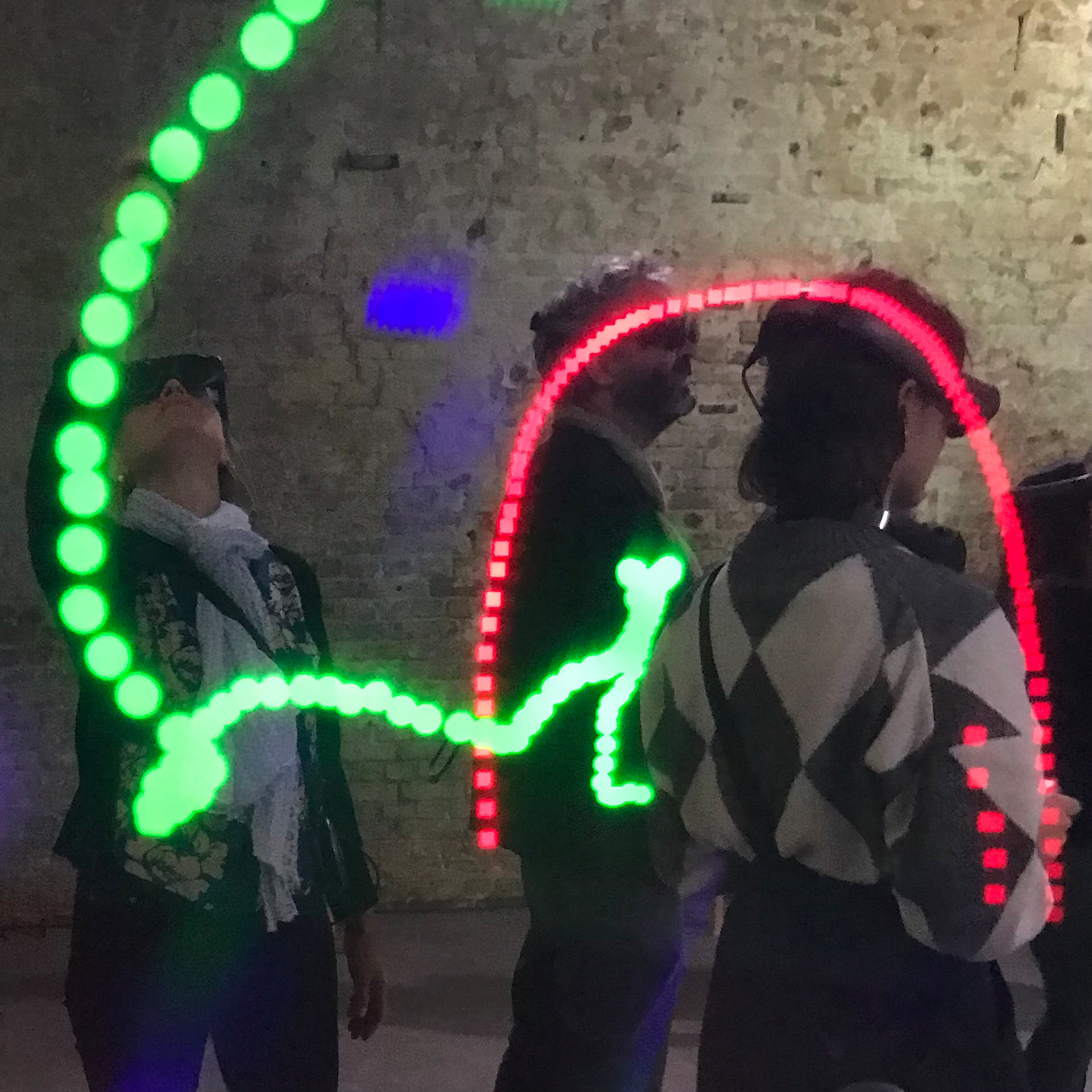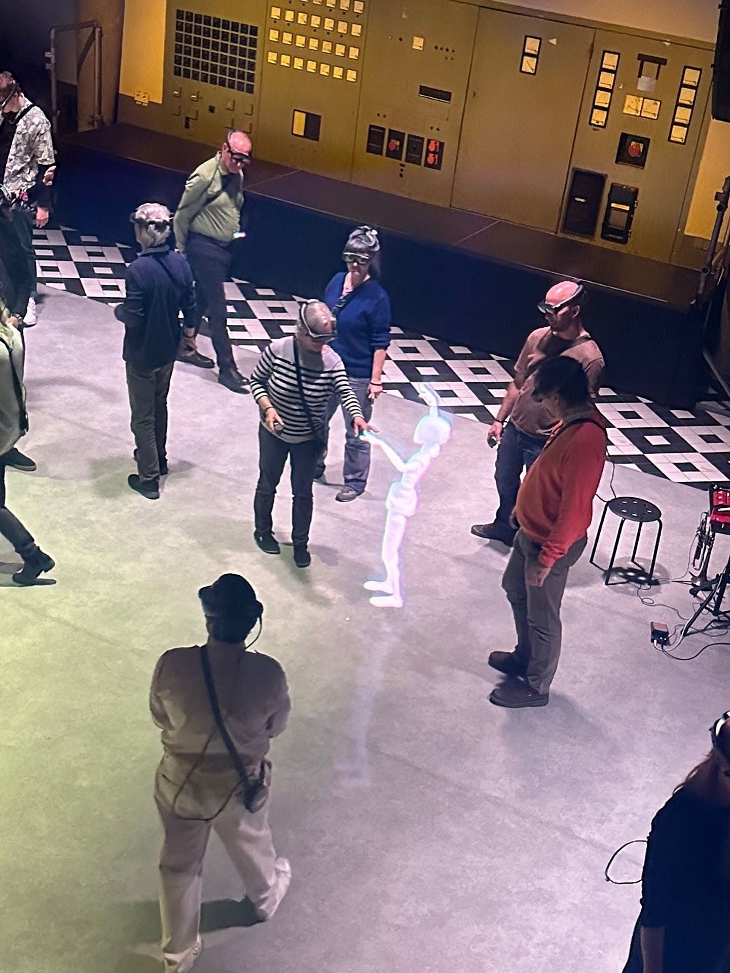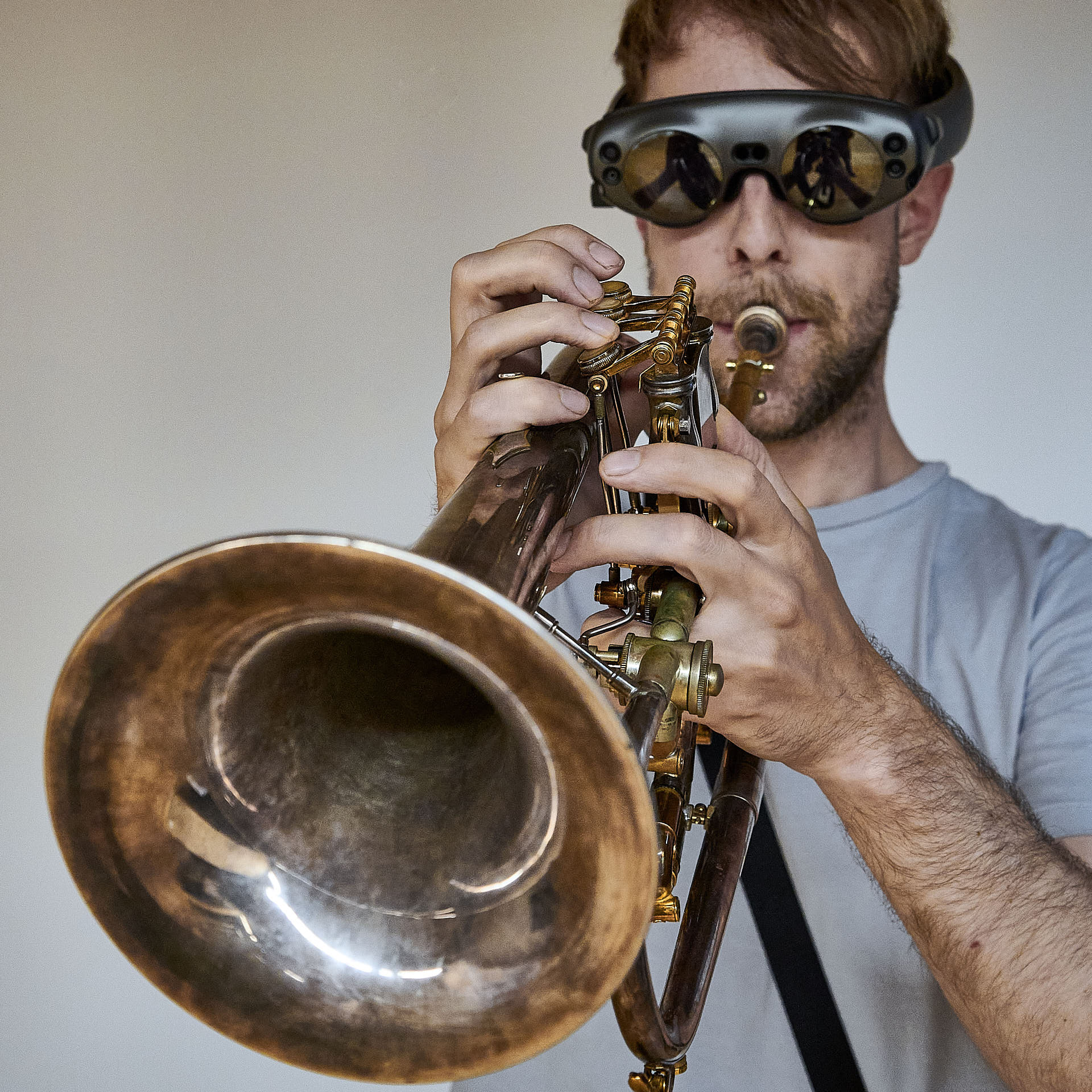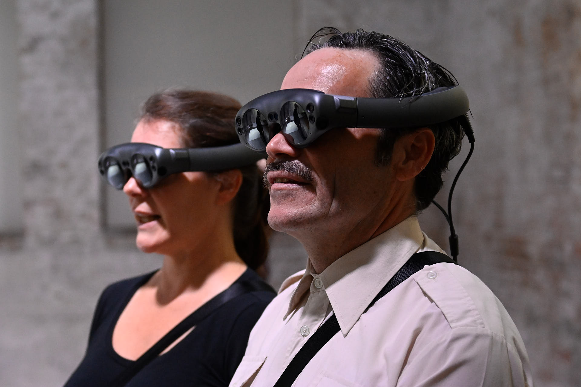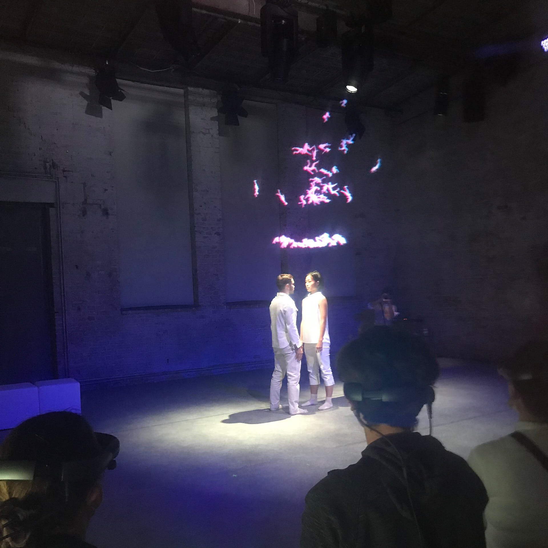 The movement sequences of the two dancers, recorded by means of motion capture suits, are transferred to AR glasses. Comparable to a loop station for live musicians, the AR-Loopmachine enables the performers to enter into a dialogue with their own moves and to dance a duet with themselves. This apparent interaction between real body and artificially created image is accompanied by the sound surfaces of trumpeter Paul Hübner. The relation between analogue reality and virtual extension shifts with the audience’s selectable point of view, which can move freely in the space: real and virtual bodies multiply, change their size – the game begins.