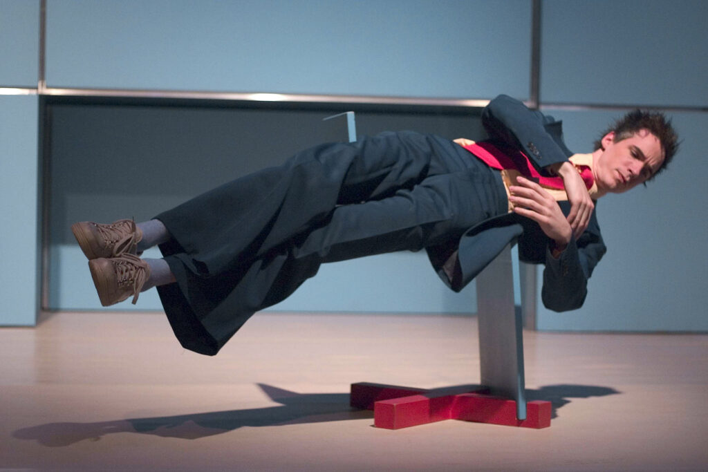 How does the image of work change in a time when one sees not the world but only its atlas? Where does the alienation from things begin when money has long become the actual commodity? And how does one endure the humiliation when, instead of the overdue and firmly agreed conversation with the enigmatic Mr. Fock, one only hears more postponements on hold? In the second part of “Human Images,” Nico and the Navigators inquire about the disruptions in the modern working world, where careers seem as fragile and vulnerable as the biographies behind them. Through life stories like “Peter from Dessau” and “Hanno from Hanover,” they sketch melancholic portraits of the “intern generation,” who in Proske’s multifunctional kiosk are visually fragmented into upper and lower bodies time and again. The furniture of the production consists almost exclusively of chairs missing their back legs, so they cannot stand on their own, even though they could easily be combined into benches and tables. With this eloquent accessory, the Navigators are not only sitting at, but literally over the abyss. They display the stoic smile of salesmen or build up and release the pressure to succeed through nervous tics and absurd loops. At the turn of the millennium, Nicola Hümpel demonstrates with her ensemble the physical transgressions dependency leads to in a society where sheets of paper can snap like whiplashes and machines have taken over – and where a naked man is questioned about his special skills in a job interview, while on his belly, in large letters, his true longing is tattooed: “When will I become a father?” This is Patric Schott, that Navigator who still shapes the face of the ensemble today.