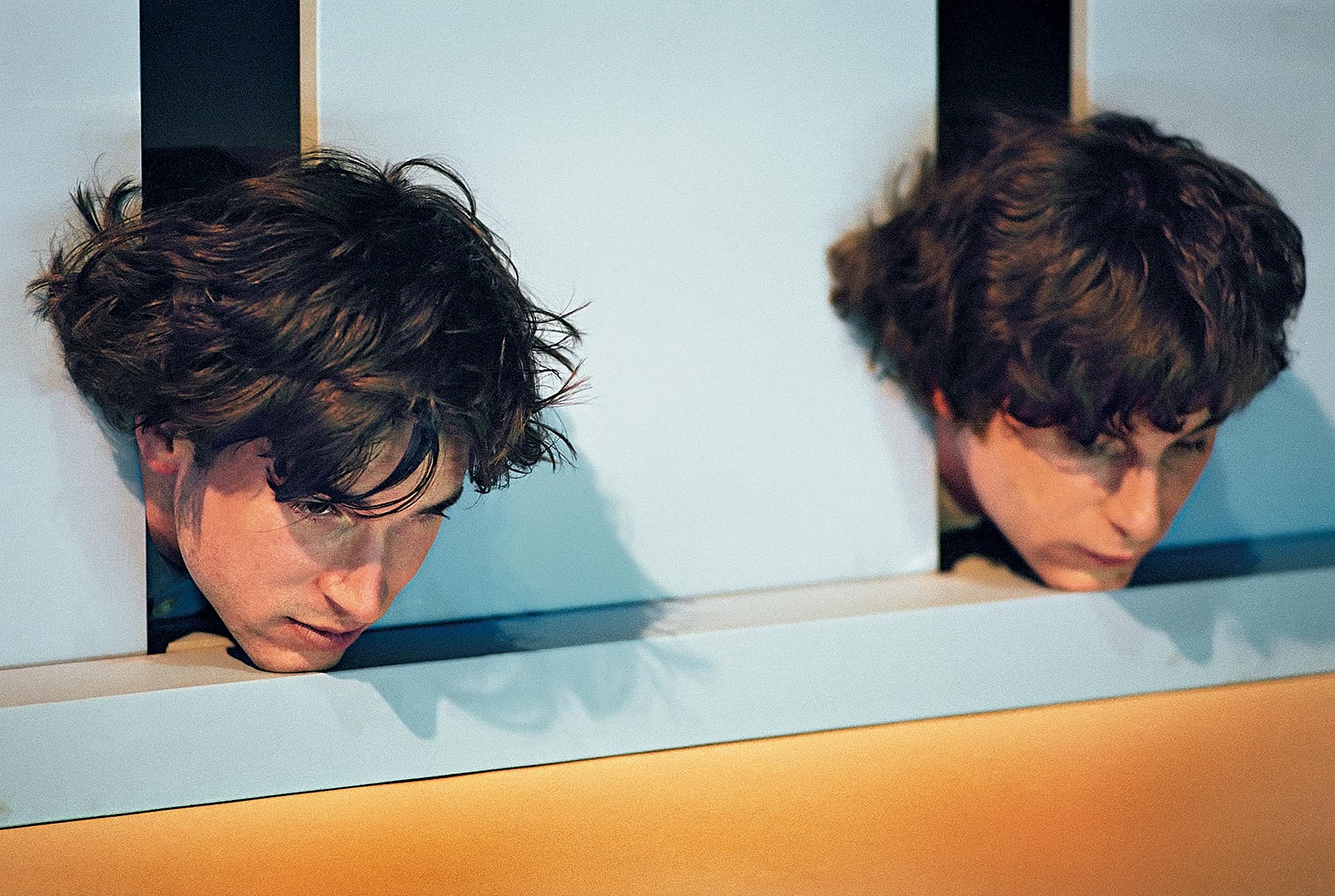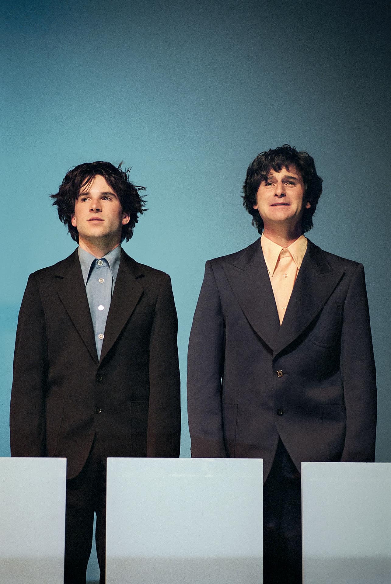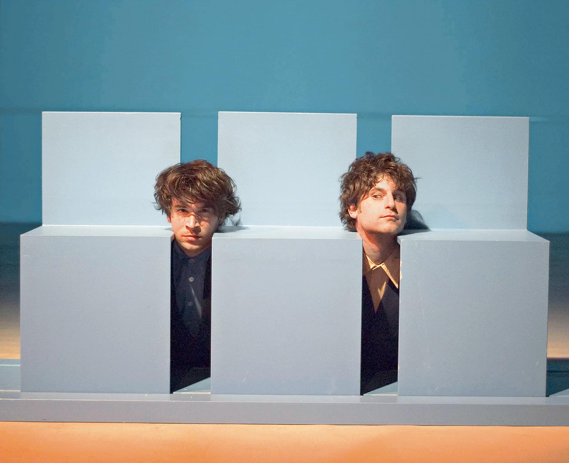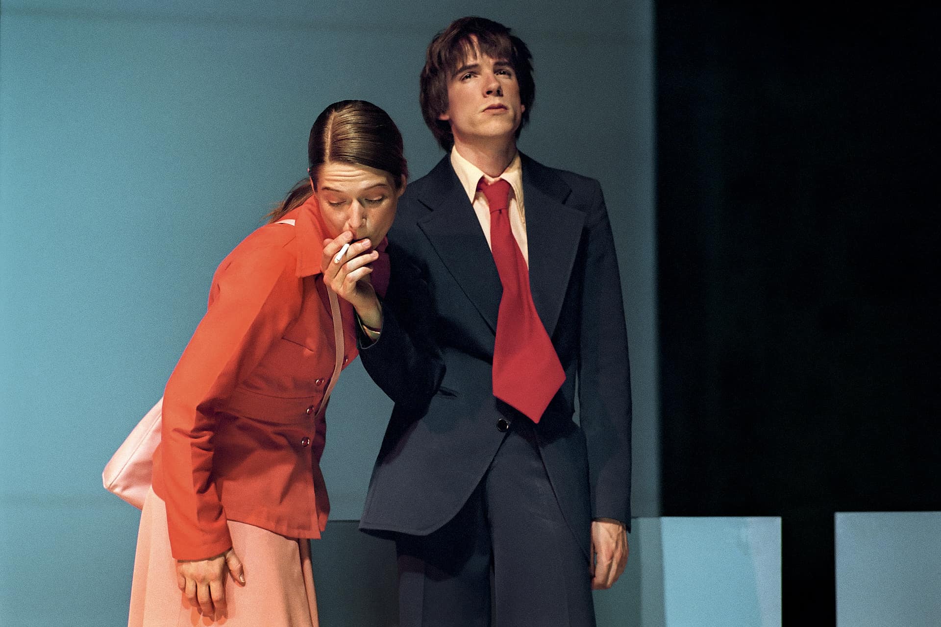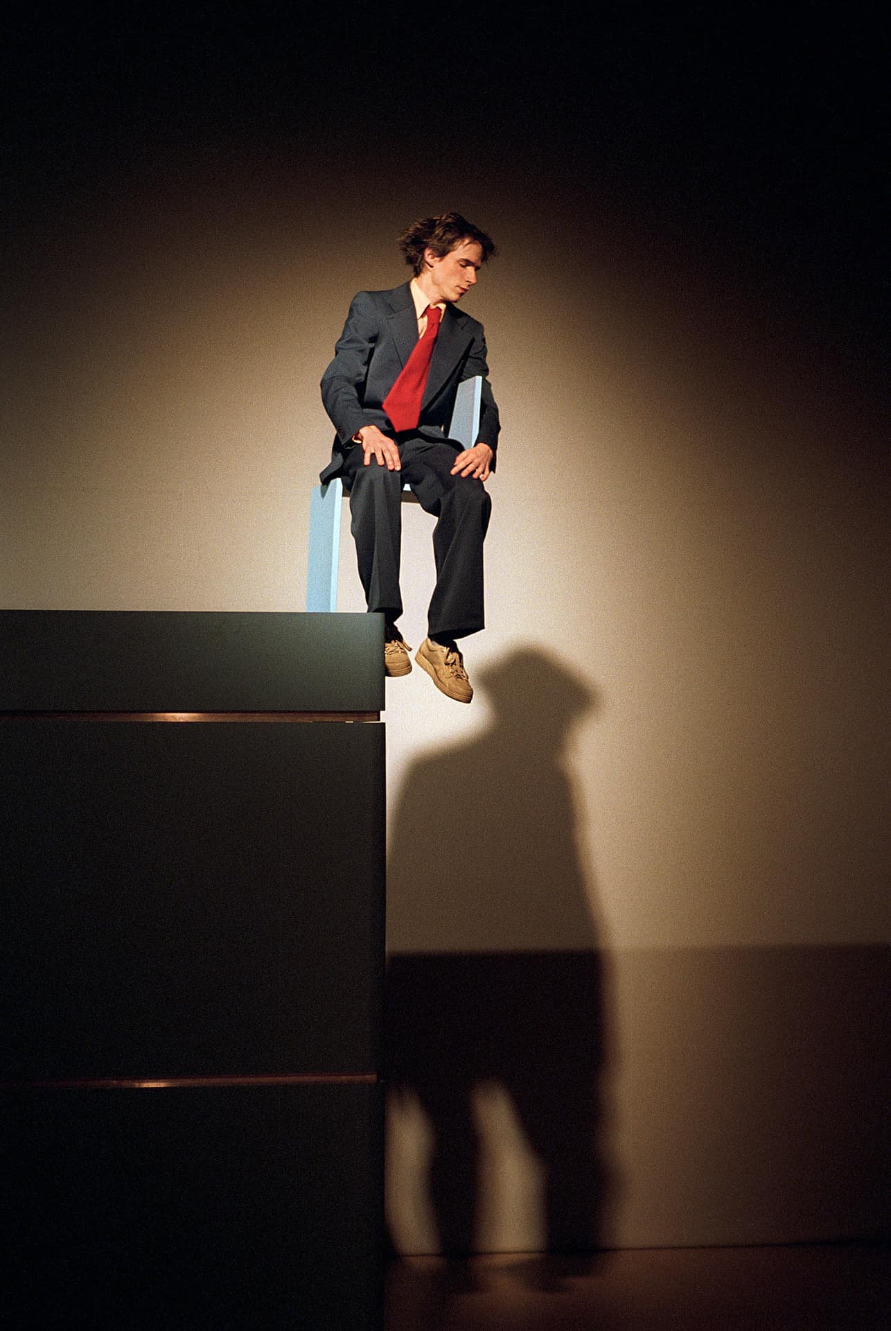 …Ist es zu spät, um früh anzufangen?“ Ratlos fragt sich das ein junger Mann… Wie auf rohen Eiern bewegen sich die Darsteller, auf und vor einer himmelblauen Multifunktionsbox (Bühnenbild: Oliver Proske). Businessanzüge, verkrampftes Grinsen, korrektes Benehmen – der langsame Eiertanz zu leiser Musik verrutscht immer wieder ins Groteske und in die (Körper-) Schräglage…
