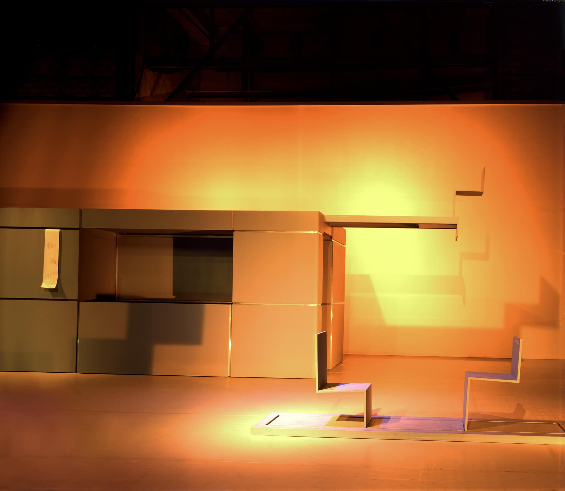 …Ehe sie eintreten in die fabelhafte Business-Welt, müssen erst einmal die Turnschuhe blank gewienert werden, denn irgendwo über ihren Köpfen regiert Mr. Fock, der nebulöse, unerreichbare Boss… In einem himmelblauen Kubus, einer multifunktionalen Überraschungsbox, kämpfen die Büro-Clowns mit der Heimtücke der Möbel, zeigt Regisseurin Nicola Hümpel in surrealen Spiegelungen die Alltagsrituale der Anpassung, Demütigung, Deformation, das albtraumgruselige Spiel der Wiederholungen…