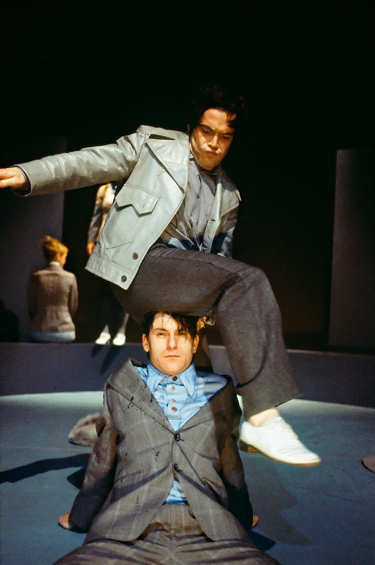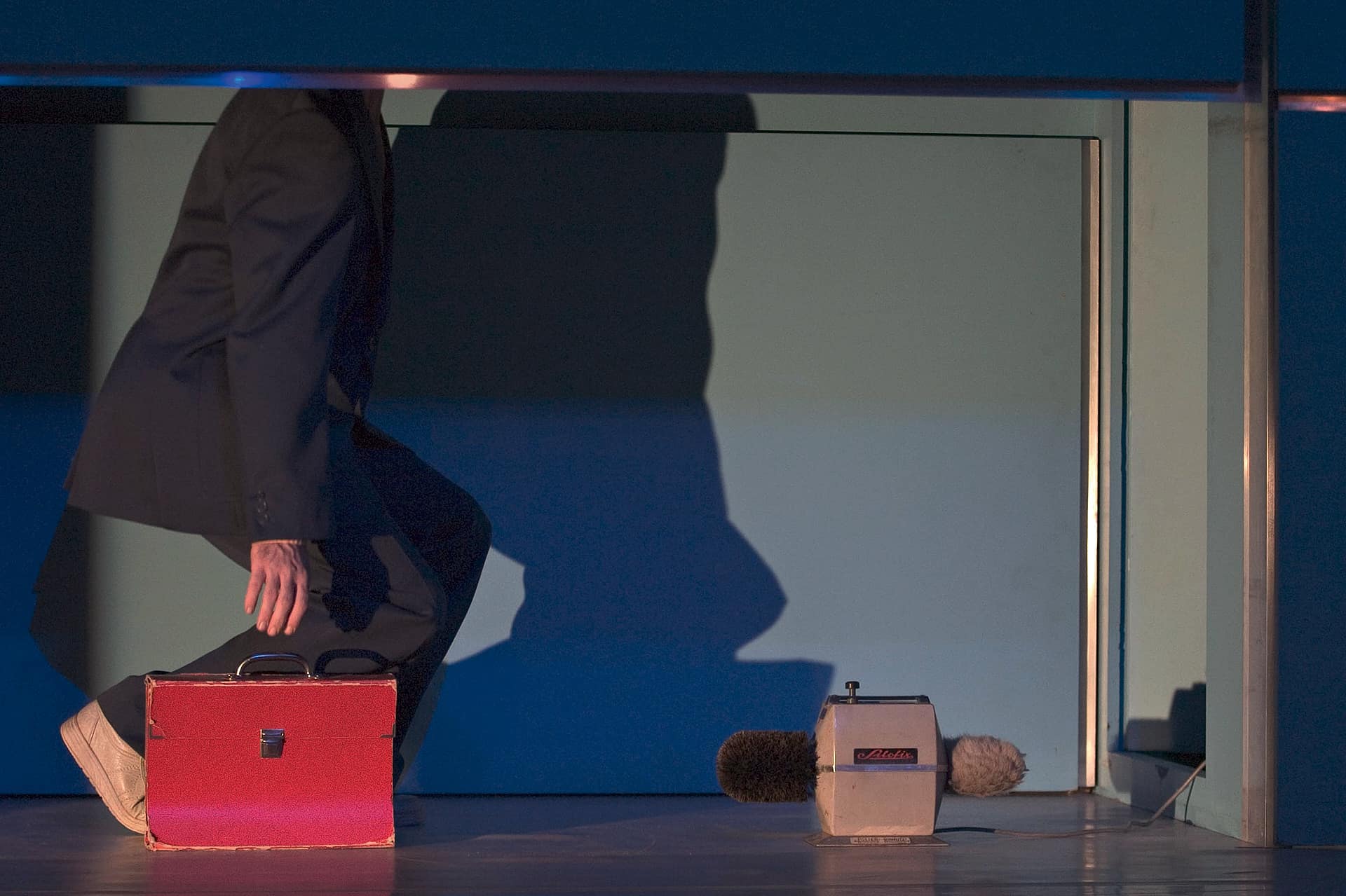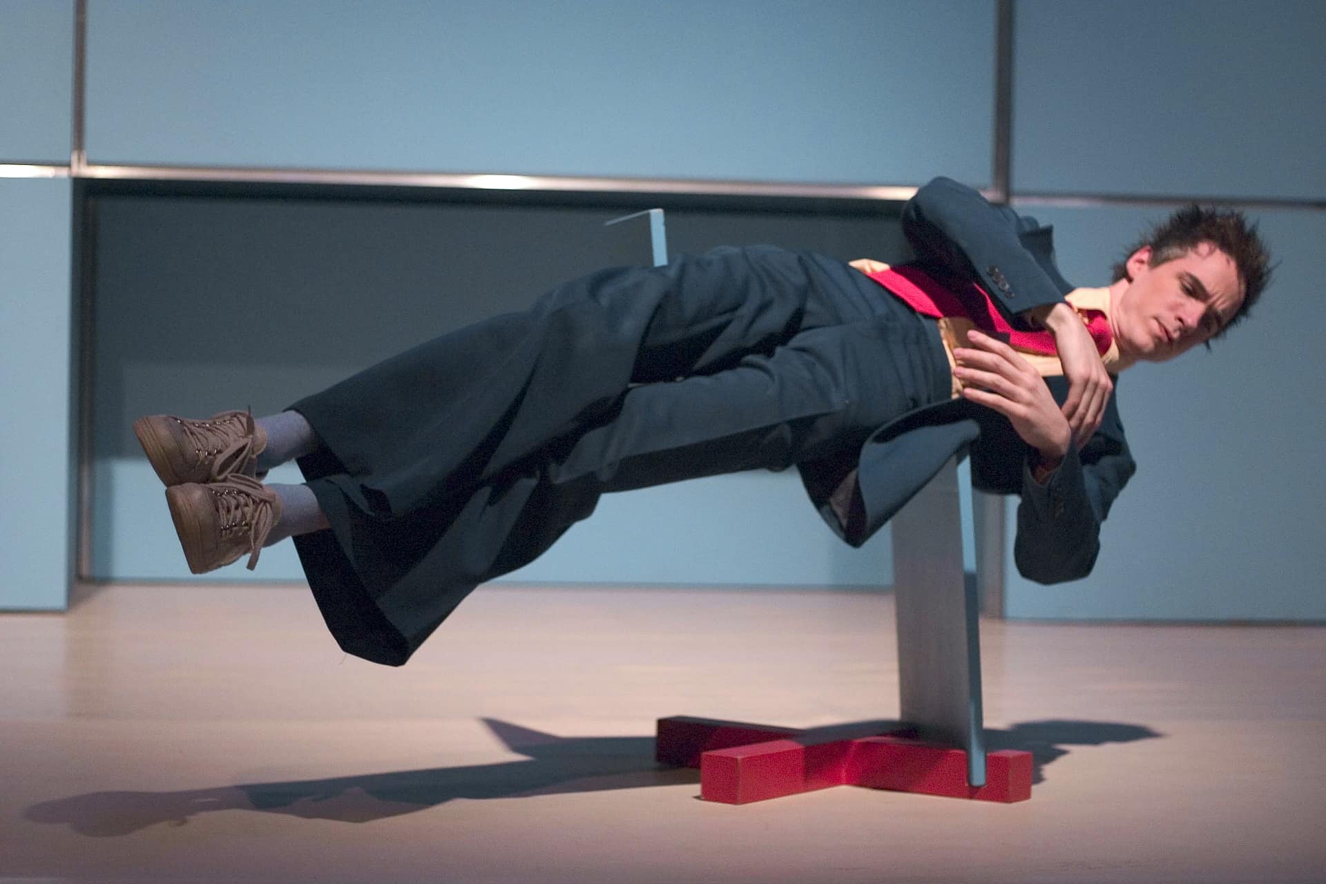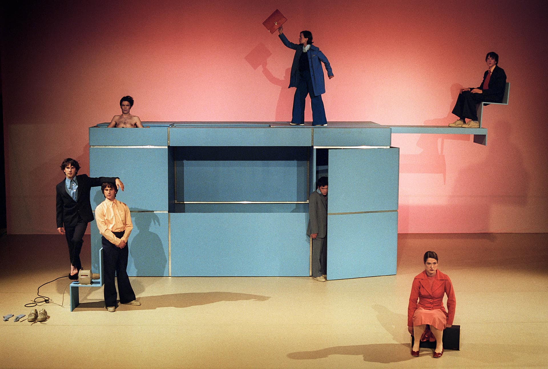 Nico and the Navigators – die Angestellten-Performance Ehe sie eintreten in die fabelhafte Business-Welt, müssen erst einmal die Turnschuhe blank gewienert werden, denn irgendwo über ihren Köpfen regiert Mr. Fock, der nebulöse, unerreichbare Boss. „Eggs on Earth“, der zweite Teil des Zyklus „Menschenbilder“ der 1998 am Bauhaus Dessau gegründeten Gruppe Nico and the Navigators, führt mitten hinein ins Arbeitsleben. Eine virtuose Slapstick-Version von Widmers „Top Dogs“ nannte ein Kritiker den Szenereigen, in dem Buster Keaton und Charlie Chaplin grüßen. In einem himmelblauen Kubus, einer multifunktionalen Überraschungsbox, kämpfen die Büro-Clowns mit der Heimtücke der Möbel, zeigt Regisseurin Nicola Hümpel in surrealen Spiegelungen die Alltagsrituale der Anpassung, Demütigung, Deformation, das albtraumgruselige Spiel der Wiederholungen. Eine Collage aus Bewegungs-, Klang-, Sprach- und Raumbildern, in der sich Ernst und Traurigkeit, Leichtsinn, Spiellust und groteske Komik paaren.