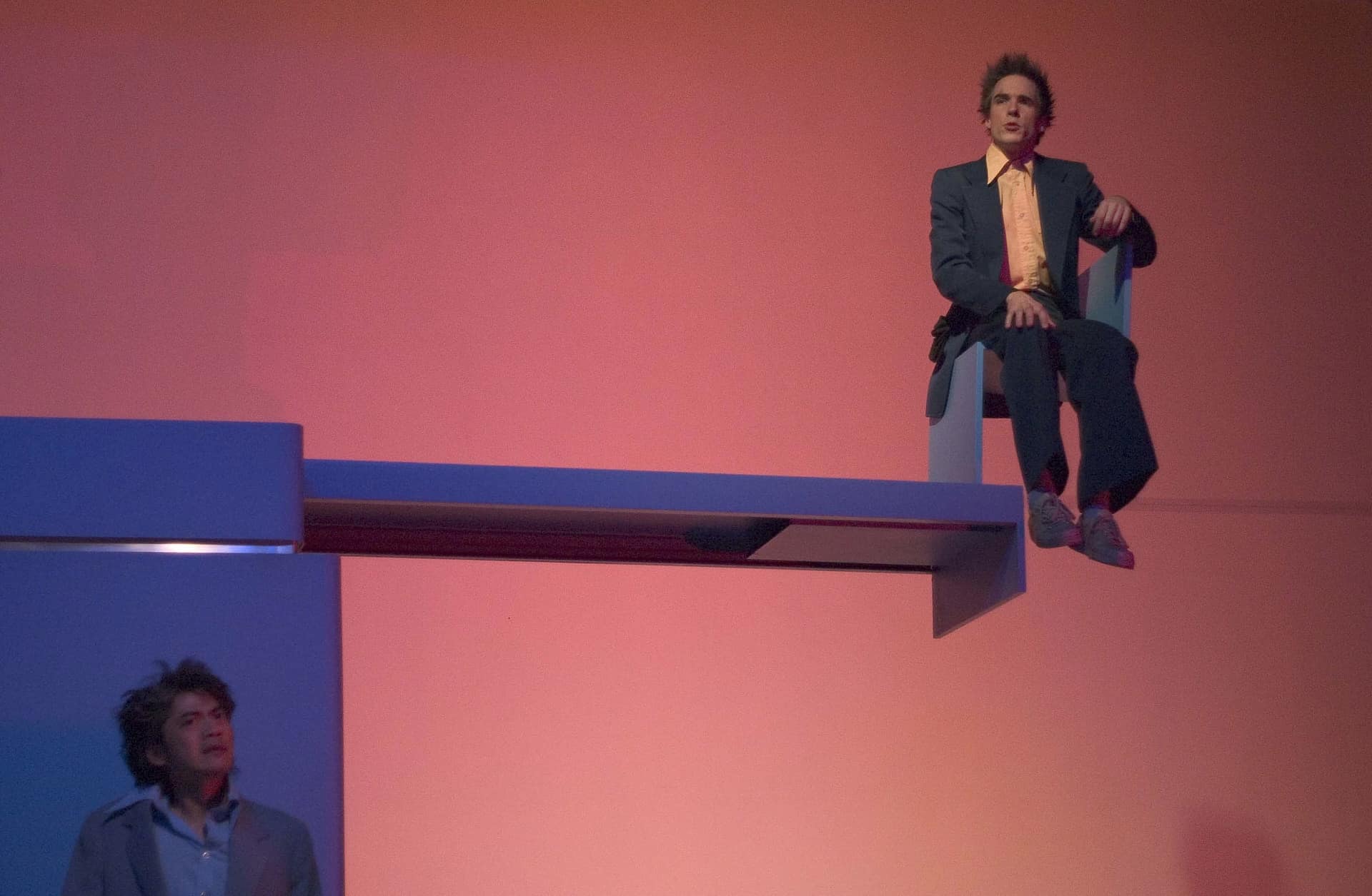 Wie verändert sich das Bild von Arbeit in einer Zeit, in der man statt der Welt nur noch ihren Atlas vor Augen hat? Wo beginnt die Entfremdung von den Dingen, wenn das Geld längst die eigentliche Ware geworden ist? Und wie erträgt man die Demütigung, wenn man statt des überfälligen und fest verabredeten Gesprächs mit dem ominösen Mr. Fock wieder nur Vertröstungen in der Warteschleife zu hören bekommt? Im zweiten Teil der Menschenbilder fragen Nico and the Navigators nach den Verwerfungen in der modernen Arbeitswelt, in der Karrieren ebenso brüchig und verletzlich wirken wie die Biografien dahinter. Anhand von Lebensläufen wie „Peter aus Dessau“ und „Hanno aus Hannover“ zeichnen sie im melancholischen Ton Porträts der „Generation Praktikum“, die in Proskes multifunktionalem Kiosk für Nichts auch optisch immer wieder in Oberkörper und Unterleiber fragmentiert werden. Das Mobiliar der Inszenierung besteht dabei fast ausschließlich aus Stühlen, denen die Hinterbeine fehlen und die daher nicht aus eigener Kraft stehen können, obwohl sie sich mühelos zu Bänken und Tischen zusammensetzen ließen. Mit diesem beredten Accessoire sitzen die Navigators nicht nur am, sondern buchstäblich über dem Abgrund. Sie tragen das stoische Lächeln von Verkäufern zur Schau oder bauen den Erfolgsdruck in nervösen Ticks und absurden Loops auf und ab. Nicola Hümpel zeigt mit ihrem Ensemble zur Jahrtausendwende, zu welch körperlichen Übergriffen die Abhängigkeit in einer Gesellschaft führt, in der Aktenblätter wie Peitschenhiebe knallen können und Maschinen die Macht übernommen haben – und in der ein nackter Mann beim Einstellungsgespräch auf seine speziellen Fähigkeiten befragt wird, während auf seinem Bauch in großen Buchstaben die wahre Sehnsucht eintätowiert ist: „Wann werde ich Vater?“ Dies ist Patric Schott, jener Navigator, der bis heute das Gesicht des Ensembles prägt.