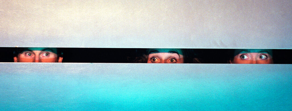 The Helmut that is visible in the title’s uppercase letters is hardly mentioned during the evening. Instead, the piece narrates in fragments about the ancient and ever-present fears that life casually presents – and about the possible stances with which one can confront them. How much of an abyss is hidden beneath the surface of a table? Why do humans often cast shadows larger than themselves? And what strategies must one develop against these fears? “HELden & KleinMUT” demonstrates how one can talk oneself into and out of apprehensions, how one can downplay, laugh off, or overcome them. The staging plays with the ambivalence of the unfamiliar, which one longs for yet fears at the same time, telling stories of the shy or paralyzed posture in the face of the unpredictable. Hair is combed as a visor, and lips are drawn in bold red, humorously desperate forms are maintained in the battle against unwelcome surprises. The stage design, with balconies and a seemingly bottomless but in reality just ground-level well rim, suggests the precipice of the existences presented to the audience. And ultimately, a harmless but inescapable impediment or a malfunctioning meat grinder provide the best descriptions for what can threaten a person if they imagine it intensely enough.