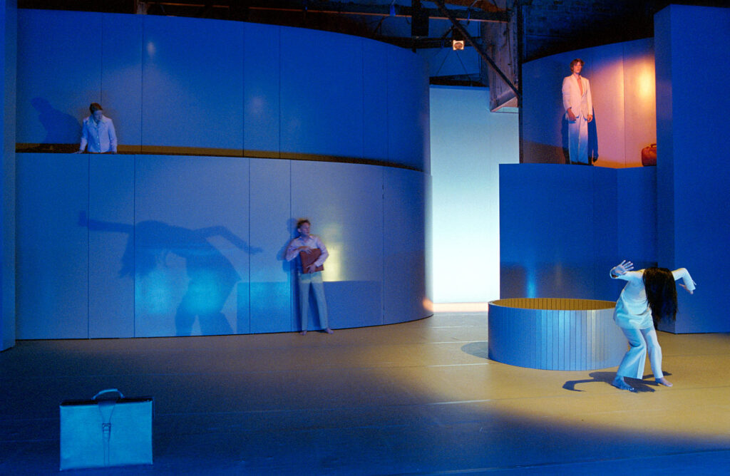 …the current production “Helden & Kleinmut”… seems at first glance like a relaxation seminar for stressed business bosses. The visual worlds of Hümpel and her set designer Oliver Proske are passage foyers of fragile people, carpentered with icy precision…. As pusillanimous heroes, they advertise a “life without death and dying” as if they were standing on the street corner with a watchtower. They extol the blessings of life insurance and play out disembodiment, loss of self, and madness….