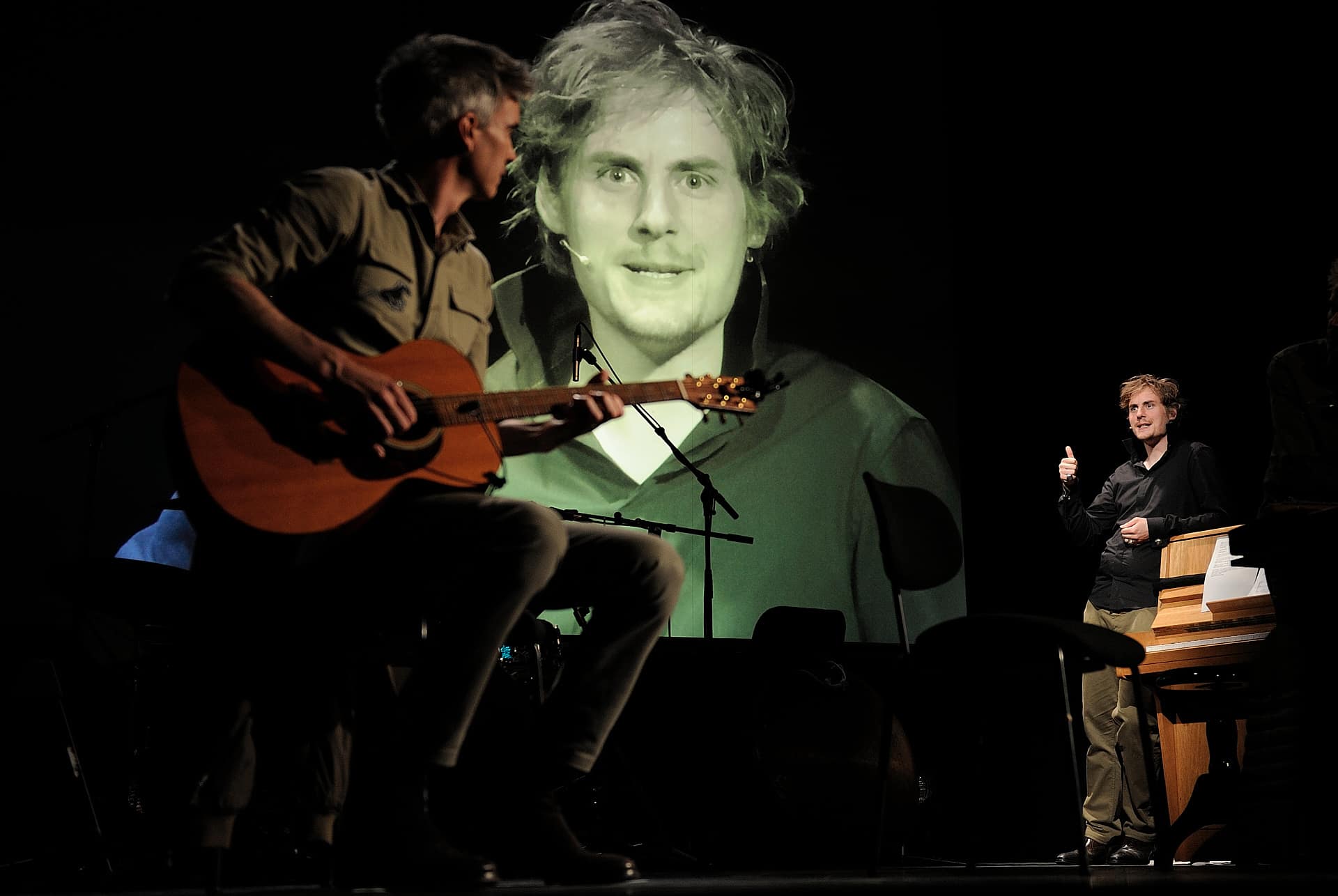Nico and the Navigators sind mir noch (von vor sechs Jahren, als ich sie zum ersten Male live, und zwar mit der Rossini'schen Petite Messe Solenelle, erlebte) als hochmusikantisch-professionelle Spaßvögel und Generellverarscher in Erinnerung - zu seiner Zeit regte ich mich noch "etwas" über ihr Gebaren auf; doch dieser Individualhang zur ereifernden Erregung hat sich mittlerweile selbst bei mir (man wird halt immer älter und gelassener) besänftigend gelegt, ja und so kann mich heute nichts mehr allzu schnell aus meiner Fassung bringen... * Jetzt hat es ein Zweipersonenstück zwischen Ted Schmitz und Fabian Kulp gegeben. Plot geht so: "Zwei Männer begegnen sich auf der Bühne. Der eine eben noch Schauspielstudent, der andere seit Jahren Tenor. Der eine forsch und konfrontationslustig, der andere melancholisch und versonnen. Auf der Suche nach Gegensätzen durchleuchten die beiden Charaktere ihre Denk- und Verhaltensmuster und spiegeln immer mehr auch die großen Fragen und Stimmungen unserer Zeit. Wie viel Freiheit haben wir 'anders' zu sein? Wie schwer ist es die gesellschaftliche Freiheit zu schützen?" (Quelle: kunst-PR-ojekte.de) Schmitz ist also der, der singt und musiziert (wie im realen Leben übrigens; als lyrischer Tenor hatte und hat er an den etablierten Häusern dieser Welt schon hie und da Station gemacht, ja und als Songwriter und Singer wirbt er momentan für sein CD-Album unter dem Titel wanderingted) - und Kulp ist der, der spricht und schauspielert; der Letztgenannte wirkt dann als die eigentliche Initiativschleuder, die dauernd auf pustigste Ausblasangriffe gegen das kellyfamilyartige Lagerfeuer-Uridyll getrimmt zu sein scheint à la 'Kinder, ehrlich mal, aber ich kann euer Geseiere allmählich nicht mehr hören, habt ihr noch was Pfiffigeres und vor allem etwas eure Hörer Mitreißenderes zu bieten, nein, na gut, dann helfe ich euch bisschen auf die Sprünge' oder so. Denn auch von Stephan Biewald (E-Gitarre, Banjo und Gitarre), Philipp Kullen (Schlagzeug) und Jan Gerdes (Keyboard, Mundharmonika, Klavier) springt nicht gerade Zündendes zu uns herüber, was jedoch ganz einfach daran liegt, dass sie halt in der kongenialsten Weise mit den melancholisch-schwermütigen Songs vom guten Ted, der ohnehin eine entwaffnend-wunderschöne Stimme hat, nicht mehr und auch nicht weniger als angemessen Schritt zu halten trachten, was am Ende dann natürlich super funktioniert. Zusammenfassend kann nunmehr behauptet werden, dass dann all dieses Gequatsche (zwischen ihm & ihm) mit Garantie hat nicht verhindern können, dass die aktuellen neuen Songs (vom guten Ted), acht an der Zahl, der Reihe nach gesungen/musiziert sein konnten, und zwar ohne jegliche (ver-)störende Beeinträchtigung durch 'nen Dritten - - und der gute Fabian soll sich hier um Gotteswillen bloß nicht angesprochen fühlen; die Musik, und im Vergleich zum schnöden Wort, obsiegt halt immer - wenn sie gut ist, doch: Im Gegensatz zu dir. http://www.kultura-extra.de/theater/spezial/premierenkritik_imgegensatzzudir_niconavigators.php