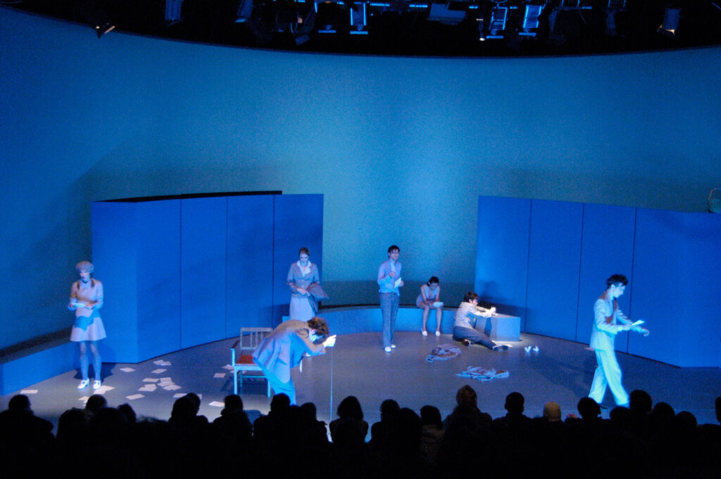 …The Basque-robed one, for instance, hands out leaflets; agitatorily but silently she forms her messages from the semicircle of the stage down, while her colleague below shoves a sock into his mouth. Two others wrestle their clothes off. Later, the flyers become passports, then tarot cards, holding a promise in a bygone language: “There’s someone in your circle of colleagues who is very fond of you.” Sometimes the sentences fall in passing and when a realization is reached, it remains a bit of a mystery….