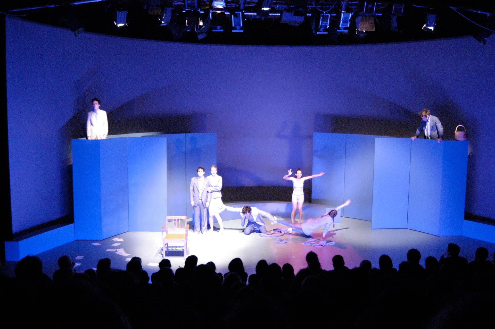 …Schon vorneweg präsentieren sich die sieben Akteure, drei Frauen, vier Männer, mit schräg gegelten Frisuren und sprechend stummem Mienenspiel. Da gibt es Anklänge an die elterliche oder gesellschaftliche Erziehung, Versuche, das Individuum auf eine bestimmte Lebensrichtung festzunageln, astrologische Banalverheißungen… Die jetzige Aufführung ist die schönste, die feinste seit langem!…