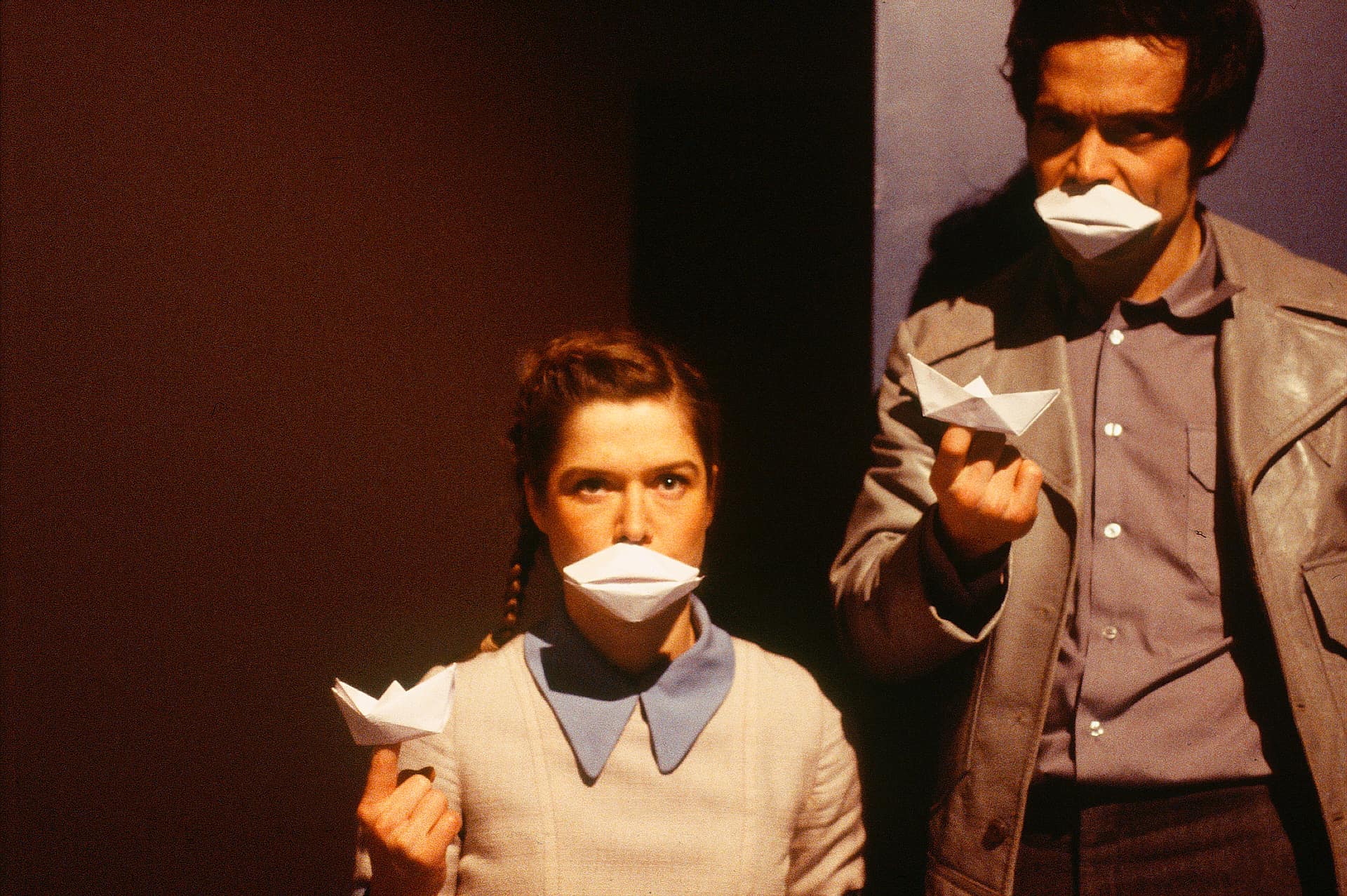 …Die Baskenbemützte etwa verteilt Flugblätter; agitatorisch aber stumm formt sie ihre Botschaften vom Halbrund der Bühne hinunter, während ihr Kollege unten einen Socken in seinen Mund schiebt. Zwei andere ringen sich die Kleider vom Leib. Später werden die Flugblätter zu Pässen, dann zu Tarotkarten und halten in einer vergangenen Sprache ein Versprechen bereit: „Da ist jemand aus deinem Kollegenkreis, der dir sehr zugetan ist“. Bisweilen fallen die Sätze im Vorübergehen und wenn eine Erkenntnis erlangt wird, bleibt sie ein kleines Rätsel…