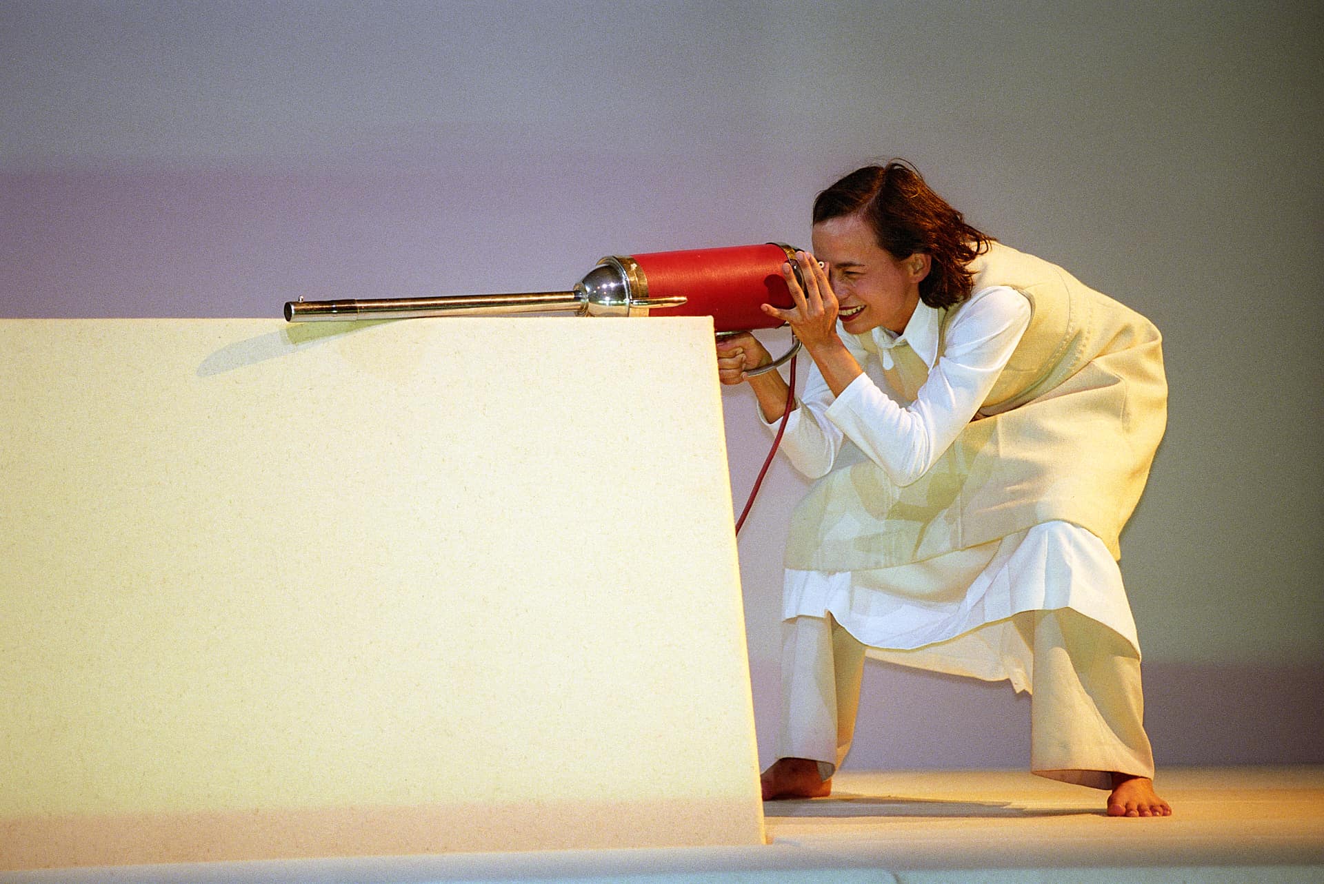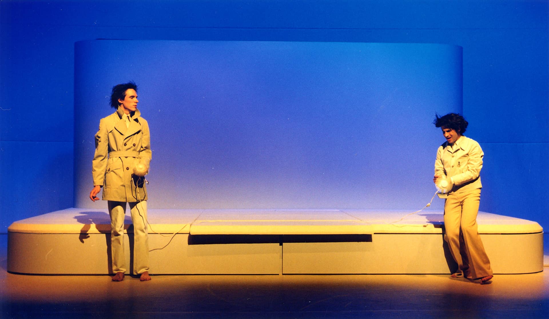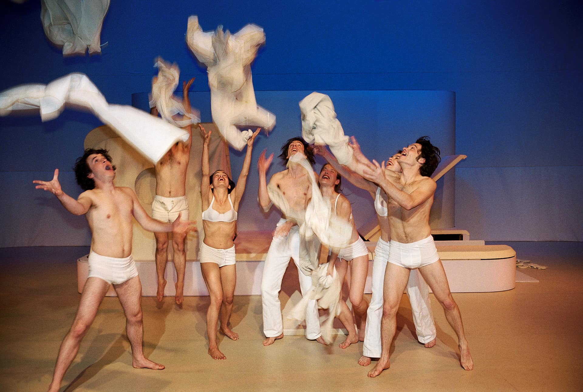 …Fast scheinen die Darsteller in ihren weiß, creme und beige getönten Kunstuniformen, verfremdeter Alltagskleidung, mit dem weißen Bühnenbild zu verschmelzen – sie wollen sich nicht in den Vordergrund drängen, weder farblich noch durch übertriebene Dramatik. Sie bleiben charmante Vortänzer und spleenige Opfer der Dinge und verschwinden auch gerne in den Klappen, Ritzen und Zelten, die sich im Bühnenbau auftun…