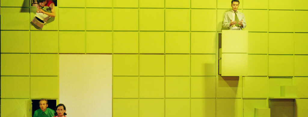 They come in pairs, but they remain individuals. To the sounds of tango, they touch and seduce themselves, even though a potential partner stands directly next to them. In front of the green cassette wall, which gradually reveals its secrets, the colorful shadows tell more about the true intentions than those casting them. And nothing seems to express the deep sadness of the people who meet here better than the squeaky wheel of a child’s wheelbarrow. Even in this early work, which will later be declared the prelude to the triptych “Human Images,” Nico and the Navigators display those stylistic elements they will perfect over the following years – their darkly grounded humor, their work with enigmatic and leitmotif-recurring sentences, and the play with repurposed props that take possession of their owners. In this meditation on the forms and rituals of farewell, there’s a constant feeling conveyed that something might begin here and now – but that everything always tends towards an end. Varieties of loss are explored on many levels, in love and work, homeland and life… and dead birds appear as symbols of longing. Oliver Proske’s stage design offers seemingly inexhaustible possibilities for surprising appearances and exits; parts of his expansive wall function like weather houses or pulpits, revealing stairs or hunter’s fences and can be climbed in daring actions. And one can already observe the early constants of the original cast: Julius Weiland’s lanky comedy, Martin Clausen’s improvisational fervor, or Sinta Tamsjadi’s mysterious alienness. In the end, however, there’s an ironic consolation: One doesn’t necessarily need to bury their head in the sand. It can also be a bucket.