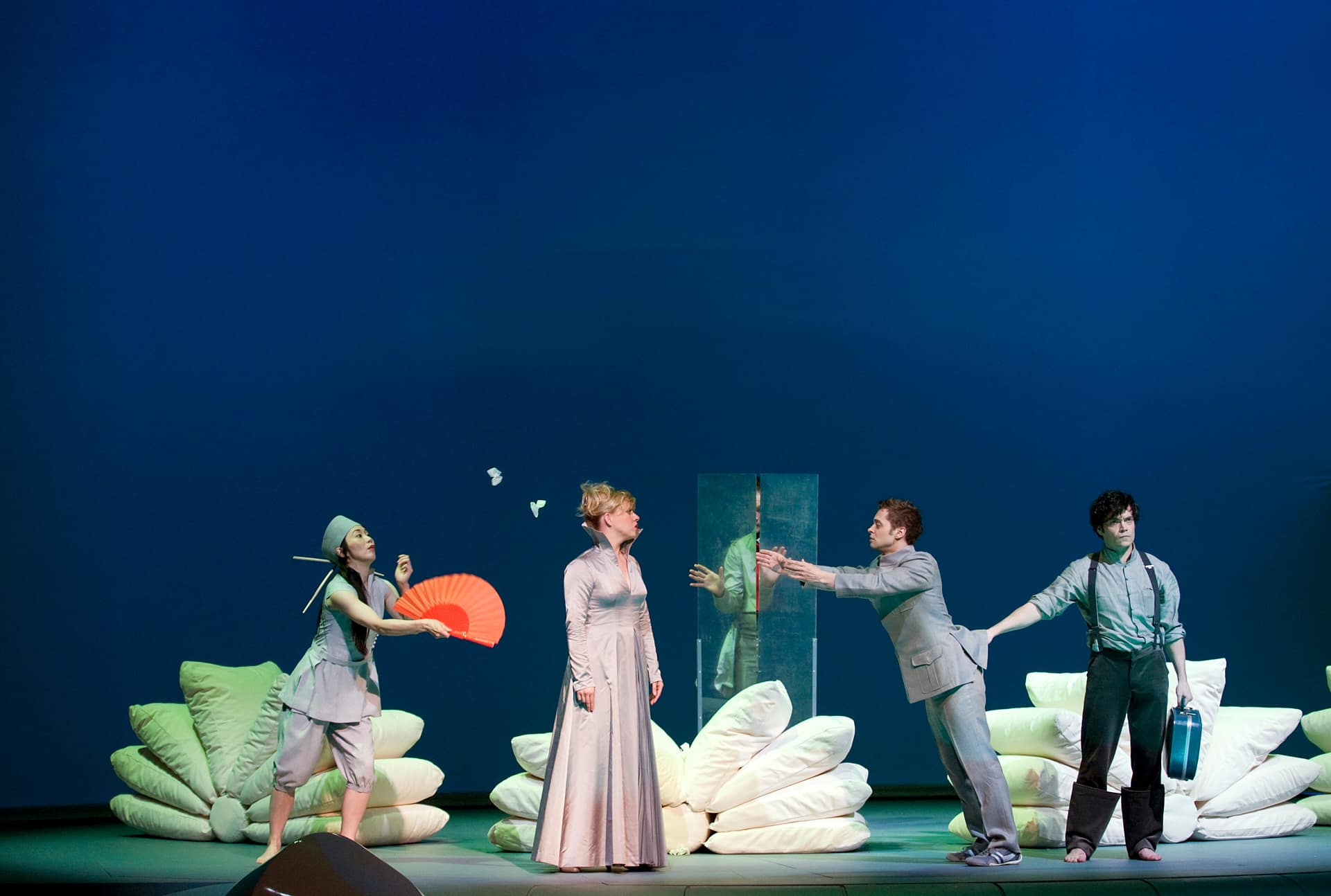 HALLE/MZ. Diese Götter sind wie Kinder: Noch bevor sich Orlando und Angelica, Dorinda und Medoro ver- und entlieben, bevor sich der kleine Prinz aus der Zerreißprobe zwischen Liebe und Macht in den Wahn flüchtet, kämpfen Amor und Mars einen Stellvertreter-Krieg. Aus anfänglicher Liebkosung wird schnell ein Überbietungs-Duell mit Martern aller Arten, wie man es nur im Stande der Unsterblichkeit führen kann - und erst, als Engelchen und Teufelchen begriffen haben, dass sich dieses Patt bis in alle Ewigkeit verlängern ließe, wenden sie sich lohnenderen, menschlichen Kombattanten zu. Doch es ist keine bloße Affekthascherei, die Miyoko Urayama und Patric Schott da betreiben - sondern die sinnstiftende Klammer in der "Orlando"-Inszenierung von Nicola Hümpel. Zwei ihrer langjährigen Mitstreiter hat die Berliner Regisseurin für ihr Stadttheater-Debüt verpflichtet, das als Opern-Produktion zu den Händel-Festspielen unter besonderer Beobachtung stand. Und nie war der Name ihrer freien, international gefeierten Gruppe stimmiger als hier: Die stummen "Navigatoren" halten die Geschichte auf Kurs, sie lesen den Kompass und manövrieren die Mannschaft durch Flaute und Sturm. Dass sie damit zugleich die Barock-Recherche fortschreiben, die im vergangenen Jahr mit "Anaesthesia" in Halle begann, erkennt man auch an den Accessoires in Oliver Proskes grandiosem Bühnenbild: Mit Hirtenstäben und Wollknäueln, mit Fellen und Federblumen wird ein abstraktes Arkadien beschworen, in dem ein Fächer kleine Papierschmetterlinge zum Fliegen bringt und Kissen wie weiße Blumen blühen. Schatten des Windspiels In dieser Landschaft, in der ein Windspiel tanzende Schatten wirft und eine Grotte wie von Zauberhand aus dem Boden wächst, entwickelt die Regisseurin ihre Figuren mit einer zarten Zeichensprache, die auch ohne aphoristische Kommentare und assoziative Videoprojektionen verständlich bliebe. Da wird ein Strumpf zum roten Faden abgewickelt, der gleich darauf einen anderen Akteur an seiner Krawatte auf die Szene zieht. Da genügen Absatzschuhe, um der barfüßigen Schäferin ihre Bodenhaftung zu nehmen. Und da verwandeln sich Frauke Ritters Kostüme in Lauben und Kränze ... Wie Nadelstiche setzt die Inszenierung zudem musikalische Interventionen, die stets vom Respekt für das Werk getragen sind: hier eine minimale Verzögerung, dort der per Flaschenhals zum Wind verstärkte Atem des schlafenden Helden. Die Deutungshoheit aber liegt unüberhörbar im Graben, wo Bernhard Forck ein beeindruckendes Opern-Debüt als Dirigent des Händel-Festspielorchesters feiert. So verständnisinnig und begeisterungsfähig, so mitleidend und entflammbar rechtfertigen die halleschen Staatskapellenmusiker unbedingt den Rang, den man ihnen als heimischem Ensemble bei den Barock-Festspielen zuweist. Das gilt auch und vor allem für die Sängerbesetzung: Owen Willetts ist nicht nur musikalisch, sondern auch darstellerisch ein Orlando, der die blindwütige Raserei wie die ohnmächtige Klage glaubhaft macht. Dmitry Egorovs Medoro hingegen ist ein vokal wie emotional strenger, enger geführter Gegenentwurf zu diesem Radikalen, der buchstäblich am Glockenseil zwischen den Extremen pendelt. Beiden hoch gestimmten Männern sind ebenbürtige Frauen zugewiesen - eine schöne und eine schön gemachte. Während Sophie Klußmann die reine, tief verletzte Unschuld ihrer Dorinda auch in der Kehle trägt, stellt Marie Friederike Schöder den Manierismus und die Posen der erfolgsverwöhnten Angelica auch in der akrobatischen Behandlung ihrer Gesangspartie zur Schau - ironische Selbstentblößung inklusive. Christoph Stegemann schließlich ist ein Zauberer, der mit abgezirkelten Gesten eine Macht behauptet, die ihm nur noch stimmlich gegeben ist. Sprung in die Zeitlosigkeit Es ist ein großer Sprung, den die Oper Halle mit dieser Produktion gewagt hat - eine Lesart, die Händel von den mutwilligen Zurichtungen des Regietheaters befreit und zu einer neuen, zeitlos gültigen Ästhetik öffnet. Diese Feinmechanik des Opern-Glücks spaltet die Meinungen - aber fand zur Premiere eine begeisterte Mehrheit.