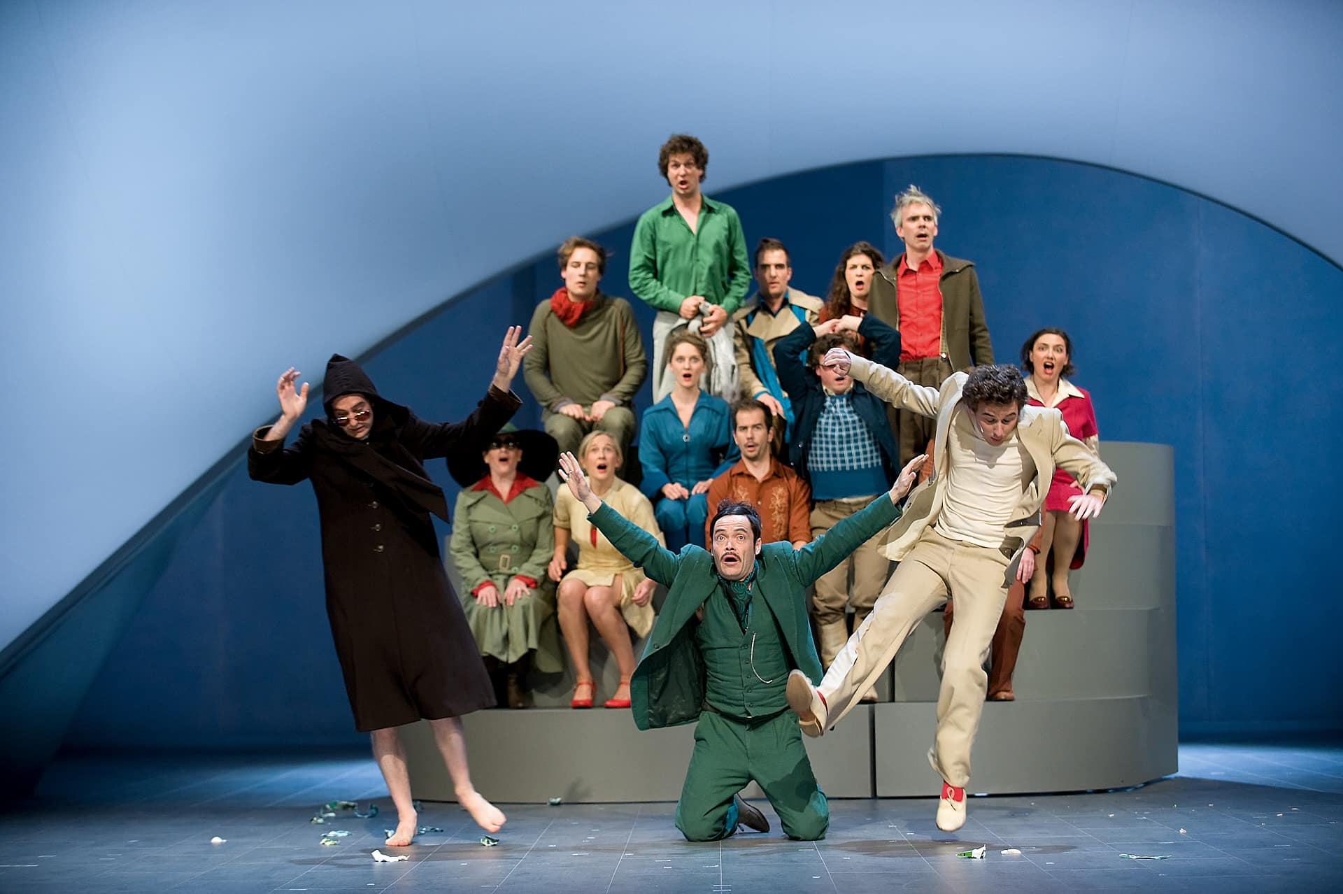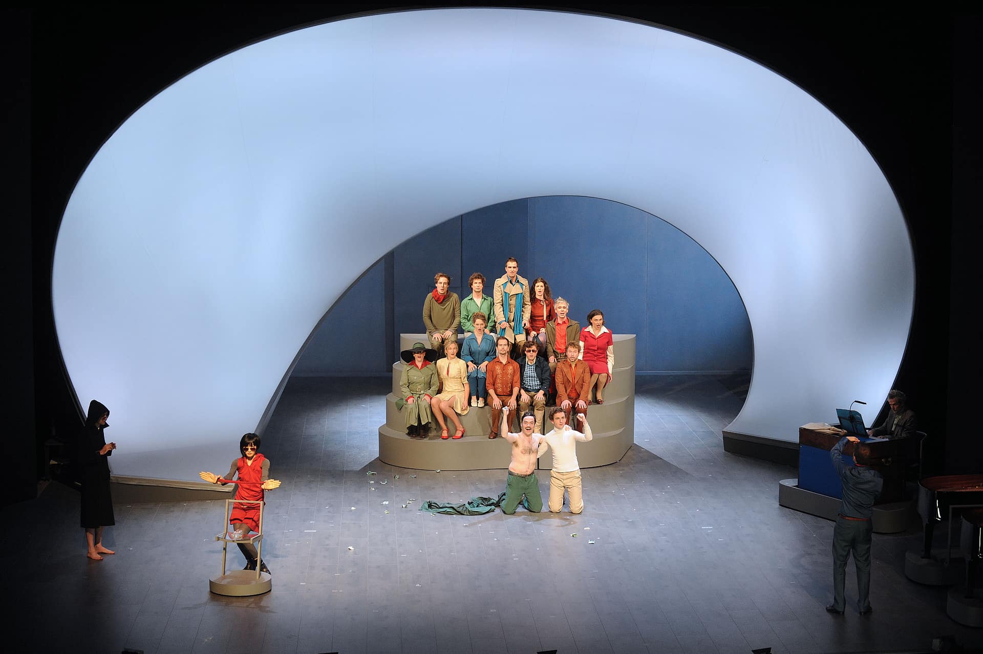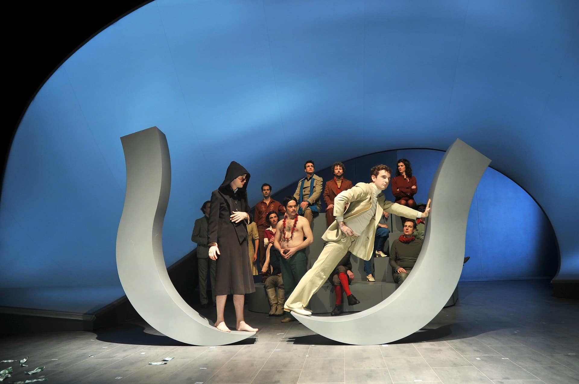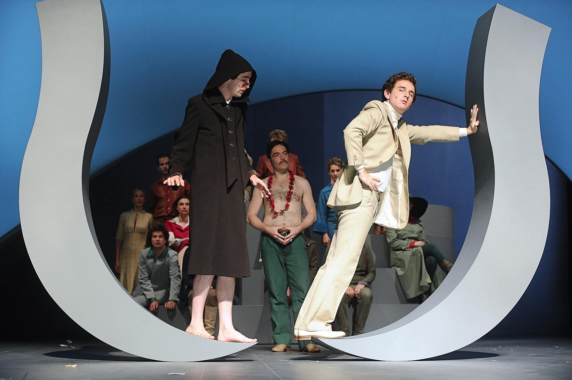Seit einigen Jahren veranstaltet die Pariser Opéra Comique ihre monatlichen Vorstellungsreihen rund um ein Hauptstück und hält oft wunderbare Überraschungen brereit. So beim April-Festival, wo es ein einzigartiges, bemerkenswert intelligentes, wenngleich für einige Zuschauer wohl auch verwirrendes Stück zu entdecken gab: mit dem von der Berliner Compagnie Nico and the Navigators und ihrer Regisseurin Nicola Hümpel neu erfundenen Rossini wurde sogar das Hauptstück des Monats ("Die Stumme von Portici") übertroffen. Auf Europatour nach ihrer Uraufführung beim Kunstfest Weimar im vergangenen September war diese Petite Messe für leider nur zwei Abende in Paris zu erleben. Die sehr gelungene Bühne von Oliver Proske scheint auf den ersten Blick in der Rue Favart zwar ein wenig eingeengt – aber dieser Eindruck schwindet schnell angesichts der Kohärenz des gesamten Unternehmens. Eine höchst seltsame, fassbinder’sche Figur mit Kapuzenmantel und Sonnenbrille und eine zweite namens Benedikt (siehe da!...) symbolisieren in dieser inszenierten Fassung des Werks die Begegnung zwischen Glaube und Vernunft. So erlaubt sich Nicola Hümpel, der Partitur einige Dialoge hinzuzufügen, die, so harmlos sie sind, doch nie bloßem Gerede verfallen (abwechselnd auf Deutsch und Englisch, mit einigen Einwürfen auf Französisch). Man kann nicht gerade behaupten, dass sich Hümpels Sichtweise in den Dienst kirchlicher Rituale stellt (das Geheimnis der Eucharistie wird eher spöttisch beäugt), aber ebenso wenig geht es ihr um das Vergnügen, „den guten Bürger zu schockieren“. Bis in die Fingerspitzen ist die Regisseurin mit ihrem Neuen Testament vertraut und lässt sich in der Annäherung an Rossinis Werk immer wieder davon inspirieren. Daraus erwächst ein erstaunlich fließender, schwer in Worte zu fassender Abend. Erwähnt seien nur diese zwei halbrunden Bühnenelemente, die auf skurrile Weise erst Jesus’ Gang übers Wasser und anschließend - aufgerichtet und aneinandergestellt - die Durchquerung der engen Pforte andeuten, ein Bild, das sich frech auch als Sicherheitskontrolle unterm Metalldetektor lesen lässt. Am Ende des Abends, wenn das Agnus Dei erklingt, findet man alle Sänger-Schauspieler liegend auf der Bühne wieder, die Augen gen Himmel gerichtet, die Arme erst weit und flehend ausgebreitet, dann rachsüchtig zur Faust geballt: dieses Bild spiegelt wunderbar den Geist dieser Petite Messe solennelle zwischen Glaube und Skepsis, Spiritualität und Materialismus. Den vier Darstellern und Tänzern, stehen die zwölf Sänger (darunter die Solisten Laura Mitchell, Ulrike Mayer, Milos Bulajic und Nikolay Borchev) auf musikalischem Niveau in nichts nach. Wer will, dem mag zwar das ein oder andere Detail auffallen, aber viel wichtiger ist doch hervorzuheben, wie sehr sich alle Beteiligten in Hümpels Vorhaben integrieren - so auch die großartigen Pianisten David Zobel, SooJin Anjou (Flügel) und Jan Gerdes (Harmonium) oder der Dirigent Nicholas Jenkins, allesamt Protagonisten eines feinsinnig arrangierten Stückes.