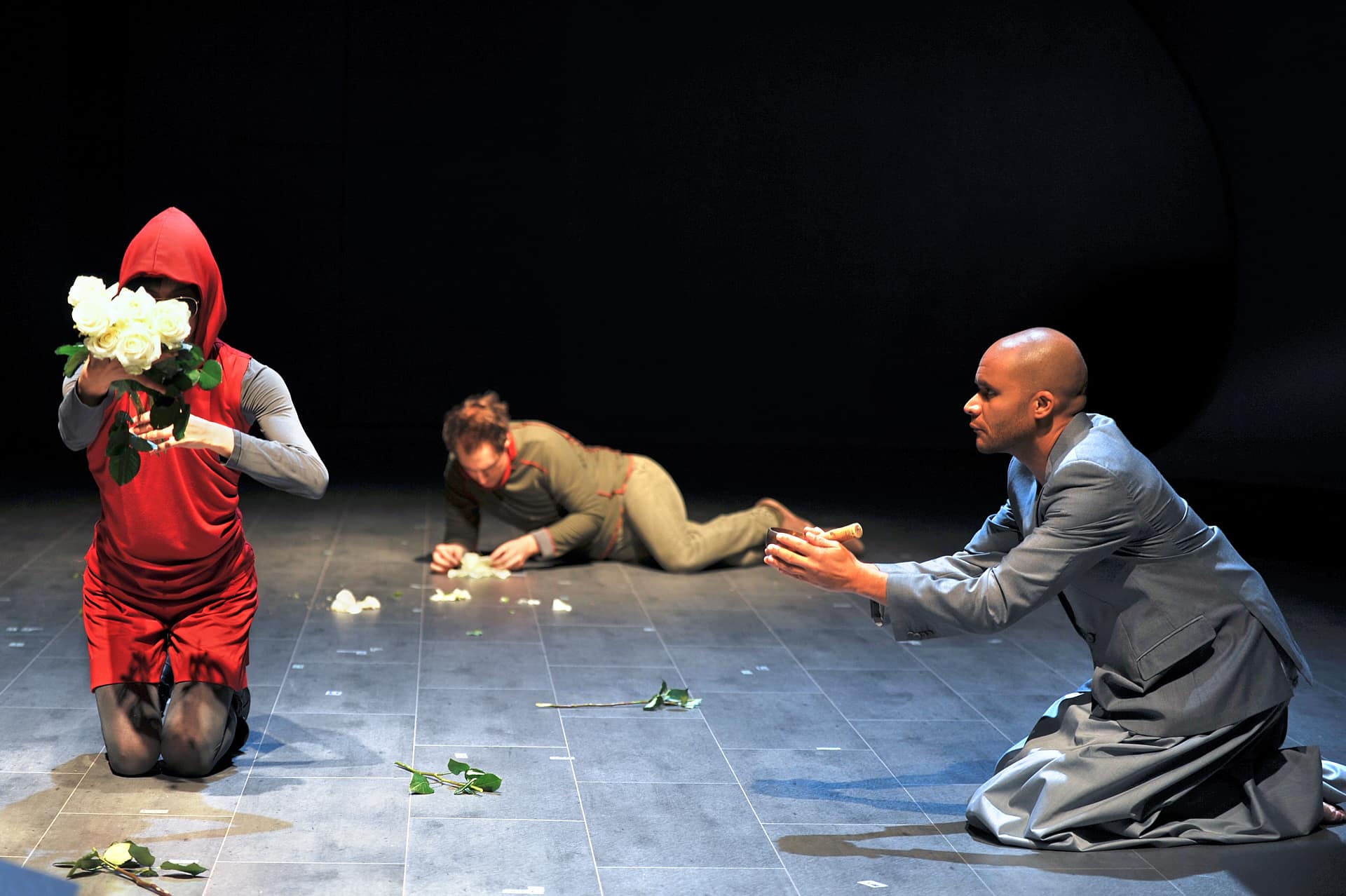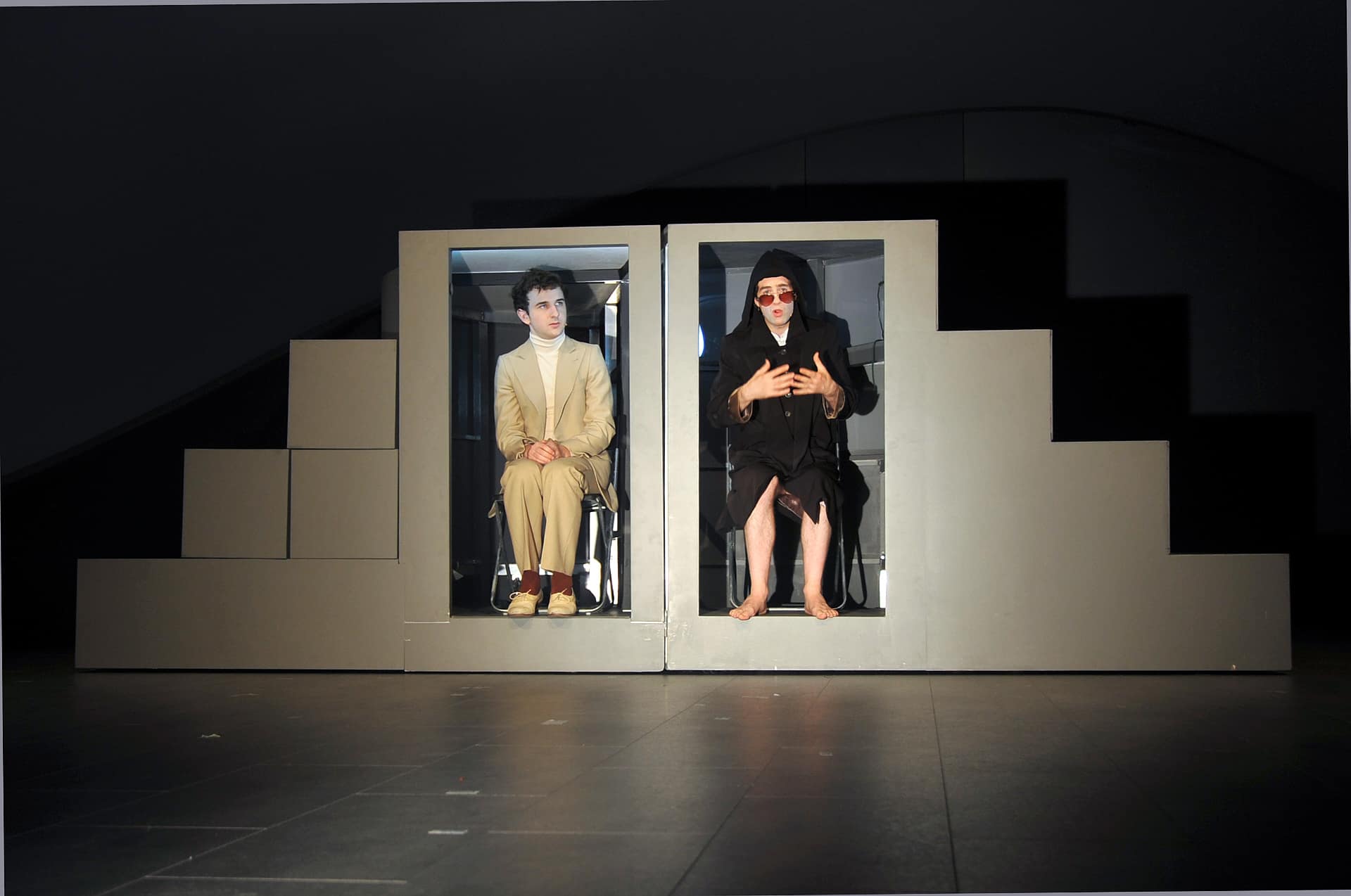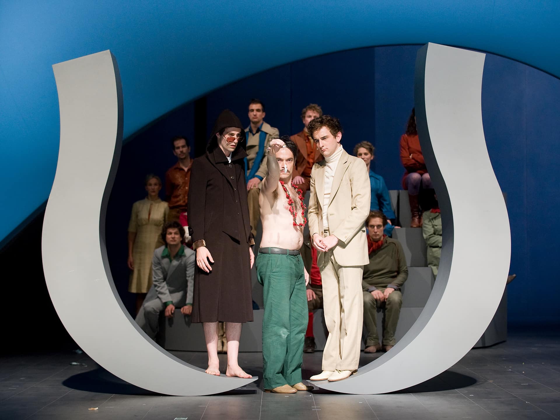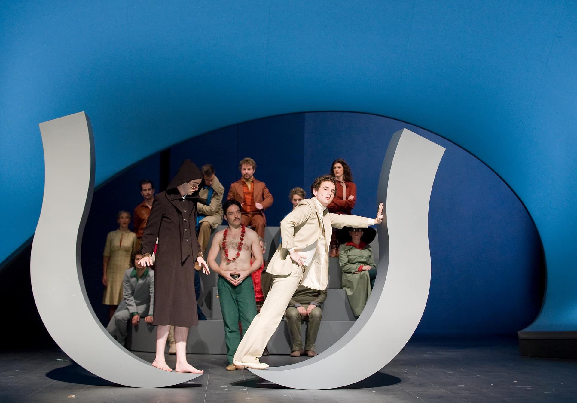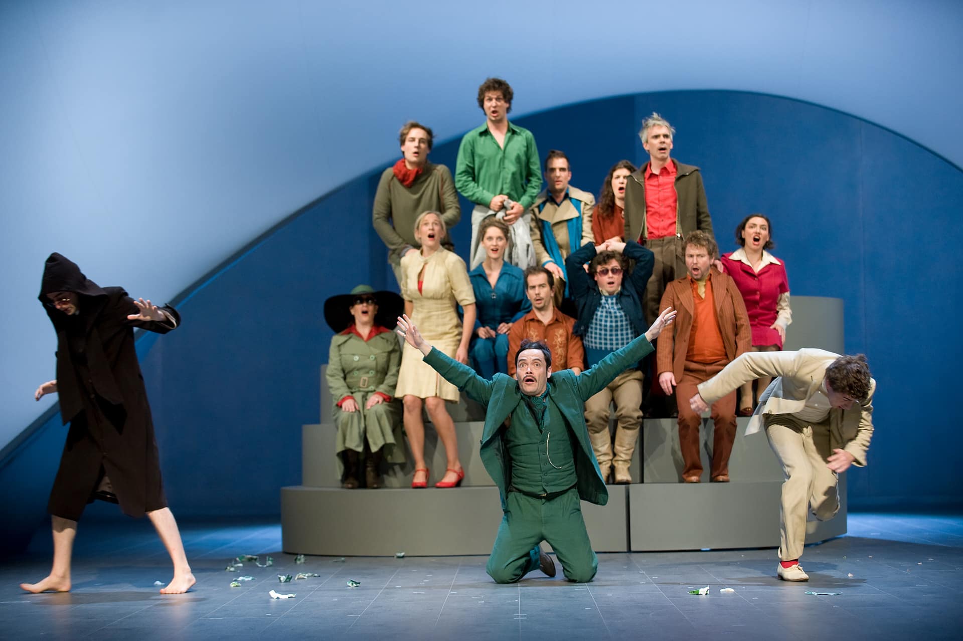Seit einigen Jahren veranstaltet die Pariser Opéra Comique ihre monatlichen Vorstellungsreihen rund um ein Hauptstück und hält oft wunderbare Überraschungen brereit. So beim April-Festival, wo es ein einzigartiges, bemerkenswert intelligentes, wenngleich für einige Zuschauer wohl auch verwirrendes Stück zu entdecken gab: mit dem von der Berliner Compagnie Nico and the Navigators und ihrer Regisseurin Nicola Hümpel neu erfundenen Rossini wurde sogar das Hauptstück des Monats ("Die Stumme von Portici") übertroffen. Auf Europatour nach ihrer Uraufführung beim Kunstfest Weimar im vergangenen September war diese Petite Messe für leider nur zwei Abende in Paris zu erleben. Die sehr gelungene Bühne von Oliver Proske scheint auf den ersten Blick in der Rue Favart zwar ein wenig eingeengt – aber dieser Eindruck schwindet schnell angesichts der Kohärenz des gesamten Unternehmens. Eine höchst seltsame, fassbinder’sche Figur mit Kapuzenmantel und Sonnenbrille und eine zweite namens Benedikt (siehe da!...) symbolisieren in dieser inszenierten Fassung des Werks die Begegnung zwischen Glaube und Vernunft. So erlaubt sich Nicola Hümpel, der Partitur einige Dialoge hinzuzufügen, die, so harmlos sie sind, doch nie bloßem Gerede verfallen (abwechselnd auf Deutsch und Englisch, mit einigen Einwürfen auf Französisch). Man kann nicht gerade behaupten, dass sich Hümpels Sichtweise in den Dienst kirchlicher Rituale stellt (das Geheimnis der Eucharistie wird eher spöttisch beäugt), aber ebenso wenig geht es ihr um das Vergnügen, „den guten Bürger zu schockieren“. Bis in die Fingerspitzen ist die Regisseurin mit ihrem Neuen Testament vertraut und lässt sich in der Annäherung an Rossinis Werk immer wieder davon inspirieren. Daraus erwächst ein erstaunlich fließender, schwer in Worte zu fassender Abend. Erwähnt seien nur diese zwei halbrunden Bühnenelemente, die auf skurrile Weise erst Jesus’ Gang übers Wasser und anschließend - aufgerichtet und aneinandergestellt - die Durchquerung der engen Pforte andeuten, ein Bild, das sich frech auch als Sicherheitskontrolle unterm Metalldetektor lesen lässt. Am Ende des Abends, wenn das Agnus Dei erklingt, findet man alle Sänger-Schauspieler liegend auf der Bühne wieder, die Augen gen Himmel gerichtet, die Arme erst weit und flehend ausgebreitet, dann rachsüchtig zur Faust geballt: dieses Bild spiegelt wunderbar den Geist dieser Petite Messe solennelle zwischen Glaube und Skepsis, Spiritualität und Materialismus. Den vier Darstellern und Tänzern, stehen die zwölf Sänger (darunter die Solisten Laura Mitchell, Ulrike Mayer, Milos Bulajic und Nikolay Borchev) auf musikalischem Niveau in nichts nach. Wer will, dem mag zwar das ein oder andere Detail auffallen, aber viel wichtiger ist doch hervorzuheben, wie sehr sich alle Beteiligten in Hümpels Vorhaben integrieren - so auch die großartigen Pianisten David Zobel, SooJin Anjou (Flügel) und Jan Gerdes (Harmonium) oder der Dirigent Nicholas Jenkins, allesamt Protagonisten eines feinsinnig arrangierten Stückes.