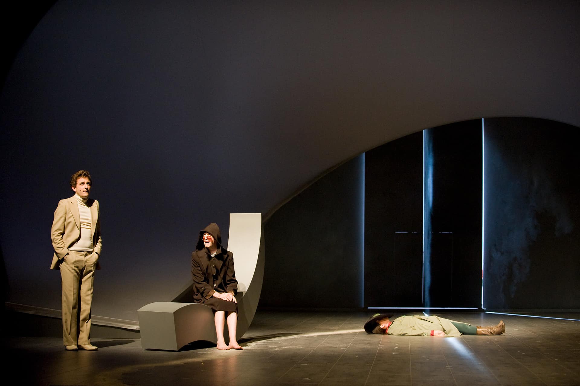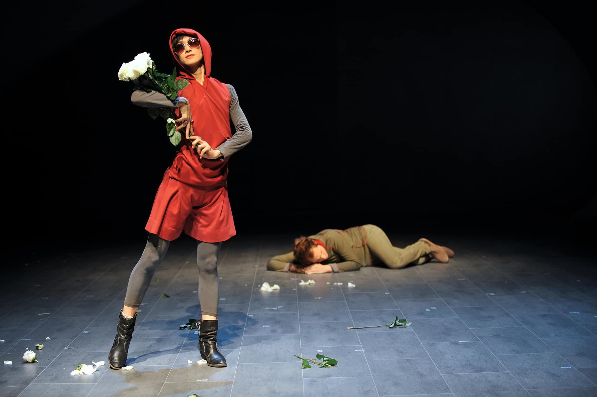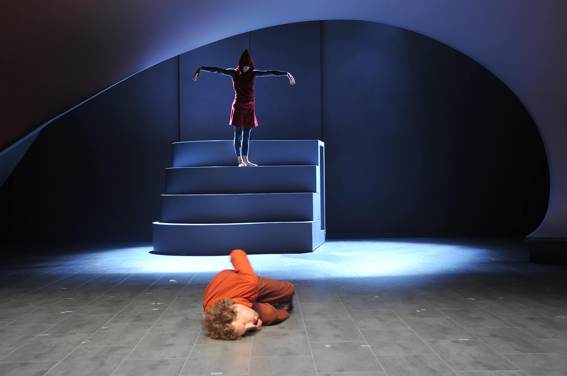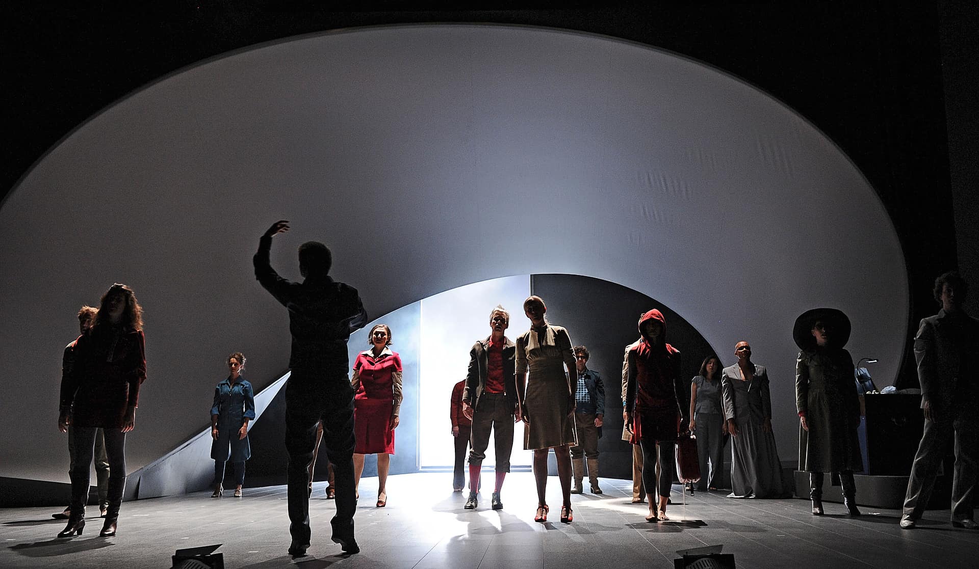 Seit einigen Jahren veranstaltet die Pariser Opéra Comique ihre monatlichen Vorstellungsreihen rund um ein Hauptstück und hält oft wunderbare Überraschungen brereit. So beim April-Festival, wo es ein einzigartiges, bemerkenswert intelligentes, wenngleich für einige Zuschauer wohl auch verwirrendes Stück zu entdecken gab: mit dem von der Berliner Compagnie Nico and the Navigators und ihrer Regisseurin Nicola Hümpel neu erfundenen Rossini wurde sogar das Hauptstück des Monats ("Die Stumme von Portici") übertroffen. Auf Europatour nach ihrer Uraufführung beim Kunstfest Weimar im vergangenen September war diese Petite Messe für leider nur zwei Abende in Paris zu erleben. Die sehr gelungene Bühne von Oliver Proske scheint auf den ersten Blick in der Rue Favart zwar ein wenig eingeengt – aber dieser Eindruck schwindet schnell angesichts der Kohärenz des gesamten Unternehmens. Eine höchst seltsame, fassbinder’sche Figur mit Kapuzenmantel und Sonnenbrille und eine zweite namens Benedikt (siehe da!...) symbolisieren in dieser inszenierten Fassung des Werks die Begegnung zwischen Glaube und Vernunft. So erlaubt sich Nicola Hümpel, der Partitur einige Dialoge hinzuzufügen, die, so harmlos sie sind, doch nie bloßem Gerede verfallen (abwechselnd auf Deutsch und Englisch, mit einigen Einwürfen auf Französisch). Man kann nicht gerade behaupten, dass sich Hümpels Sichtweise in den Dienst kirchlicher Rituale stellt (das Geheimnis der Eucharistie wird eher spöttisch beäugt), aber ebenso wenig geht es ihr um das Vergnügen, „den guten Bürger zu schockieren“. Bis in die Fingerspitzen ist die Regisseurin mit ihrem Neuen Testament vertraut und lässt sich in der Annäherung an Rossinis Werk immer wieder davon inspirieren. Daraus erwächst ein erstaunlich fließender, schwer in Worte zu fassender Abend. Erwähnt seien nur diese zwei halbrunden Bühnenelemente, die auf skurrile Weise erst Jesus’ Gang übers Wasser und anschließend - aufgerichtet und aneinandergestellt - die Durchquerung der engen Pforte andeuten, ein Bild, das sich frech auch als Sicherheitskontrolle unterm Metalldetektor lesen lässt. Am Ende des Abends, wenn das Agnus Dei erklingt, findet man alle Sänger-Schauspieler liegend auf der Bühne wieder, die Augen gen Himmel gerichtet, die Arme erst weit und flehend ausgebreitet, dann rachsüchtig zur Faust geballt: dieses Bild spiegelt wunderbar den Geist dieser Petite Messe solennelle zwischen Glaube und Skepsis, Spiritualität und Materialismus. Den vier Darstellern und Tänzern, stehen die zwölf Sänger (darunter die Solisten Laura Mitchell, Ulrike Mayer, Milos Bulajic und Nikolay Borchev) auf musikalischem Niveau in nichts nach. Wer will, dem mag zwar das ein oder andere Detail auffallen, aber viel wichtiger ist doch hervorzuheben, wie sehr sich alle Beteiligten in Hümpels Vorhaben integrieren - so auch die großartigen Pianisten David Zobel, SooJin Anjou (Flügel) und Jan Gerdes (Harmonium) oder der Dirigent Nicholas Jenkins, allesamt Protagonisten eines feinsinnig arrangierten Stückes.