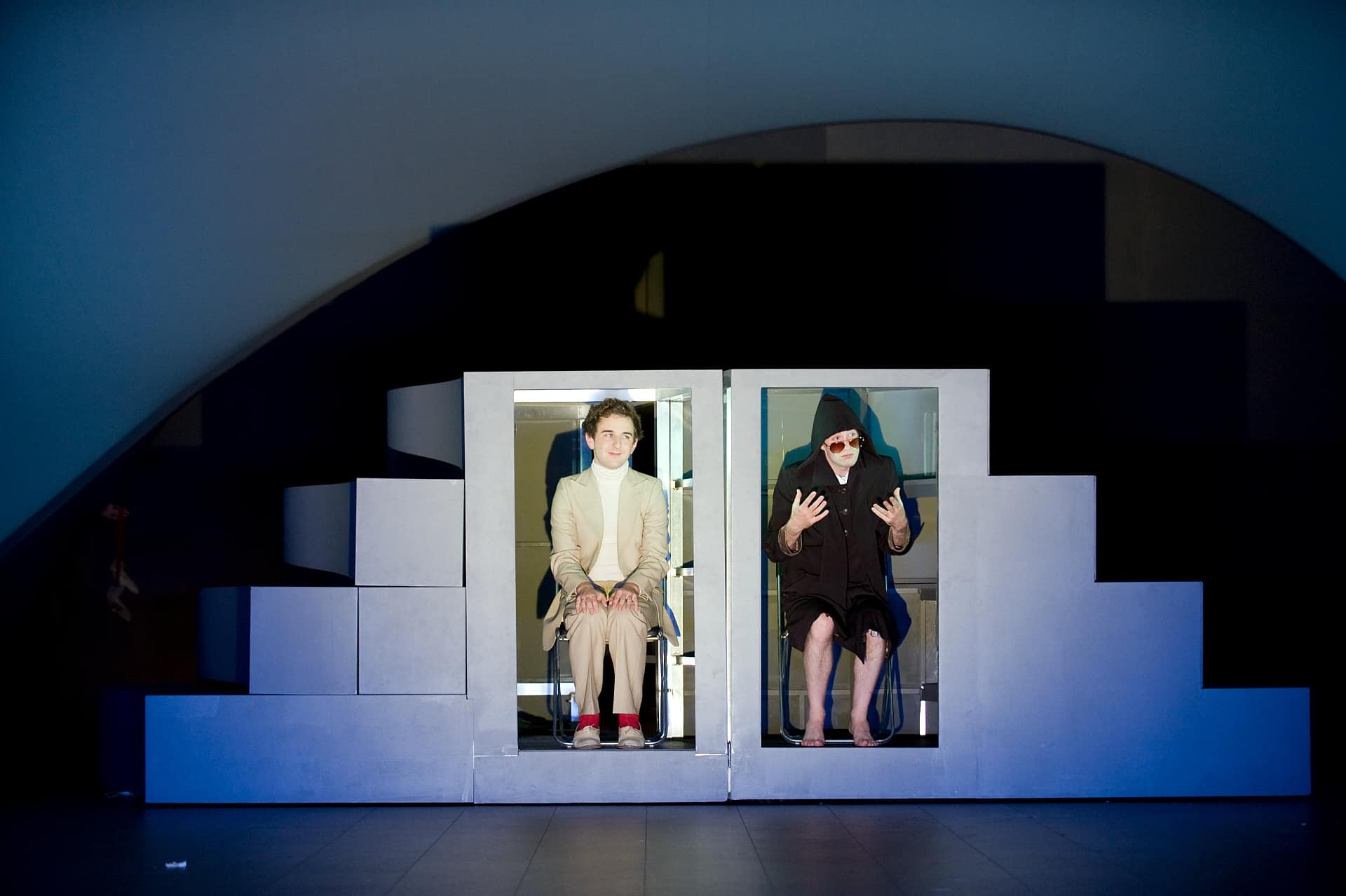 An einem Abend so viele Geschichten zu erzählen, wie Gäste im Publikum sitzen, umschreiben Nico and the Navigators das Ziel ihrer Produktionen. Darauf läuft es wohl auch bei der neuesten Arbeit des seit 1998 bestehenden Kollektivs um die Regisseurin Nicola Hümpel und den Bühnenbildner Oliver Proske hinaus. Diesmal haben sie sich in ihrer Neubewertung von bedeutenden Musikwerken der Vergangenheit an Gioachino Rossinis „Petite messe solennelle“ gewagt und damit mehr als einen veritablen Wurf gelandet. Thema des knapp zweistündigen Bildertheaters ist Religiosität in unserer Zeit: Können wir nach all dem Übel der Welt und in der Phase eines höchst rigiden Spätkapitalismus den naiven Worten des Messetextes noch trauen, ihnen gar glauben? Selbst Rossini, eher Spötter denn Salbader, sind 1863, nach Fertigstellung des Auftragsopus, Zweifel gekommen. Bittet er doch in einem seiner Briefe an Gott um Vergebung für jene abwiegelnd petite, klein, genannte Messe: Er sei nicht sicher, ob sie heilige oder nicht doch nur vermaledeite, Opernpathos nahe Musik enthalte. Instrumentiert hat Rossini sie für zwei Klaviere und Harmonium, mit einem Chor aus zwölf Sängern analog den Aposteln beim Abendmahl, gewissermaßen als musikalisches „Fressgelage“. Jener Abstand des Komponisten zum eigenen OEuvre kommt Nico und Co. entgegen. Zwar hält sich die Regie konsequent an jene erste Fassung, addiert jedoch einen Countertenor, eine Tänzerin sowie Schauspieler, die aussprechen, was der Musik latent innewohnt, mehr noch Zuhörer von heute bewegt. So entsteht eine das Werk überwölbende Gesamtkonstruktion voller Fragen, Verunsicherungen und Zweifel. Einen in sich verdrehten weißen Bogen wölbt auch Proske über die Szene im Radialsystem, dem er eine raffiniert nutzbare Treppe unterschiebt. Zuspitzung bereits am Anfang. Da redet ein Mann im hellen Anzug auf einen barfüßigen Büßer mit Kapuze ein, will wissen, was hinter der Tür sei und ob sie sich öffne. Wer Antworten will, muss erst zuhören, entgegnet knapp die Kapuze. Die Flügel fahren auf, Passanten kommen, packen den Hellen, das Kyrie setzt ein, und auch eine Tänzerin in Rot, der Teufel möglicherweise, mischt sich unter. Die lauscht eigener Musik, wem sie die Kopfhörer leiht, gerät in Verzückung. Der erste Bruch. Lauter Gläubige auf einem Kissen, da sitzt der Teufel dazwischen, lacht einer den hehren Spuk weg und zermalmt gespendete Blumen. Wieder philosophiert der Helle, es gebe nachweislich bloß zehn Dimensionen, da wirds eng für Gott, sich zu verstecken. Beim Domine Deus fängt der Teufel leiernd die Worte des Tenors auf, zermahlt sie im Mörser, trinkt genüsslich den Wortsud. Sopran und Alt eignen sich im Qui tollis den Mantel des Dirigenten an, verschmelzen dahinter zum Doppelwesen. Streichelt der Bassist einen Menschen, wischt er sich danach die Hand ab; die Inbrunst im Gesang über Jesus attackieren die Spieler, seine Hände führt der Teufel zum Gebet: Zwiespalt auch hier. Ein Akteur geißelt sich, wird zum Amen getränkt; der Teufel lockt mit hölzernen Händen; der Dirigent berauscht sich hohl auf einem Drehsessel. Es kommt noch schlimmer. Der Büßer im Beichtstuhl gesteht dem Hellen, der plötzlich Benedikt heißt, er nehme Liebe, wo er sie finde, wolle keinesfalls lehren; Benedikt aber bezieht Wissen nur aus Büchern, tobt wider einen Sintflut-Kapitalismus. Beim Crucifixus wird der Sopran mit dem Rosenkranz stranguliert, der Teufelin platzt ihre Ballon-Schwangerschaft. Stufen der Treppe werden zu „Sicheln“, in denen Büßer und Benedikt im Wettbewerb schaukeln, schieben sich vor dem Credo dann zum Tor zusammen, durch das jeder wie beim Sicherheitscheck muss; einer besteht nicht, landet im Gefängnis. Während des Chorus befummeln sich welche, das Amen zerfasert, eine ekstatisch Knicksende wird mit Geld entgolten. Als ob alle Fragen Antworten hätten, räsoniert der Büßer; doch Benedikt wittert zwischen den Galaxien das Nichts. Da öffnet der Teufel wirklich eine riesige Klapptür, Nebel quillt, die Sopranistin singt wie eine mechanische Puppe, kippt kurz ab. Jeden dirigiert der Teufel in den rechten Nebelgang. Den Büßer erwischts: Er liebe die Menschen nicht, habe gelogen, fragt, ob Benedikt einer Schwangeren im Bus den Platz anbieten würde. Dem verschlägt es nicht nur die Sprache; zum Agnus Dei erkennt man ihn als Schuldigen an allem Leid, wirft ihn zu Boden. „If you have any question“ ruft ihm der Büßer oben aus dem Saal zu. Mit diesem eindringlichen Bild endet auch verschmitzt der Parcours durch die Rossini-Messe und den Religions-Diskurs. Wie erwartet unentschieden. Auch das macht den Abend so anregend. Daneben besticht er mit sängerischer Delikatesse des gesamten Ensembles und so witzigem wie nachdenklichem Plädoyer für Menschlichkeit.