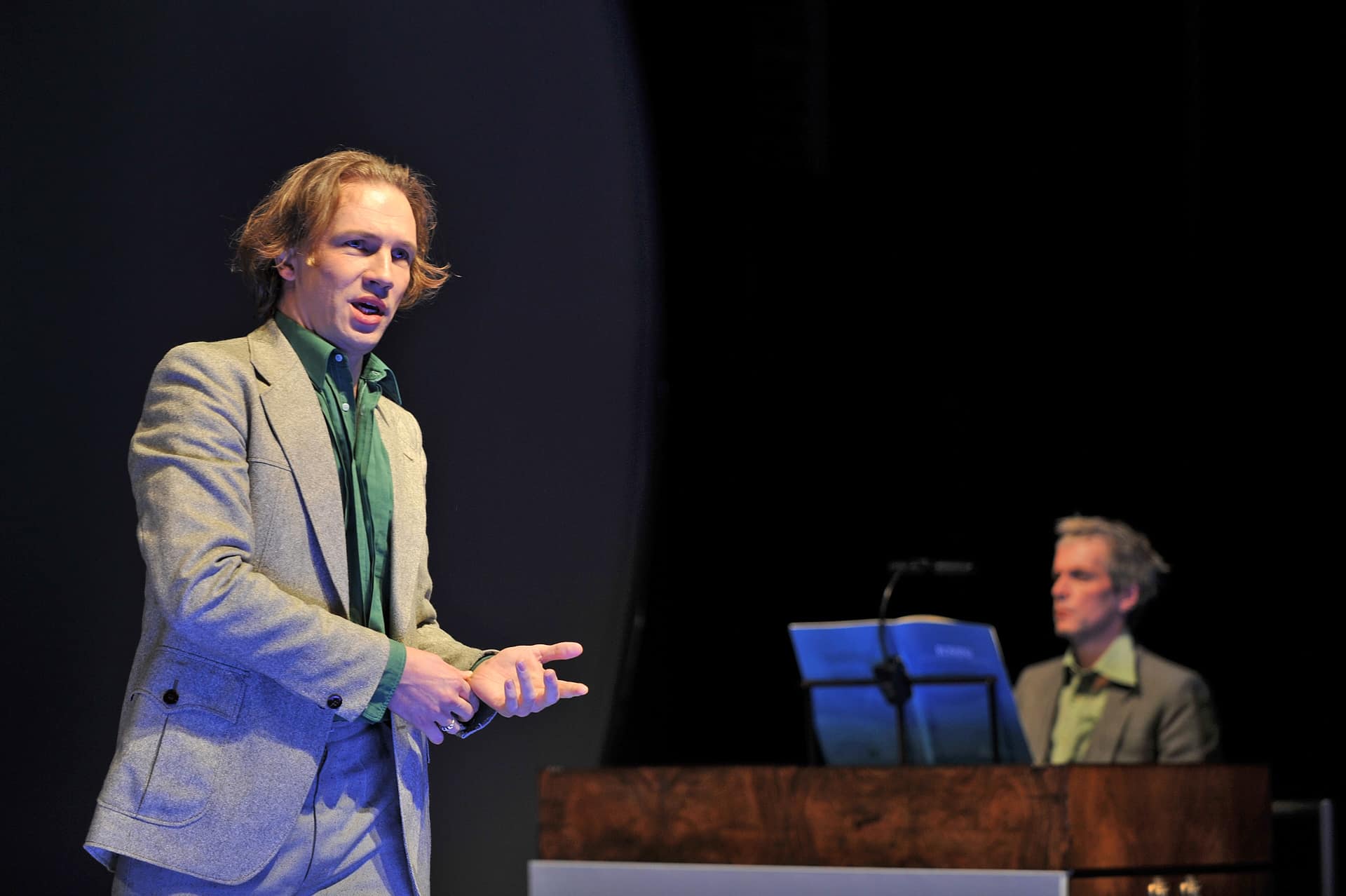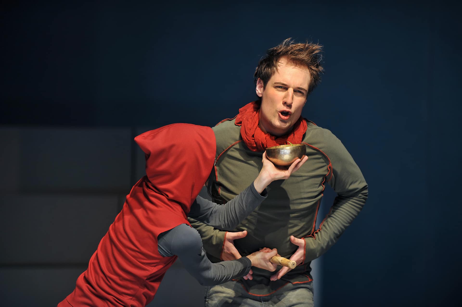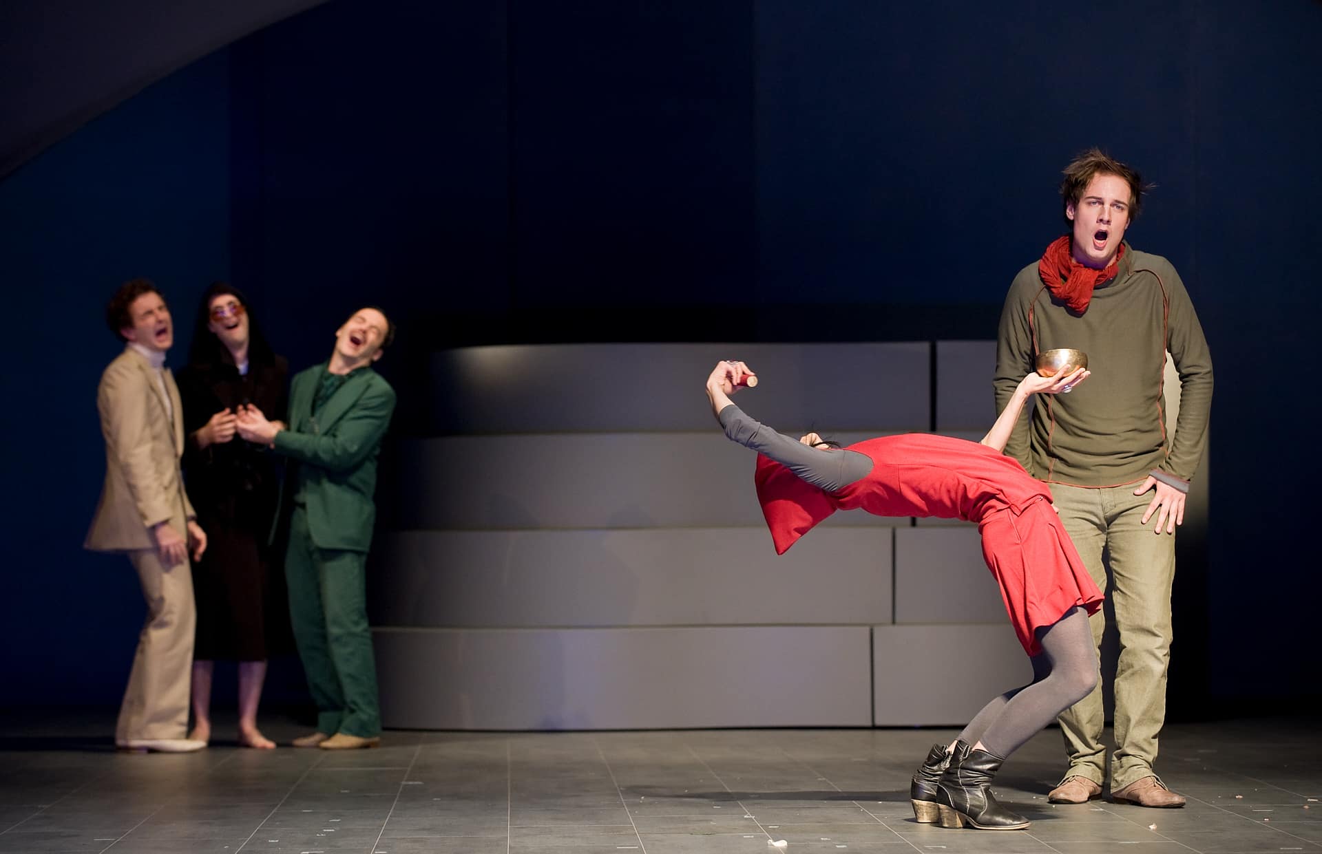 Poetisch, denkt man, wenn es um die Petite Messe Solennelle von Rossini geht, die „Nico and the Navigators“ im Radialsystem zeigen. Ein geistliches Werk, das Nicola Hümpel und Oliver Proske in einen Abend mit Musik, Tanz und kaum Handlung verwandelt haben, der beim Weimarer Kunstfest Premiere feierte. Zwei Flügel, die auf lautlos rollenden Podesten einfahren, ersetzen gemeinsam mit dem Harmonium das Orchester. Die 20 Mitwirkenden sind in Preußischblau, Rostrot oder Herbstdunkel gekleidet (Kostüme: Frauke Ritter); sie laufen, stehen, hampeln und berühren sich. Unter dem Dirigat von Nicholas Jenkins, der ebenso Takt gibt wie er sich schwärmerisch mitbewegt, singen die meisten von ihnen aber auch, und dies sehr schön (besonders der Bassist Nikolay Borchev und die Mezzosopranistin Ulrike Mayer). Yui Kawaguchi dagegen tanzt, ein rotkapuziger Puck mit messerscharf in die Horizontale ausfahrenden Armen und Beinen. Und Adrian Gillott in schwarzer Büßersoutane unterhält sich mit Peter Fasching, natürlich über Gott und die Welt. Wenn dieser Gillott dann beim Agnus Dei in weißer Wäsche und vor hell ausgenebeltem Hintergrund wieder erscheint, dann mischen sich in dieser Inszenierung Jugend, großer Ernst und Leichtigkeit auf eine fast rührende Weise. Ironisch kann jeder. Diesem Ensemble aber gelingt es, Heiterkeit aus Rossinis Petite Messe Solennelle klingen zu lassen, ohne deren Geistlichkeit zu verleugnen, das Bild eines Komponisten zu zeichnen, der in das neue Werk „all mein kleines musikalisches Wissen gelegt und mit wahrer Liebe zur Religion gearbeitet“ hatte, tatsächlich ein Stück Musik zu verlebendigen, dem bislang wohl höchstens das unauffällige Ende in ganz gewöhnlichen Chorkonzerten bevorstand.