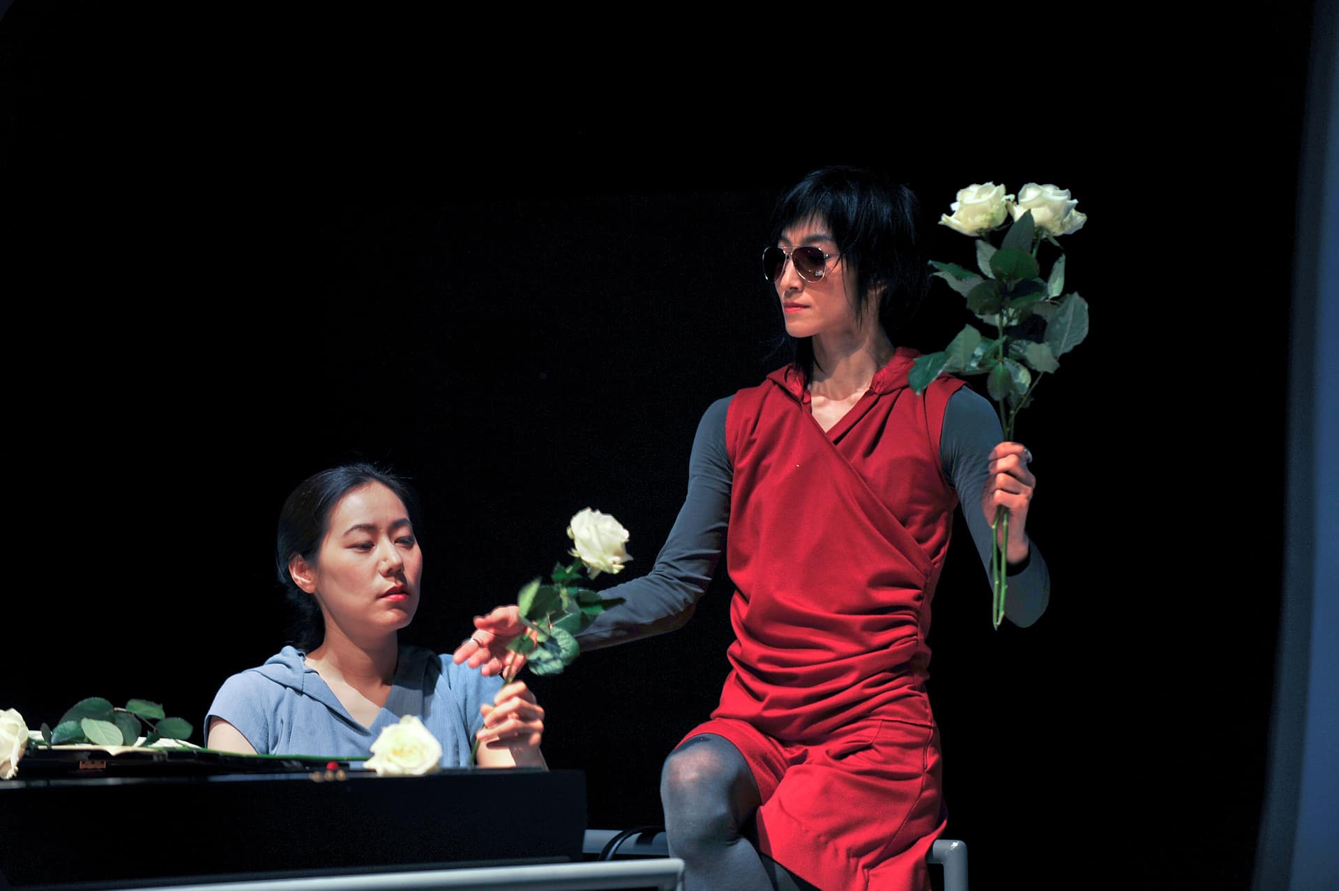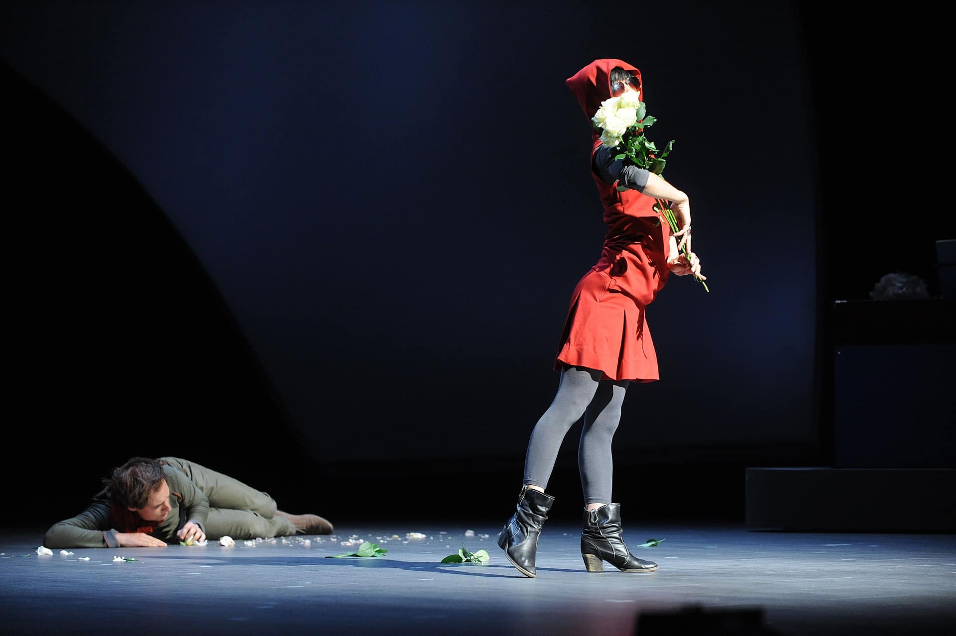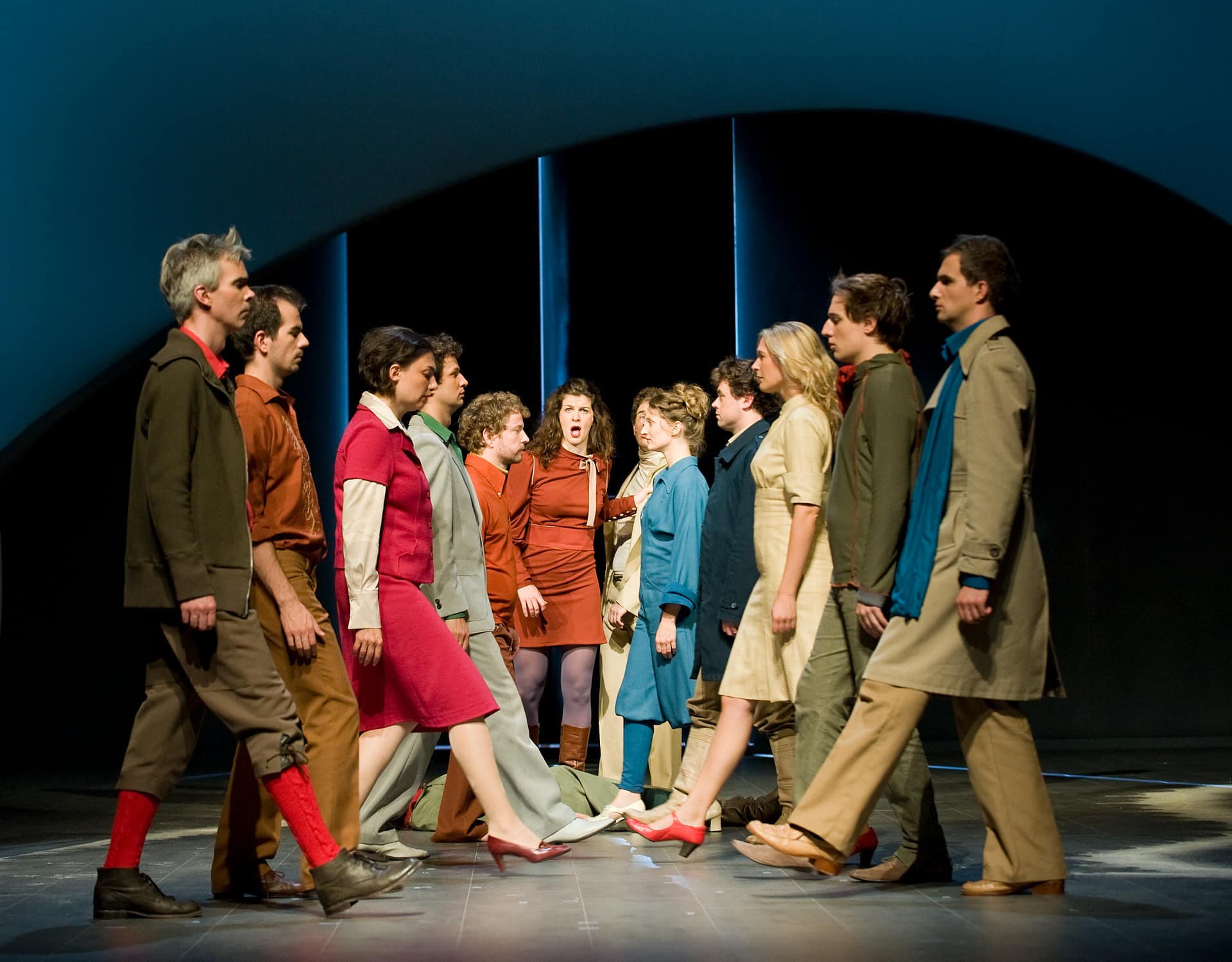 Poetisch, denkt man, wenn es um die Petite Messe Solennelle von Rossini geht, die „Nico and the Navigators“ im Radialsystem zeigen. Ein geistliches Werk, das Nicola Hümpel und Oliver Proske in einen Abend mit Musik, Tanz und kaum Handlung verwandelt haben, der beim Weimarer Kunstfest Premiere feierte. Zwei Flügel, die auf lautlos rollenden Podesten einfahren, ersetzen gemeinsam mit dem Harmonium das Orchester. Die 20 Mitwirkenden sind in Preußischblau, Rostrot oder Herbstdunkel gekleidet (Kostüme: Frauke Ritter); sie laufen, stehen, hampeln und berühren sich. Unter dem Dirigat von Nicholas Jenkins, der ebenso Takt gibt wie er sich schwärmerisch mitbewegt, singen die meisten von ihnen aber auch, und dies sehr schön (besonders der Bassist Nikolay Borchev und die Mezzosopranistin Ulrike Mayer). Yui Kawaguchi dagegen tanzt, ein rotkapuziger Puck mit messerscharf in die Horizontale ausfahrenden Armen und Beinen. Und Adrian Gillott in schwarzer Büßersoutane unterhält sich mit Peter Fasching, natürlich über Gott und die Welt. Wenn dieser Gillott dann beim Agnus Dei in weißer Wäsche und vor hell ausgenebeltem Hintergrund wieder erscheint, dann mischen sich in dieser Inszenierung Jugend, großer Ernst und Leichtigkeit auf eine fast rührende Weise. Ironisch kann jeder. Diesem Ensemble aber gelingt es, Heiterkeit aus Rossinis Petite Messe Solennelle klingen zu lassen, ohne deren Geistlichkeit zu verleugnen, das Bild eines Komponisten zu zeichnen, der in das neue Werk „all mein kleines musikalisches Wissen gelegt und mit wahrer Liebe zur Religion gearbeitet“ hatte, tatsächlich ein Stück Musik zu verlebendigen, dem bislang wohl höchstens das unauffällige Ende in ganz gewöhnlichen Chorkonzerten bevorstand.