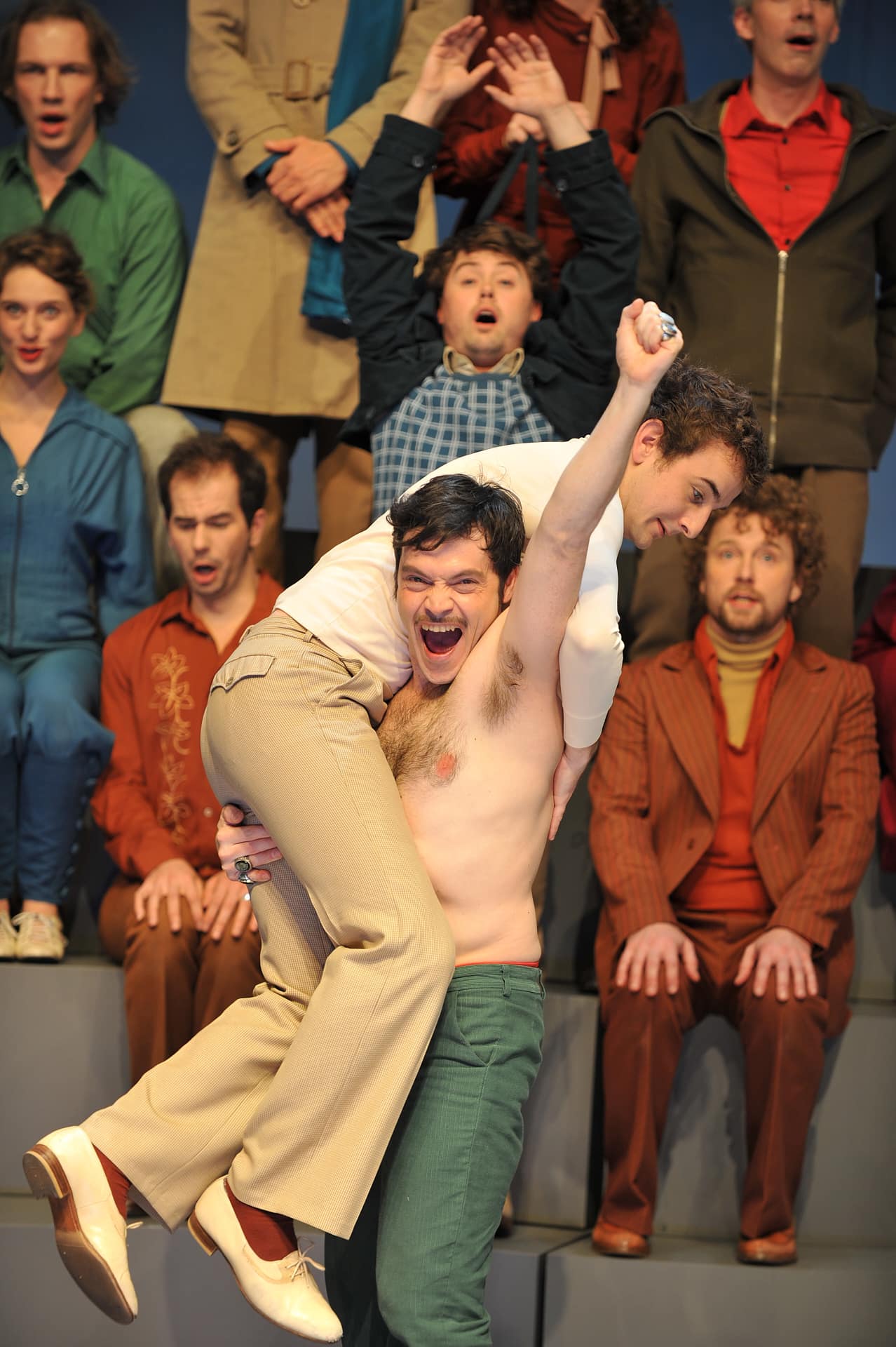 Nico and the Navigators interpretieren Rossini. So recht wusste Gioachino Rossini wohl selbst nicht, was er von seiner „petite messe solennelle“ halten sollte. Ist das nun „heilige“ oder doch eher „verfluchte“ Musik, fragte er sich nach der Beendigung der Komposition – dabei lustig mit der Doppelbedeutung des französischen Wortes „sacré“ spielend. Allein dass Rossini sich diese Frage in einem treuherzig formulierten Brief an Gott stellt, lässt vermuten, dass er sein Werk so heilig nicht fand. Er sei eben ein Mann der „opera buffa“ entschuldigt er sich beim „lieben Gott“ und fügt dann listig an: „Sei also gepriesen und gewähre mir das Paradies“. Eine solchermaßen kecke Forderung wäre einem Anton Bruckner wohl nie über die Lippen gekommen. Es spricht eine bemerkenswerte Angstfreiheit in religiösen Dingen aus Rossinis unverstellten Worten. Im Entstehungsjahr der Messe, 1863, war die katholische Welt schließlich noch weitgehend in Takt. Dieser Angstfreiheit – und dem heiteren Naturell des Komponisten – ist zu verdanken, dass man es bei Rossinis „kleiner“ Messe mit einer ungewöhnlich beschwingten Sakral-Komposition zu tun hat. Das „Cruzifixus“ im „Credo“, wo die Komponisten gewöhnlich auf sinnenfrohe Musikalität verzichten, walzert bei Rossini fast schon ketzerisch vor sich hin, und auch das „Kyrie“ zu Beginn klingt in der Begleitung eher keck als erbarmungsbedürftig. Seltsam bedeutungsvoll und hintergründig Es sind diese Ungereimtheiten, die das komponierte Glaubensbekenntnis gleichzeitig wieder relativieren und die die „petite messe“ so offen für Interpretationen machen. Das Ensemble Nico and the Navigators jedenfalls nutzte diese Offenheit am Mittwochabend im Radialsystem für eine generelle Betrachtung über Glauben und Zweifel: leichtfüßig, phantasievoll, amüsant – und damit in bester Nachfolge Rossinis. Gezeigt wird eine Art Gesamtkunstwerk aus Tanz, Pantomime, Schauspiel und musikalischer Aufführung, das seltsamerweise nie überladen wirkt, obwohl auf der Bühne ziemlich viel passiert (Regie: Nicola Hümpel). In braun-bunter Sechzigerjahre-Kleidung kostümiert, verteilen sich die zwölf Sänger auf der Szene und bilden abwechselnd Wimmelbilder: hier kaut gerade jemand auf einer Rosenblüte herum, da streicht einer dem Vordermann über den Kopf, hier tanzt jemand zur Musik, da steht einer stocksteif am Rand und bewegt stumm den Mund. Das muss man, kann man nicht alles verstehen, und doch wirkt es seltsam bedeutungsvoll und hintergründig. Nur ausnahmsweise greift die Bildsprache der Navigatoren auf klar entzifferbare und dann schnell platte Symbolik zurück, etwa wenn zu Beginn des „Credo“ vor allem Mammon gehuldigt wird, indem fortwährend mit Geldscheinen gewedelt wird oder sich einer der Darsteller mit seiner Anzugjacke selbst geißelt. Verstand und Spiritualität Zusammengehalten wird der Bilderreigen durch eine dezent hinzugefügte Rahmenhandlung. Zwei Gott-Sucher tauchen immer wieder zwischen den einzelnen Abschnitten der Messe auf und fechten den Streit zwischen kühlem Verstand und Spiritualität aus. Letztere, dargestellt in der Person eines weihevoll säuselnden Mönchs (Adrian Gillot), geht am Ende an der zwanghaften Selbstkasteiung zugrunde („Ich habe gestern Abend Schokolade gegessen. Oh Gott, ich bin ein schlechter Mensch“). Andererseits wird der pedantisch-verdruckste Verstandesmensch Benedikt (Peter Fasching) am Ende des Abends ebenfalls nicht wesentlich weiter gekommen sein. Es gibt niemanden auf der Bühne, der an diesem Abend nicht spielt: Auch der Dirigent (Nicholas Jenkins) gibt sich als Schauspieler und leitet die Musik mit pantomimischer Dramatisierung gleichsam aus dem Stück heraus. Das geht trotz der Betriebsamkeit auf der Bühne erstaunlich gut, wobei dem Dirigenten auch die zwölf exzellenten, hellwachen Sänger helfen. Es entsteht ein überschäumendes Gesamtkunstwerk zwischen „heilig“ und „verflucht“ und damit ein Welttheater unterhaltsamster und anregendster Art.
