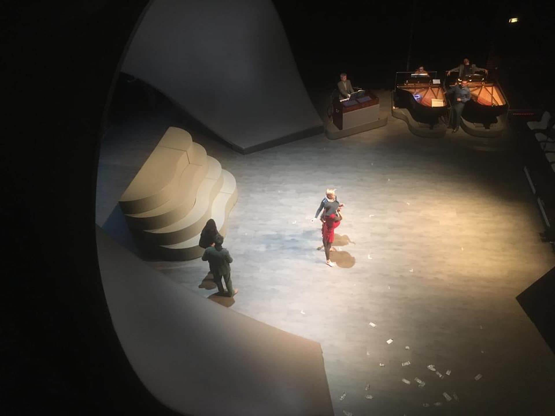 Gioachino Rossinis »Petite messe solennelle« mit Nico and the Navigators in der Erfurter Oper Es ist keine Erfindung der Berliner Theatergruppe Nico and the Navigators, ein sakrales Werk zu vertanzen. John Neumeier hat das schon vor Jahrzehnten mit Bach gemacht. Und natürlich ist Verdis »Messa da Requiem« (wie in der Version von Achim Freyer an der Deutschen Oper Berlin) per se eine Steilvorlage für eine theatralische Aktion welcher Art auch immer. Nike Wagner hat zur aktuellen Ausgabe des von ihr mit kluger Dramaturgie dem eigenen Ururgroßvater Franz Liszt gewidmeten Kunstfestes Weimar »pèlerinages« die Berliner Theatergruppe Nico and the Navigators um die auf Erfolgskurs segelnde Regisseurin Nicola Hümpel mit einer Version von Gioachino Rossinis »Petite messe solennelle« nach Thüringen geholt. Das Stück wurde mit dem Grand Théâtre Luxemburg, den Bregenzer Festspielen, Herrenhausen und der Oper Erfurt koproduziert. Dass nach der Erfurter Premiere und einer Zwischenstation im Berliner Radialsystem auch europaweit damit getourt werden soll, passt zum weltläufigen Europäer Liszt. Mit seiner »Petite messe solennelle« hatte der genießerische Italiener Rossini (1792–1868) – vierunddreißig Jahre, nachdem er sich vom Opern-Komponieren ab-, und dem von erlesenen Speisen zugewandt hatte – seinem Lebenswerk noch eine »ernsthafte« Fußnote nachgereicht. Mit der Begrenzung auf zwei Klaviere (SooJin Anjou und David Zobel) und ein Harmonium (Jan Gerdes) sowie einem Chor in Dutzendstärke (inklusive der vier exzellenten Solisten Laura Mitchell, Ulrike Mayer, Milos Bulajic und Nikolay Borchev) kam man in Erfurt der kargen originalen musikalischen Ausstattung ziemlich nahe. Nicholas Jenkins dirigierte mitten im Geschehen. Die vier Performer/Tänzer der Hümpel-Truppe (Peter Fasching, Adrian Gillott, Patric Schott und Yui Kawaguchi) zogen dem musikalisch assoziativen Spiel narrative Leitplanken ein. Dass es bei der Übersetzung von Kyrie, Gloria, Credo und Sanctus in Bildertheater nicht um die bloße Illustration religiöser Erbauung geht, versteht sich von selbst. Was im Untertitel einen Zacken zu ambitioniert »Glaubensbekenntnisse des 21. Jahrhunderts« genannt wird, ist freilich kein atheistischer Frontalangriff auf Glauben oder Kirche geworden. Obwohl sogar der Papst vorkommt in einem der sketchartigen, die Musiknummern verbindenden, meist amüsanten Wortgefechte zwischen einem alles hinterfragenden jungen Mann und einem alles verteidigenden Kuttenträger. Der Ältere, der sich wohl selbst als den personifizierten Glauben begreift, erscheint am Ende, ganz von weißem Licht und Wolken umflutet, in der geöffneten Himmelspforte unter dem schwungvollen Bogen, mit dem Oliver Proske die Spielfläche überwölbt hat. So wie die Protagonisten bewegen sich hier auch die Klaviere um eine Art Empfangstheke. Aus ihren Elementen kann man eine Treppe für ein Gruppenbild zum »Amen« formieren oder sie einzeln als Wippe beim Diskutieren als zusätzliches »Argument« verwenden, was zu den ironisch dynamischen Bildern dieser Collage gehört. Ansonsten schwebt vor allem eine leise, manchmal auch grelle, ironische Skepsis gegenüber der Echtheit heutiger Bekenntnisrituale über der Szene – etwa, wenn sich die beiden höchst attraktiven Damen Laura Mitchell (Sopran) und Ulrike Meyer (Mezzo) beim Gloria ein Duell an der Rampe liefern, bei dem sie nicht nur mit Stimmeinsatz, sondern auch mit Augenaufschlag und ihren Beinen zu punkten versuchen. Oder wenn eine andere Dame mit Riesenschwinger nur von einem exzessiv ausgeweiteten Dauer-»Amen« abzubringen ist, indem man ihr mit einen paar Scheinen das Maul stopft. Wenn über das »Credo« ein allgemeines Geldzählen gelegt wird, dann weiß wohl jeder, was gemeint ist. Irgendwann vermisst der Logiker im Stück die Unendlichkeit – in Lichtjahren bis zum Mond, zur Sonne, zur nächsten Galaxie. Ob sich Gott dort finden lässt, bleibt am Ende ebenso offen wie seine Gegenwart auf Erden. Die Musik ist dafür allemal ein geeignetes Reisegefährt. Und der Papst? Der kommt demnächst persönlich nach Erfurt. »Did you see the pope?«, wurde jetzt schon mal gefragt.
