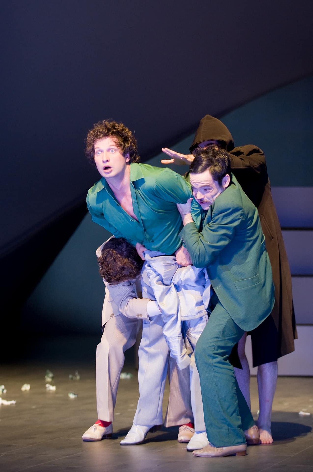 Es war nicht überraschend, dass die Theatertruppe Nico and the Navigators wieder im Rahmen der Bregenzer Festspiele zu erleben ist, das Ensemble um Nicola Hümpel zählt nämlich zum Besten, was die deutsche Musiktheaterszene - die innovative, versteht sich - zu bieten hat. Spannend war die Tatsache, dass der stets auf Neues setzende Intendant David Pountney und seine "Kunst aus der Zeit"-Leiterin Laura Berman heuer mit einer alten Rossini Messe daherkamen. Die Erwartungen bezüglich einer nicht nur neuen, sondern auch überraschenden Gewandung hatten sich gestern Abend auf der sehr gut besetzten Werkstattbühne beim Festspielhaus jedoch erfüllt. Und insofern ist es auch nicht tragisch, dass die "Petite Messe solennelle" schon an einigen Orten zu sehen war, bevor sie - als österreichische Erstaufführung – auf der Werkstattbüne beim Festspielhaus im Zentrum eines heuer gestrafften KAZ Programms landete. Frisch mutet ohnehin alles an, was Nicola Hümpel (Regie), Nicholas Jenkins (Musik) und Oliver Proske (Ausstattung) angehen. Als Gruppe, die zwar nicht auf das Clowneske, aber stets auf einen tiefgründigen und manchmal auch abgrundtiefen Humor setzt, um Sakralwerke einen Bogen zu machen, gilt hier nicht. Augenzwinkernd bebildert Von Ehrfurcht gehemmt war ja auch Gioachino Rossini nicht, als er Jahre, nachdem er das Komponieren schon ad acta gelegt hatte und sich mehr dem Kochen widmete, der Bitte eines Grafenpaares nach einer Messe nachkam. Dass das 1864 uraufgeführte, gar nicht so kleine, außergewöhnlich instrumentierte Werk den Schöpfer vieler unterhaltsamer Opern nicht leugnet, rechtfertigt auch jene augenzwinkernd bebilderte Auseinandersetzung, zu der sich die Navigators vor einigen Monaten entschlossen hatten. Dürfen Glaubensfragen zum Klang einer traditionell nach der Liturgie gegliederten Messe gestellt werden? Die Antwort lautet Ja, und zwar ohne Einschränkung. Nicola Hümpel begeht ja nicht den Fehler, sich damit in Katholizismuskritik zu versteigen. Die Figur eines Wissenschaftlers wird eingeführt und der eines Paters gegenubergestellt. Statt eines textreichen Diskurses gibt es einige, die Messe ergänzende Textfetzen und vor allem Körpertheater, das derart poesievoll daherkommt, dass man sich spontan der Meinung anschließt, dass gescheite Fragen gar keiner Antwort bedurfen. Wer sich auf diesen tänzerisch ungemein spannend angetriebenen Mechanismus einlässt, der erlebt das Erwachen der Sinne, das diese Truppe aufzeigt, mit. Eine Chorchoreografie wächst hier zum großen Theater heran, das sich nicht zum szenischen Oratorium aufbauscht, sondern viele kleine, aber bedeutende Einzelmomente enthält.