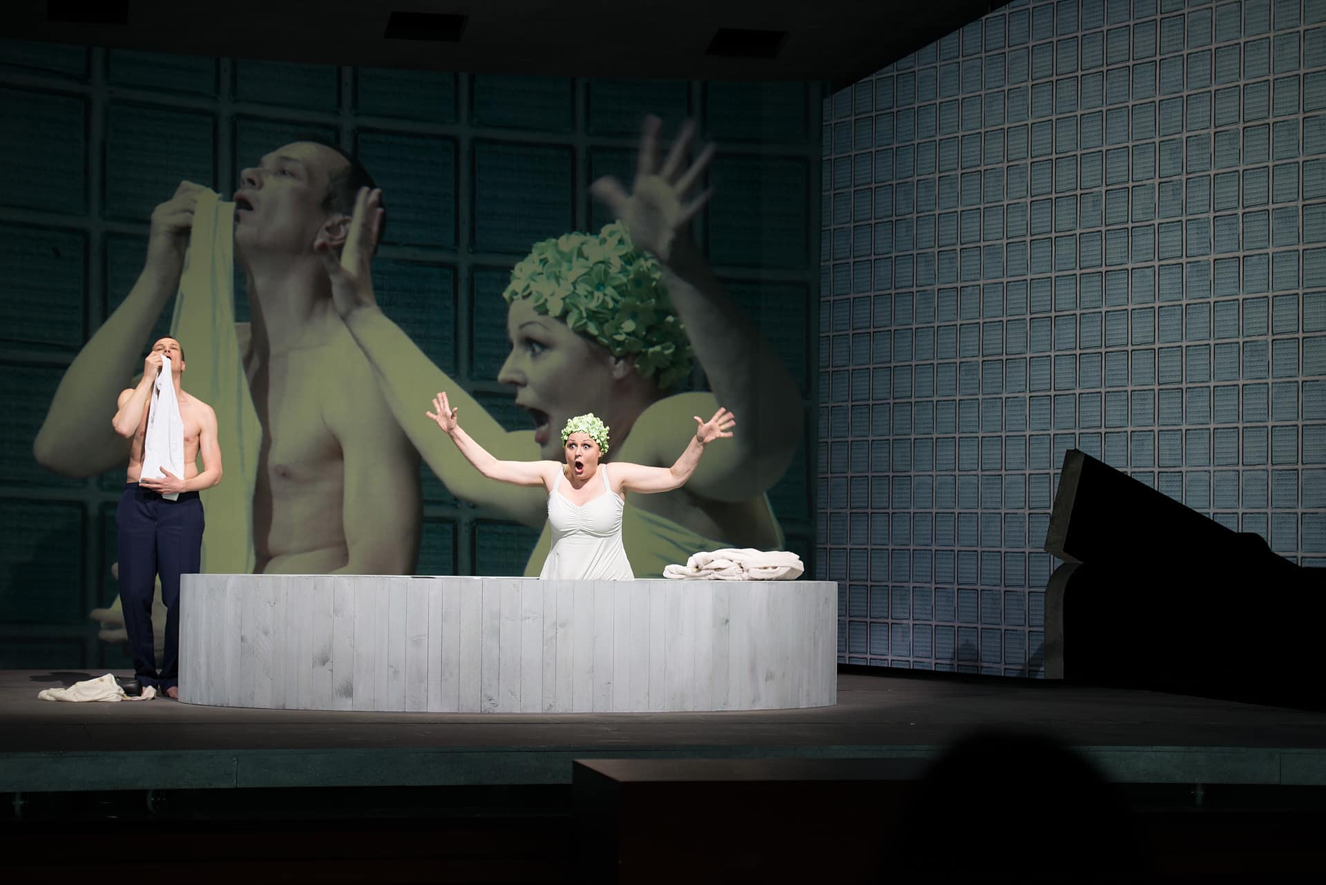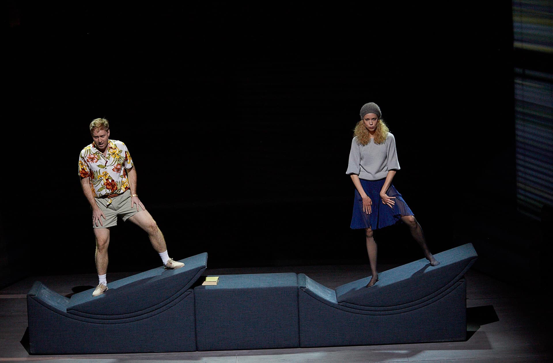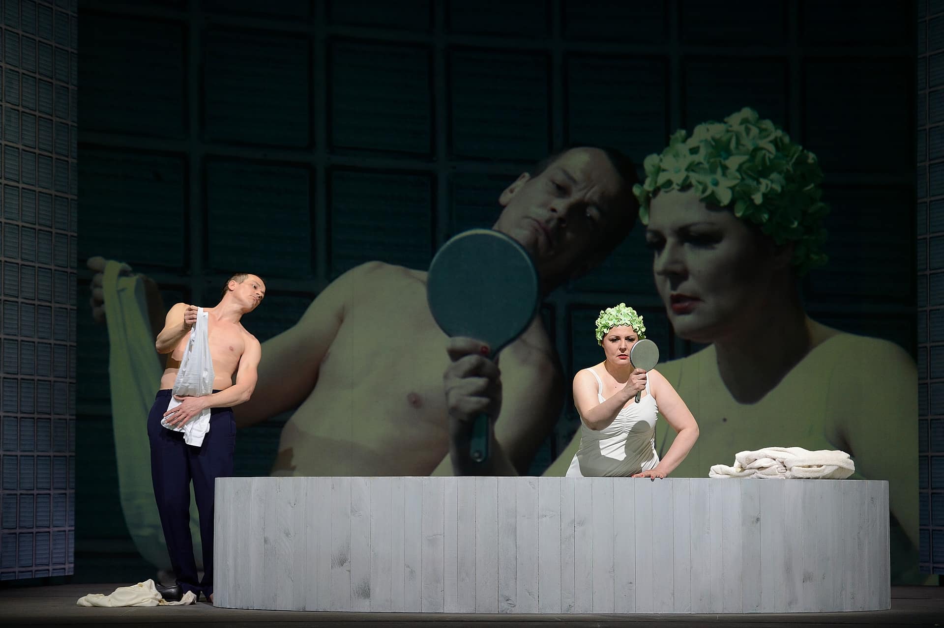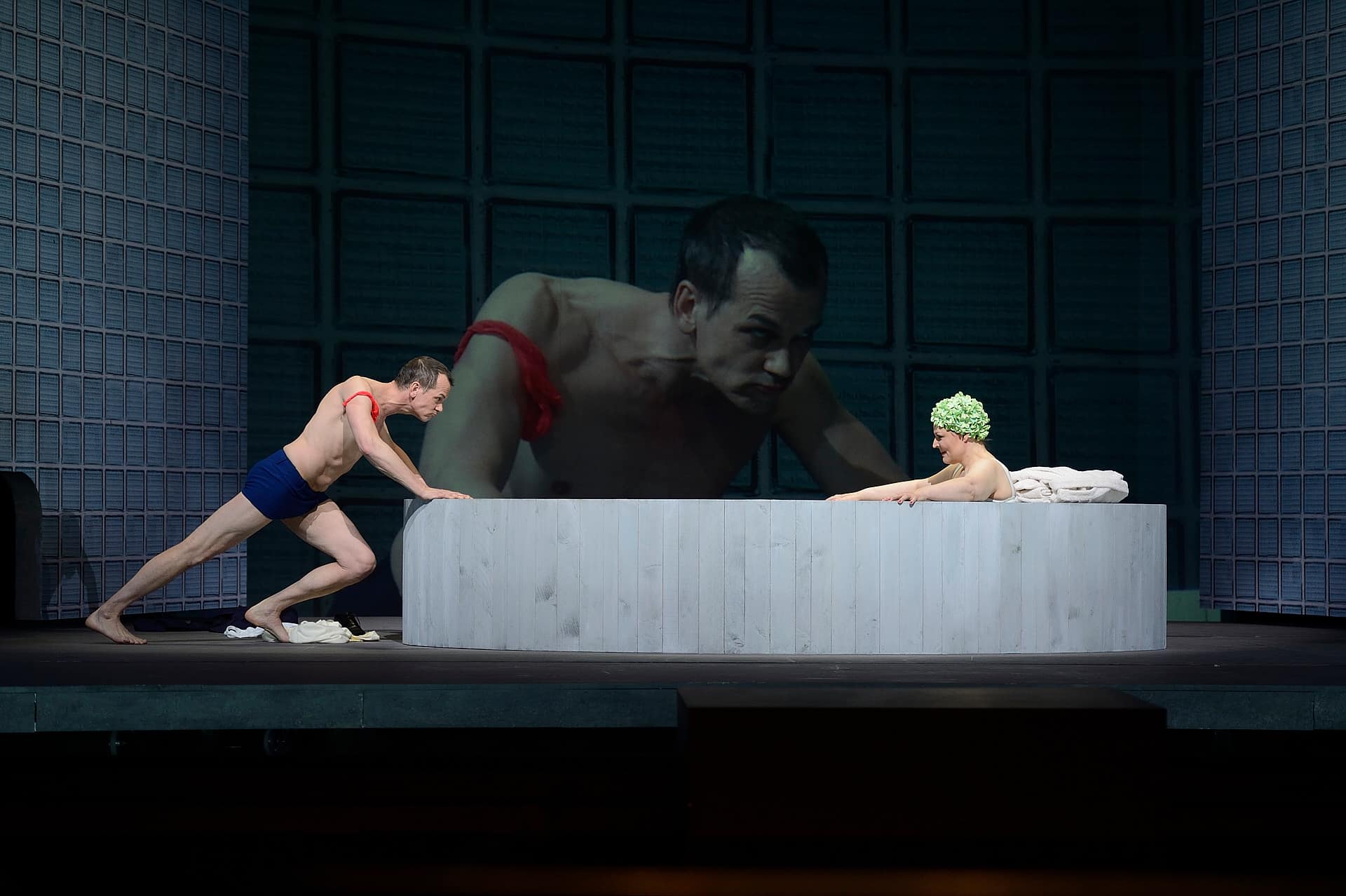 …zugängliche, lichte, immer wieder auch ironische Musik, die blitzschnell umschaltet zwischen Pathos und Lakonie…. Die Regisseurin Nicola Hümpel vom Berliner Musiktheaterensemble „Nico and the Navigators“ greift diese musikalische Ironie auch szenisch auf, was dem umjubelten Premierenabend eine Leichtigkeit verleiht und mehrfach lautes Lachen im Publikum provoziert. Dass sich neben der Drehbühne auch musikalisch manches im Kreis dreht und die eine oder andere Szene Längen hat, ist der Vorlage geschuldet. Handwerklich ist diese Musiktheaterproduktion perfekt gearbeitet. Und auch im Orchestergraben herrscht Präzision.