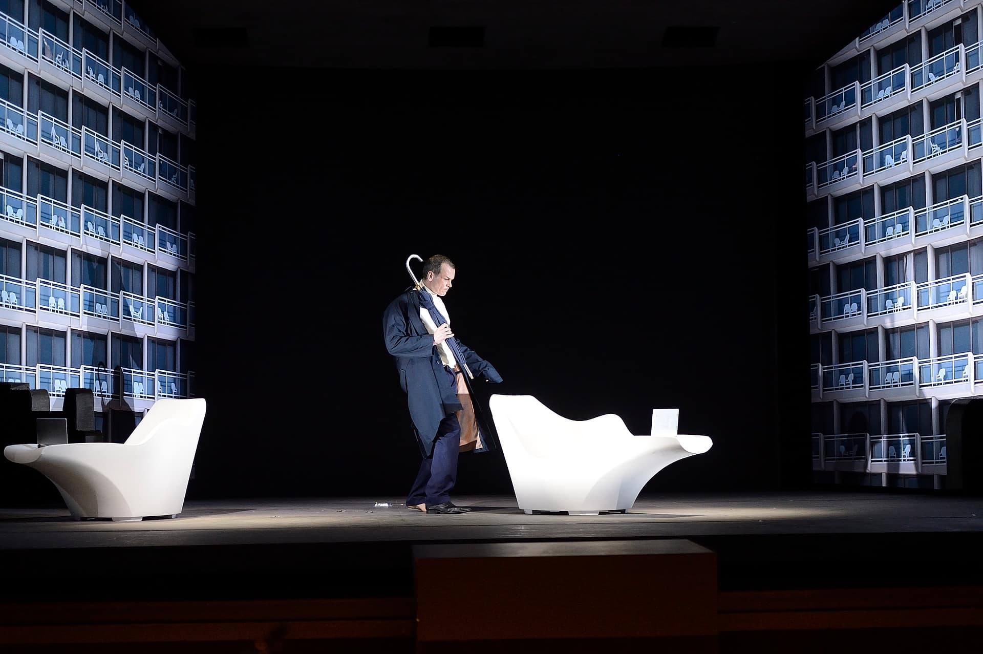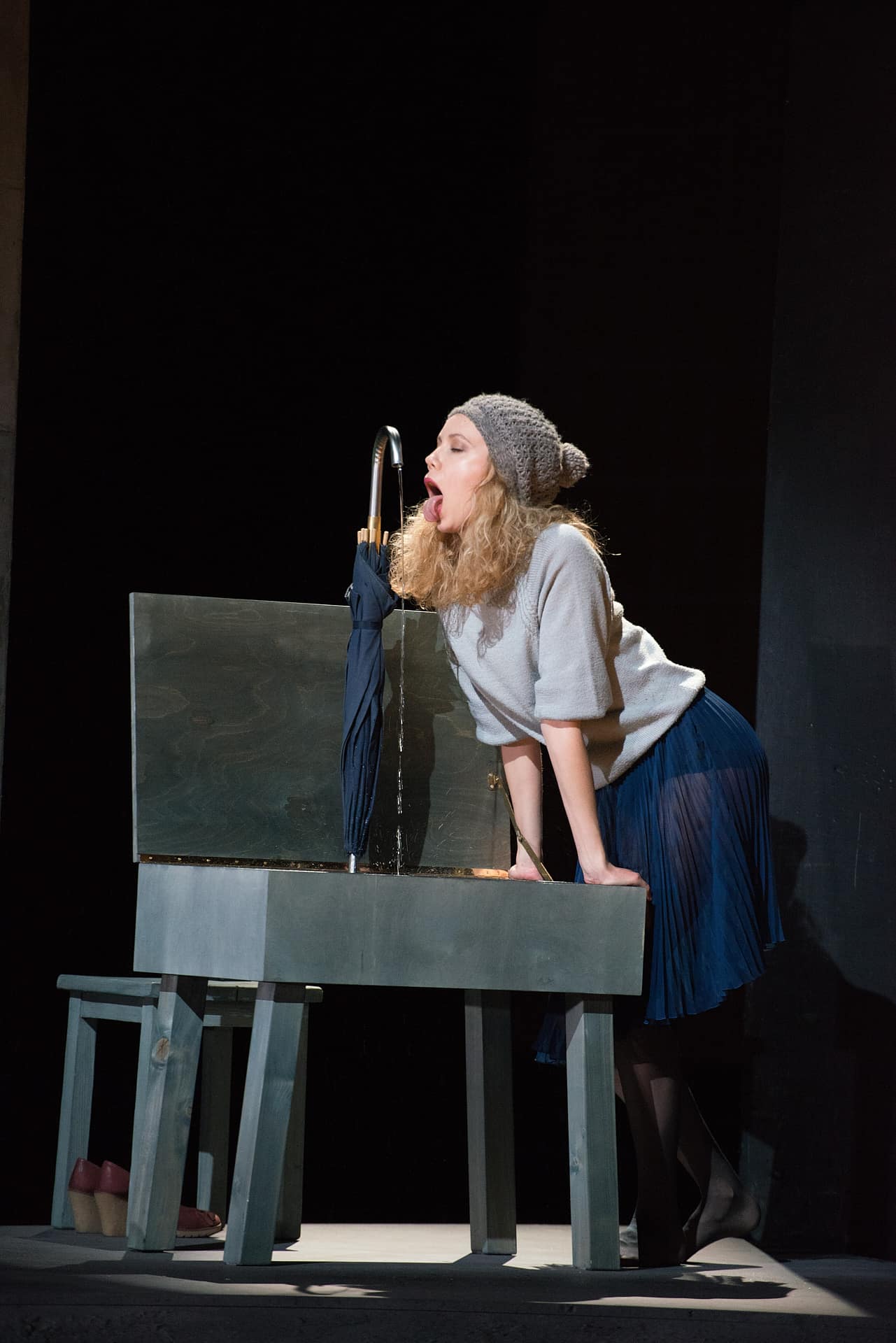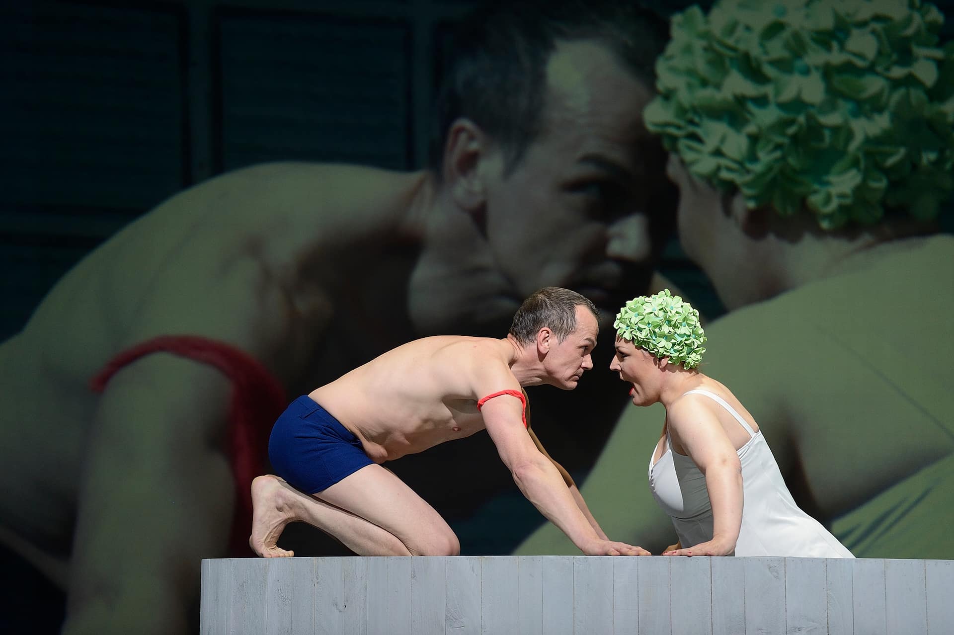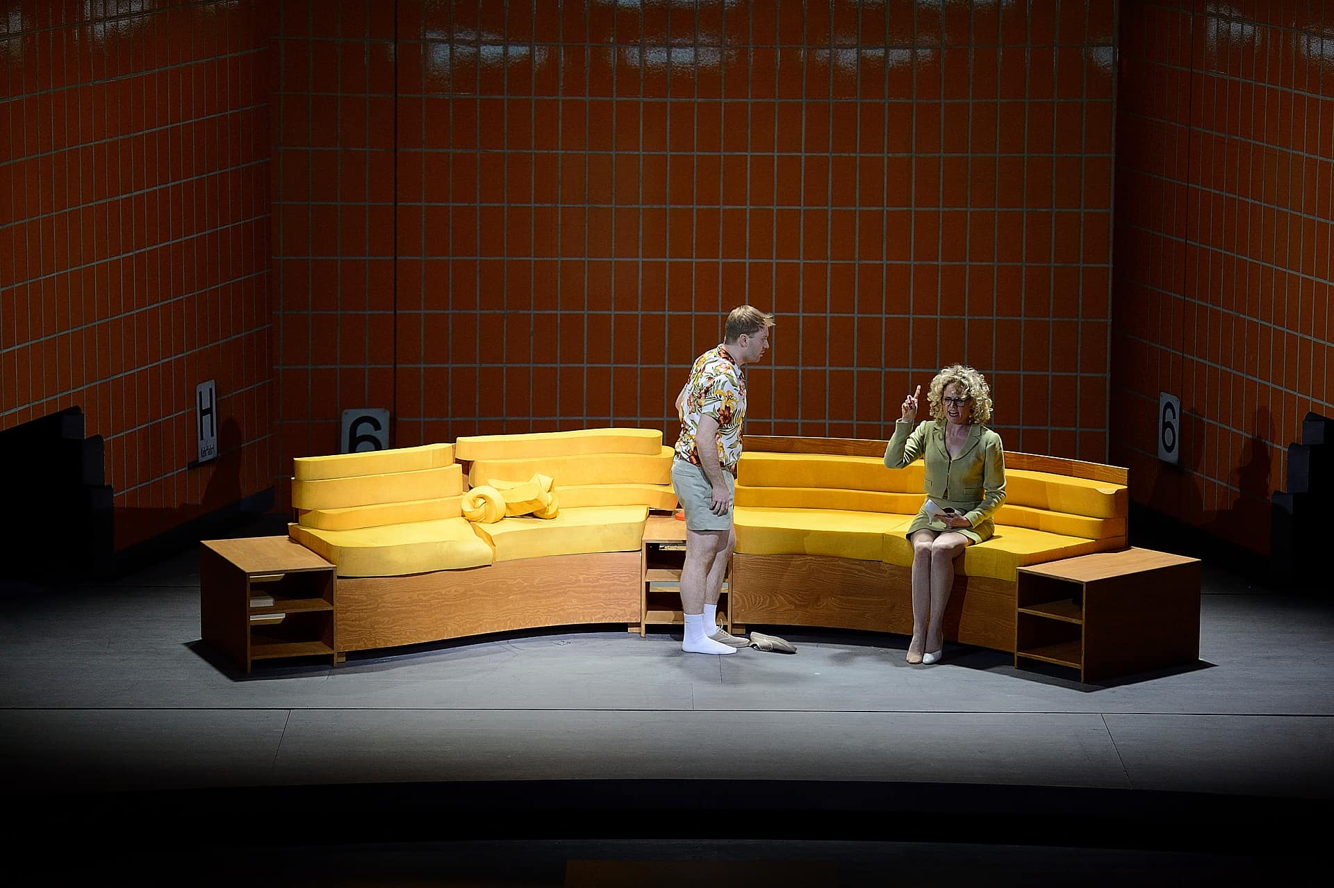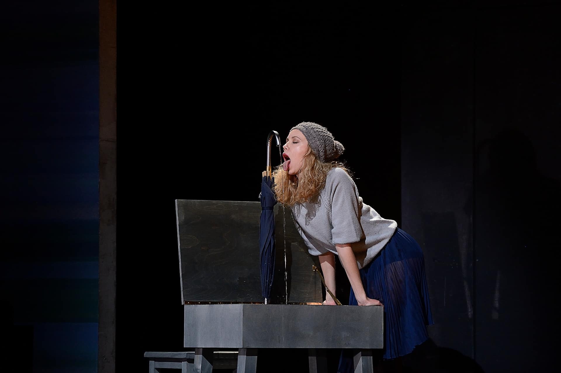 …zugängliche, lichte, immer wieder auch ironische Musik, die blitzschnell umschaltet zwischen Pathos und Lakonie…. Die Regisseurin Nicola Hümpel vom Berliner Musiktheaterensemble „Nico and the Navigators“ greift diese musikalische Ironie auch szenisch auf, was dem umjubelten Premierenabend eine Leichtigkeit verleiht und mehrfach lautes Lachen im Publikum provoziert. Dass sich neben der Drehbühne auch musikalisch manches im Kreis dreht und die eine oder andere Szene Längen hat, ist der Vorlage geschuldet. Handwerklich ist diese Musiktheaterproduktion perfekt gearbeitet. Und auch im Orchestergraben herrscht Präzision.