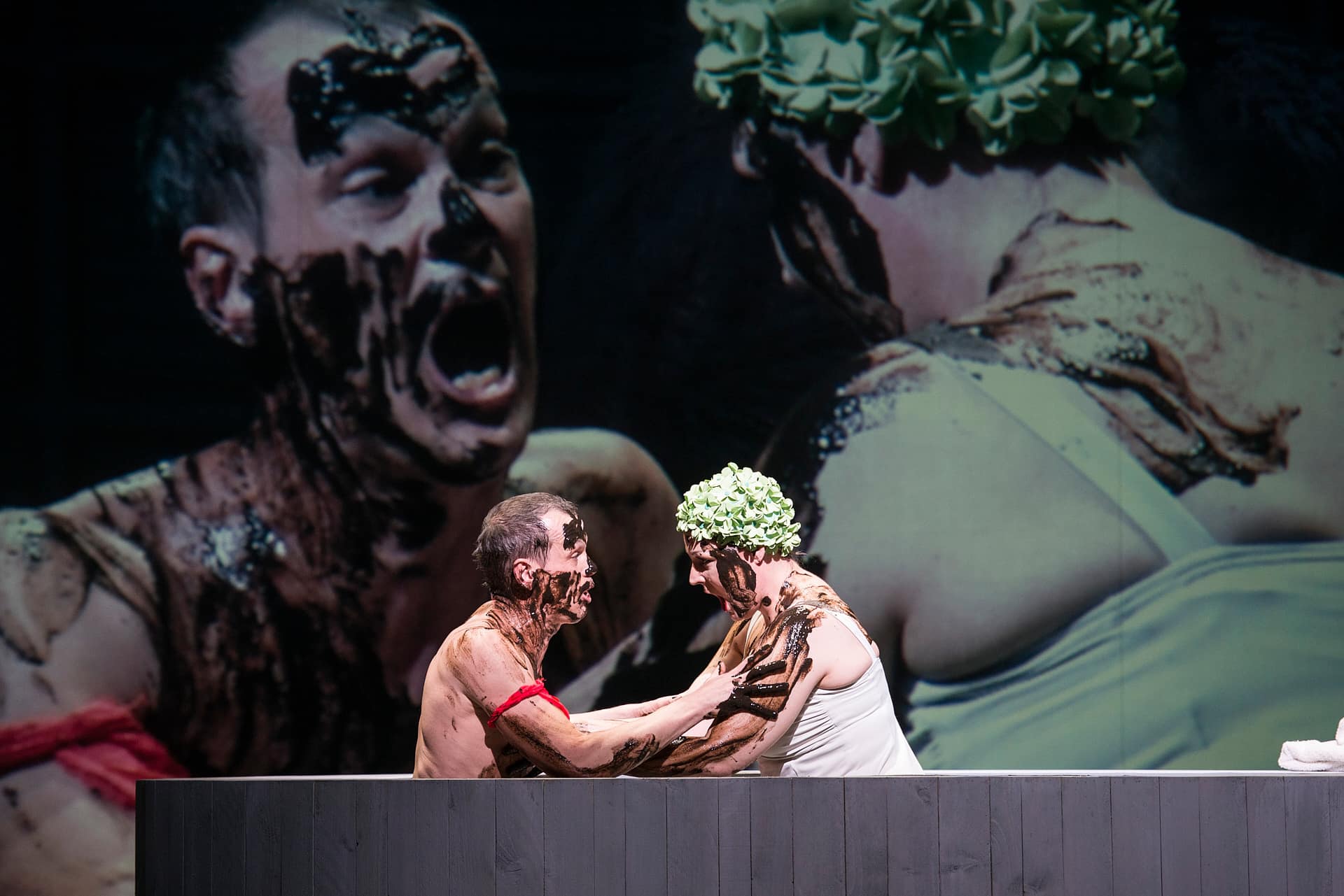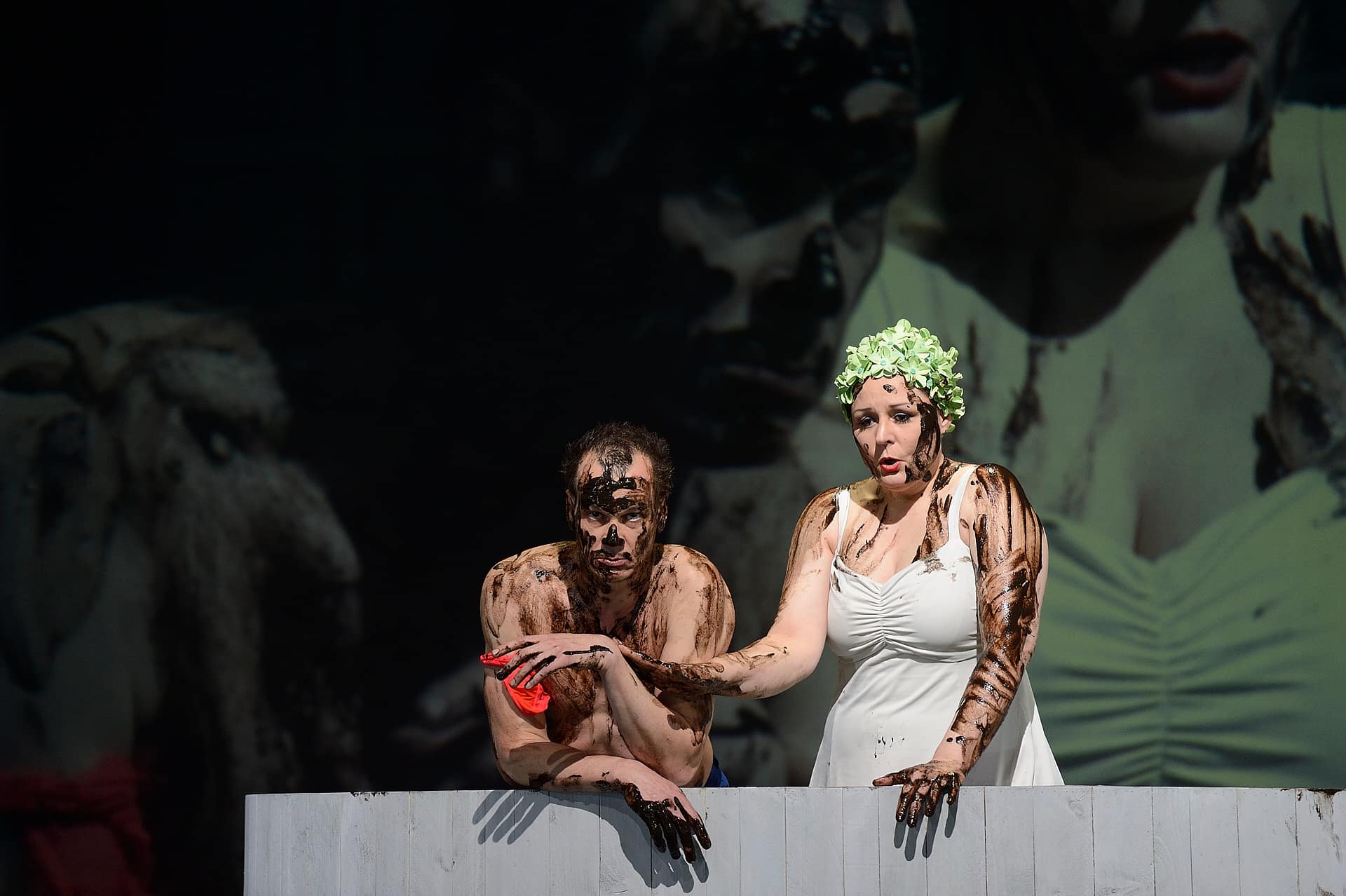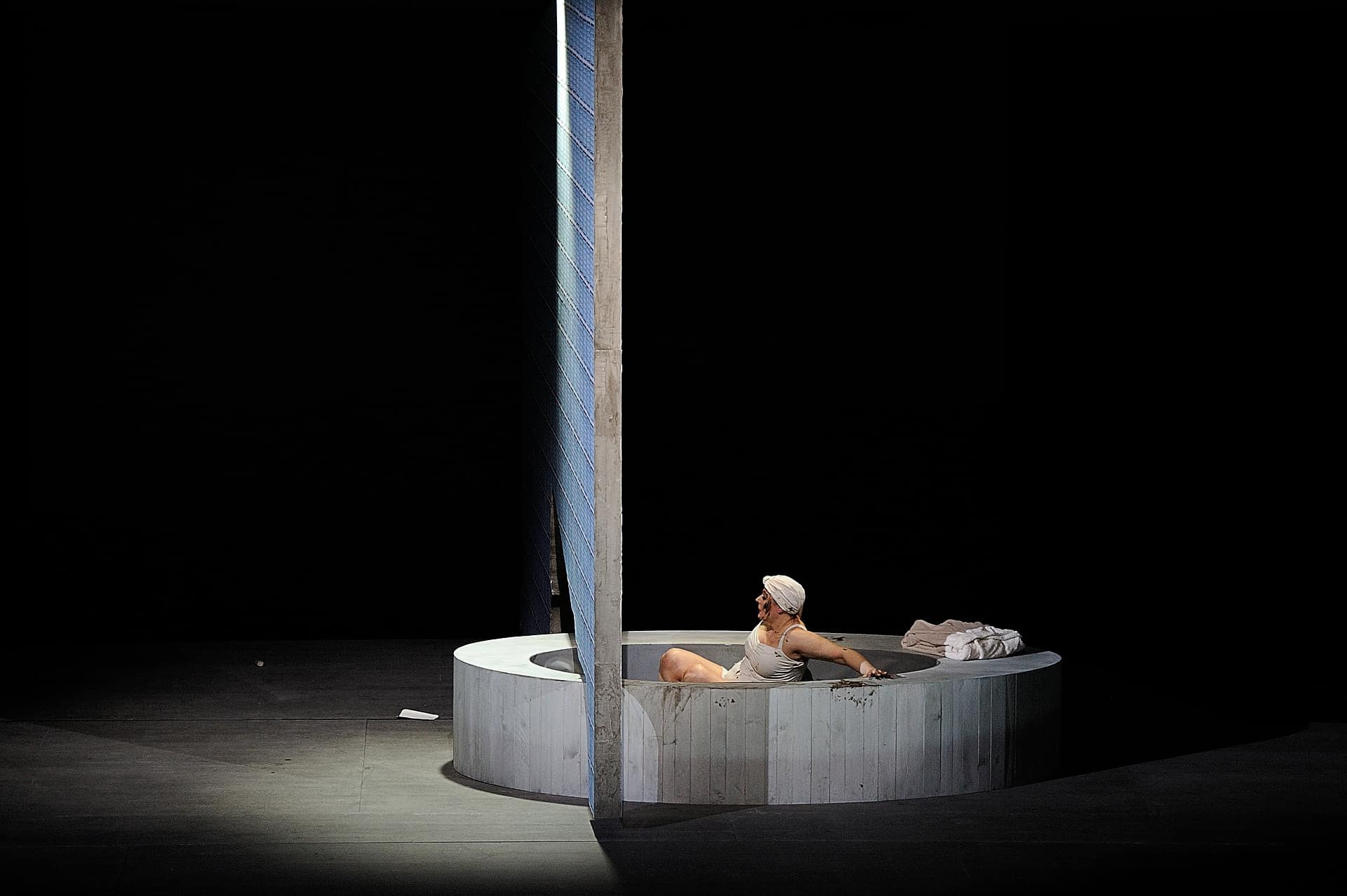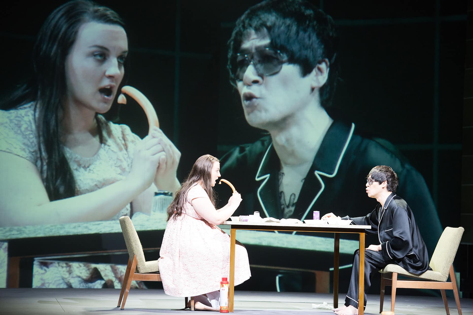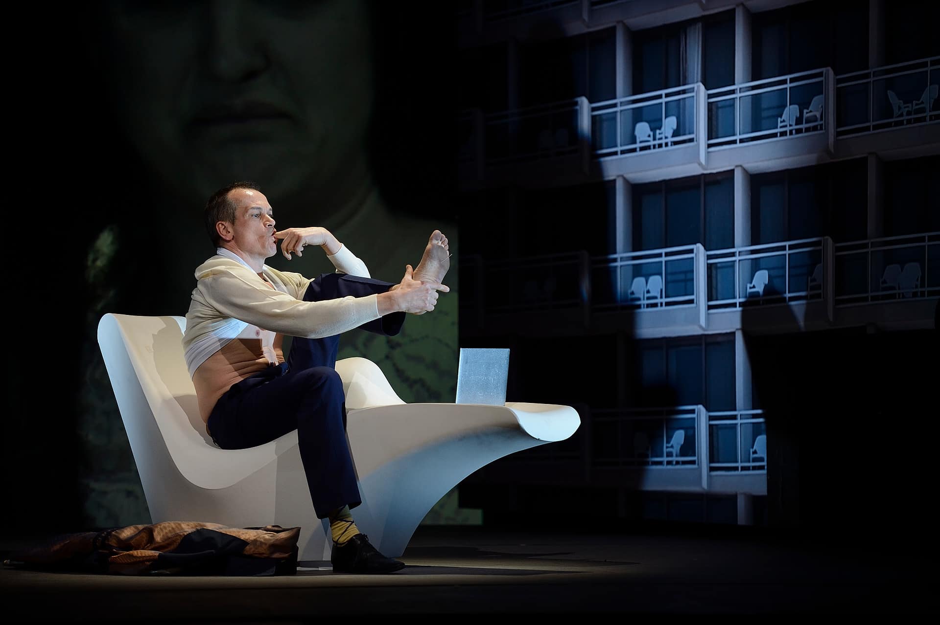 …zugängliche, lichte, immer wieder auch ironische Musik, die blitzschnell umschaltet zwischen Pathos und Lakonie…. Die Regisseurin Nicola Hümpel vom Berliner Musiktheaterensemble „Nico and the Navigators“ greift diese musikalische Ironie auch szenisch auf, was dem umjubelten Premierenabend eine Leichtigkeit verleiht und mehrfach lautes Lachen im Publikum provoziert. Dass sich neben der Drehbühne auch musikalisch manches im Kreis dreht und die eine oder andere Szene Längen hat, ist der Vorlage geschuldet. Handwerklich ist diese Musiktheaterproduktion perfekt gearbeitet. Und auch im Orchestergraben herrscht Präzision.