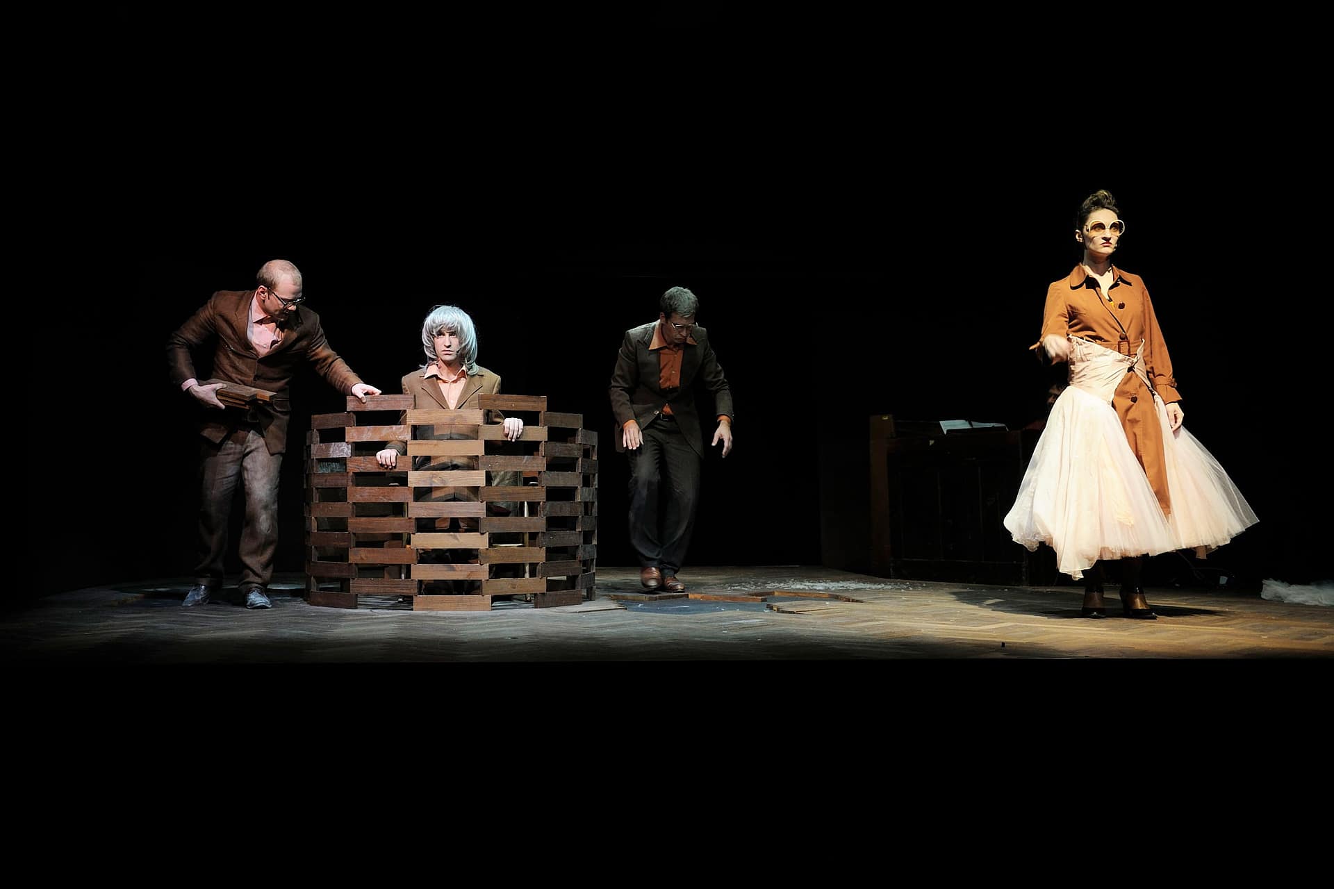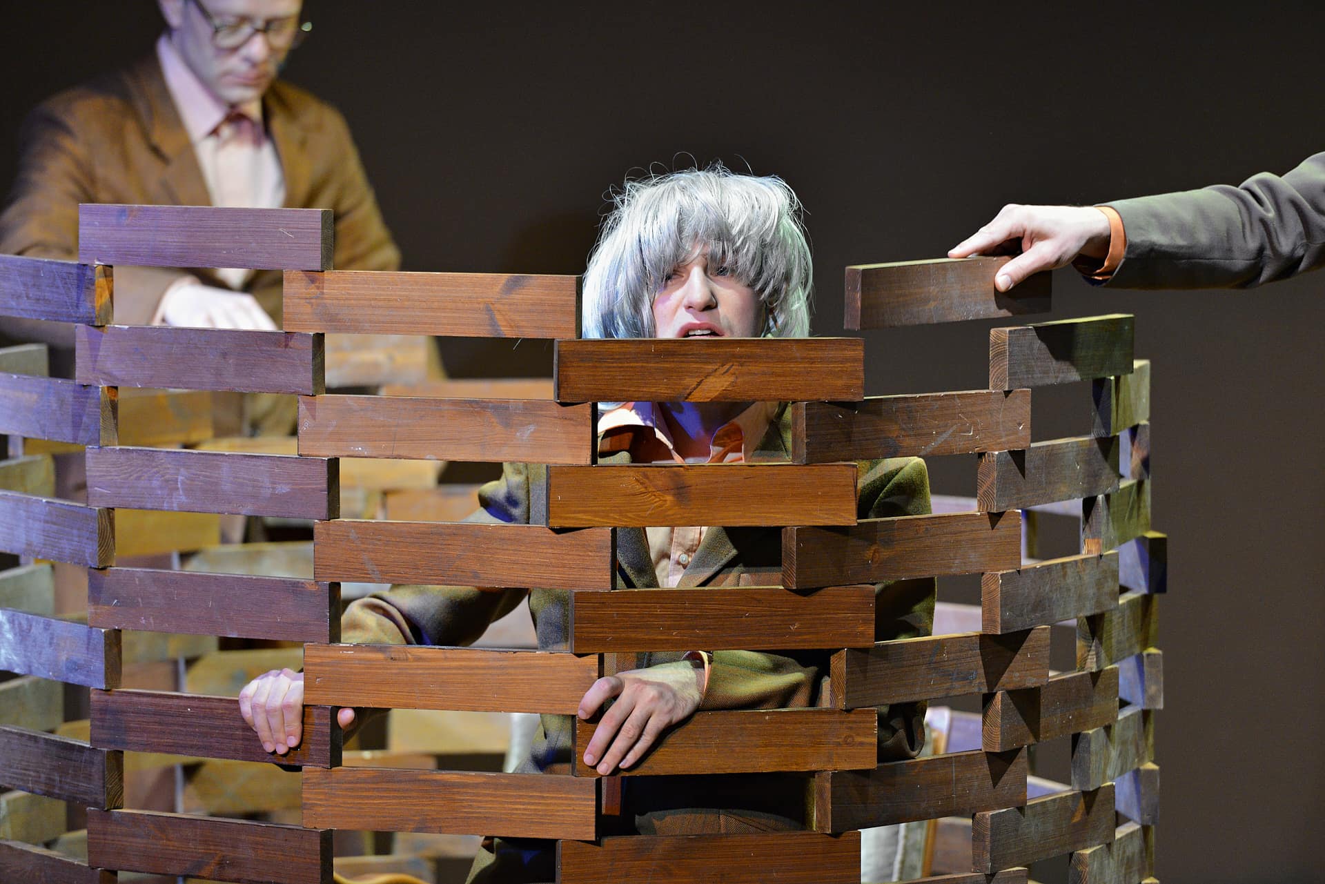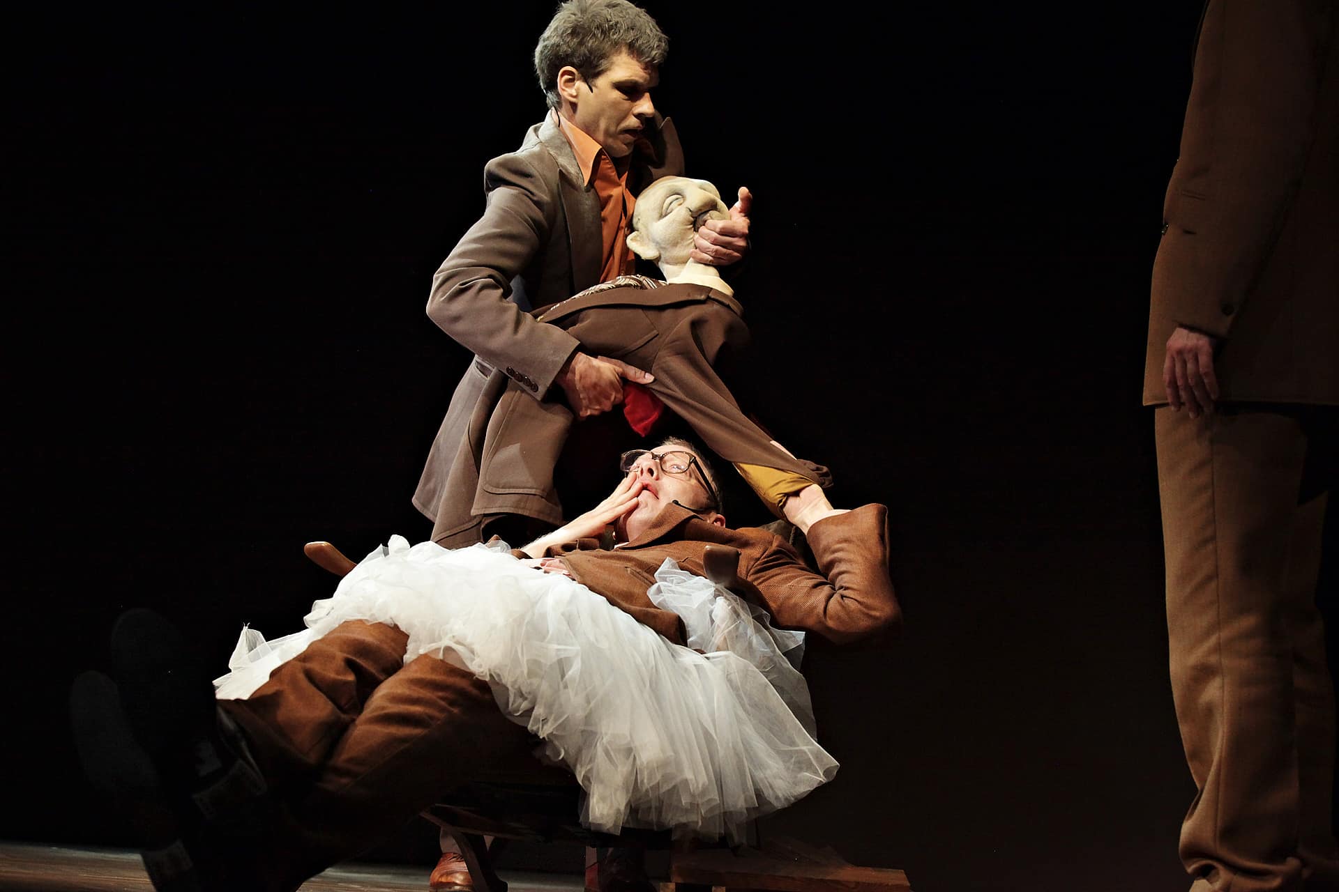 Von den 154 Sonetten Shakespeares habe ich nur 4 verstanden… Die habe ich mir in dem Bändchen mit Lesezeichen eingemerkt. Bei allen anderen fühlte ich mich wie damals im Abitur, als ich ein Sonett interpretieren sollte und nichts verstanden habe. Ich habe geschrieben: Der Text ist unverständlich, nebulös und holpert – und bekam dafür eine 6″, seufzt ein frustrierter Schauspieler auf der Bühne des Radialsystems. Die für ihre innovativen Inszenierungen bekannte Gruppe Nico and the Navigators versuchte in ihrer ersten Koproduktion mit dem Puppentheater Halle/Saale eine Annäherung an die berühmten Gedichte, die zu den am schwersten zu übersetzenden Werken der Weltliteratur gehören. Wie unergründlich manche Passagen sind, demonstrieren die Schauspieler in einer Szene, als sie mehrere stark abweichende Übersetzungen nebeneinander legen. So bleibt es bei einer schrittweisen Annäherung und Umkreisung. Der native speaker Charles Adrian Gillott trägt ausgewählte Stücke im Original vor, seine deutschen Kollegen oder die griesgrämige alte Puppe, die sich immer wieder einklinkt, legen die übersetzte Version nach. Gerade als das Ensemble in Fahrt kommt und die stärksten Szenen, z.B. die Einmauerung eines Akteurs mit aus dem Parkett gerissenen Klötzen, mit der größten Spielfreude entwirft, ist der kurzweilige Abend nach 70 Minuten leider auch schon wieder zu Ende.
