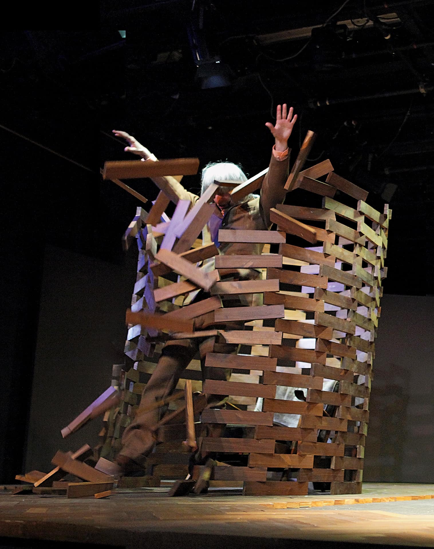 „Gerade als das Ensemble in Fahrt kommt und die stärksten Szenen, z.B. die Einmauerung eines Akteurs mit aus dem Parkett gerissenen Klötzen, mit der größten Spielfreude entwirft, ist der kurzweilige Abend nach 70 Minuten leider auch schon wieder zu Ende.“