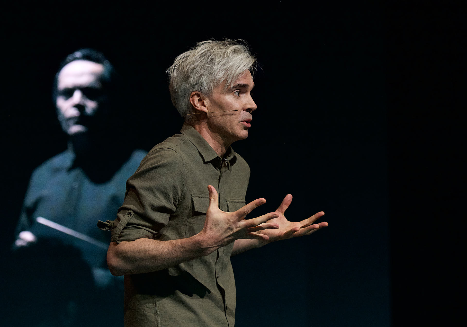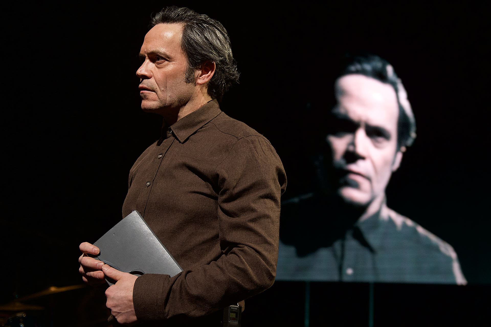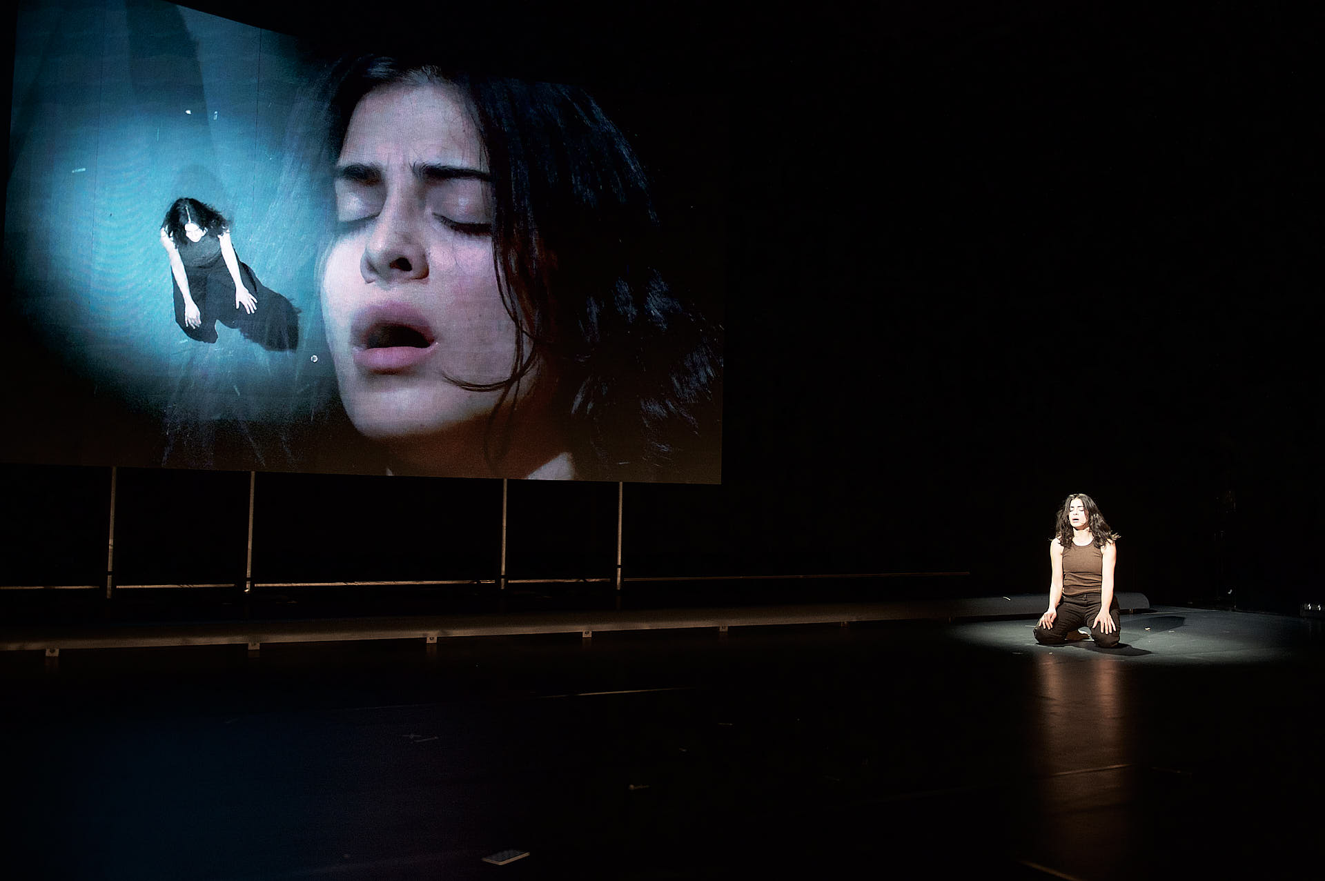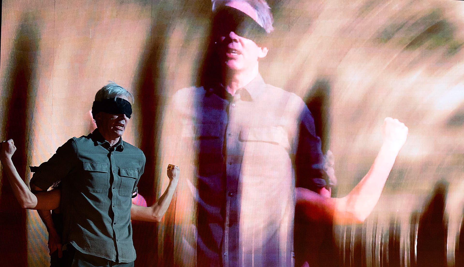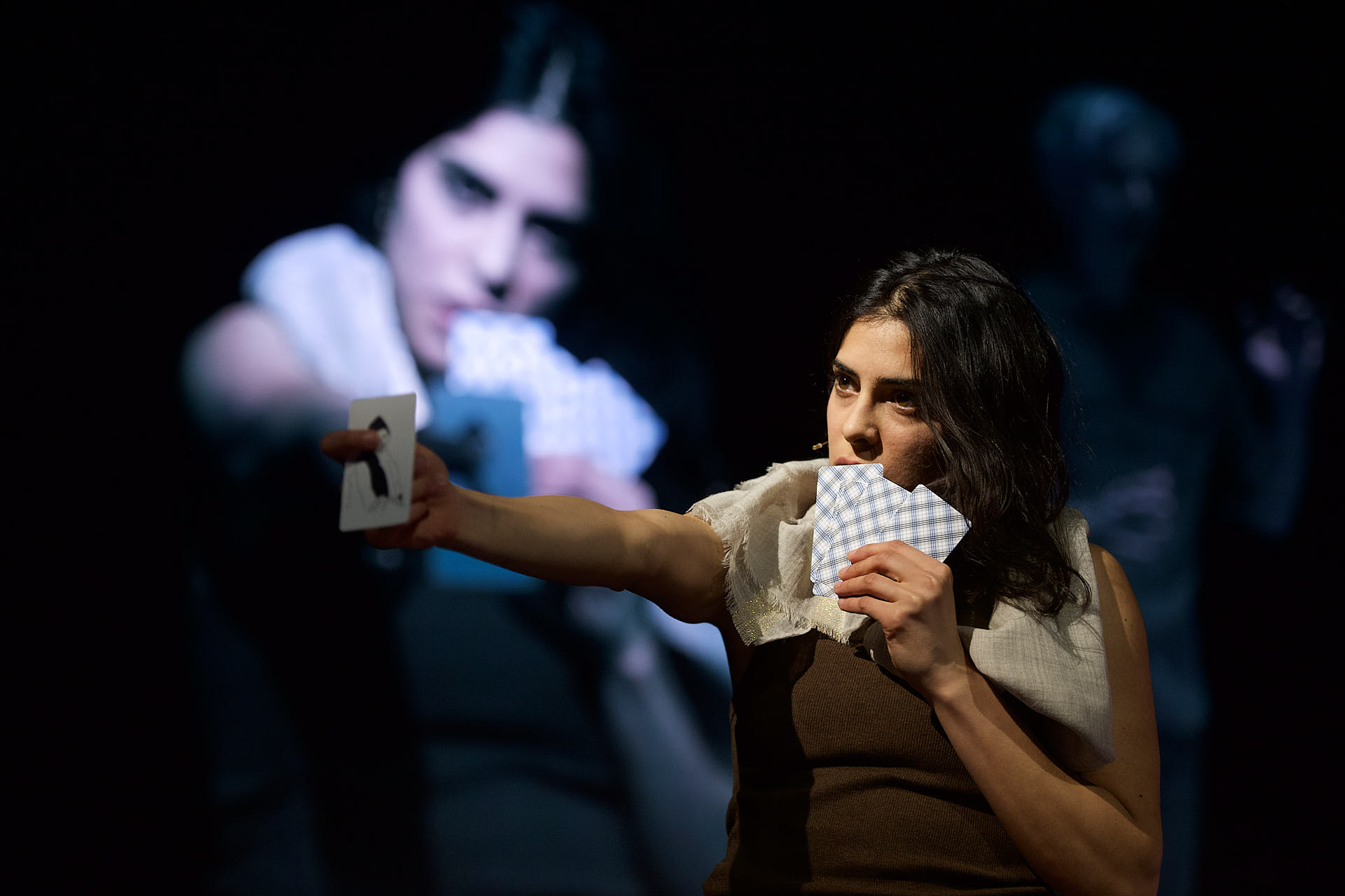 The dancers, actors and musicians are all dressed in muted shades of brown to match the mood. They all look into the cameras on stage and are mixed live on the video screen in relation to each other. Abstract video images in which the performers appear and disappear are also shown repeatedly.