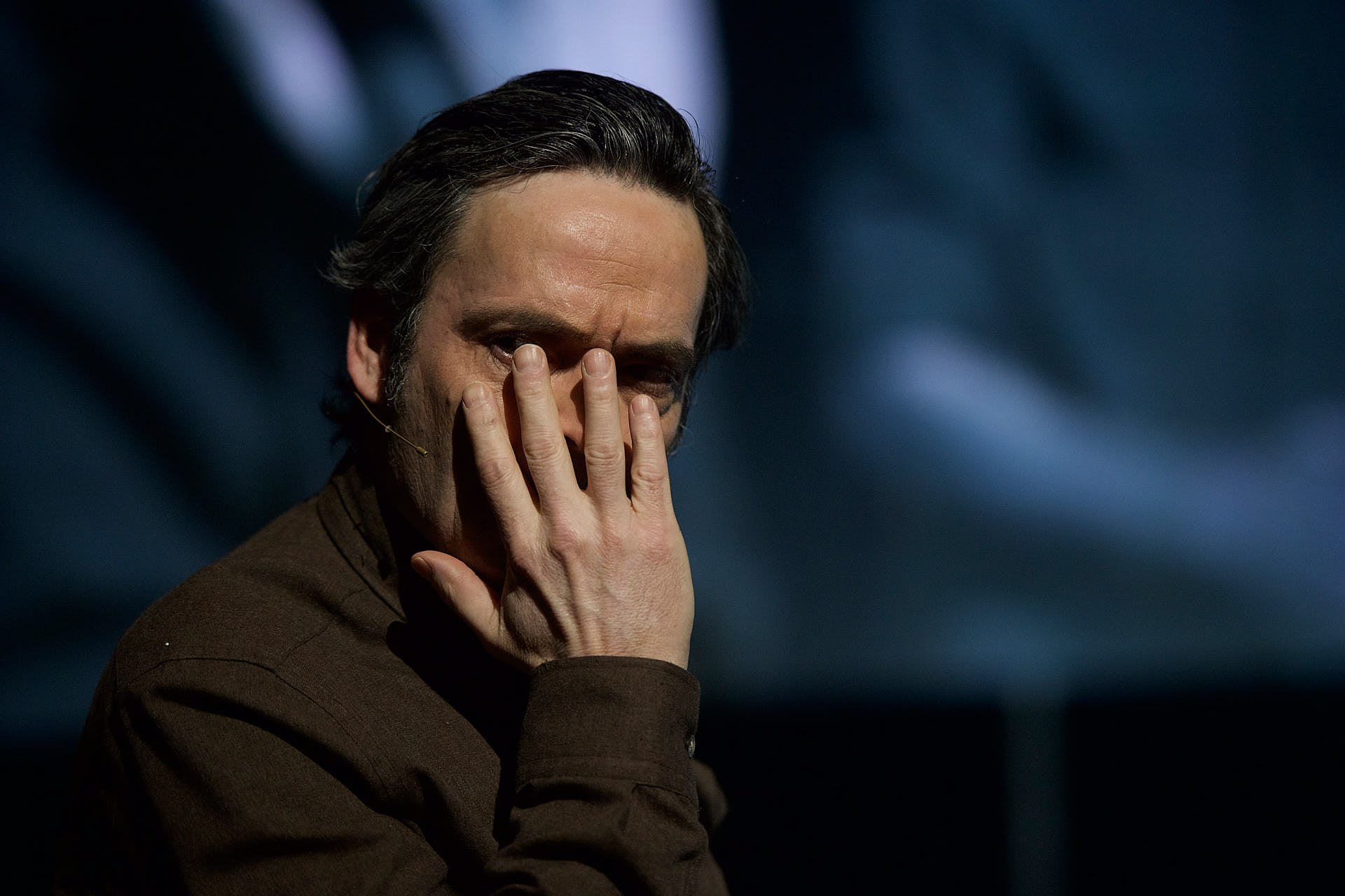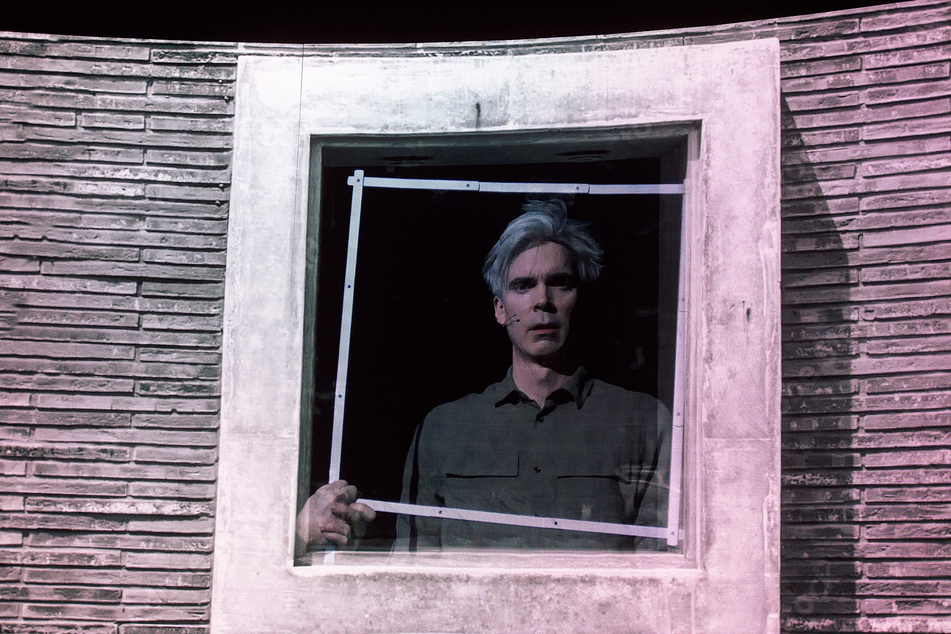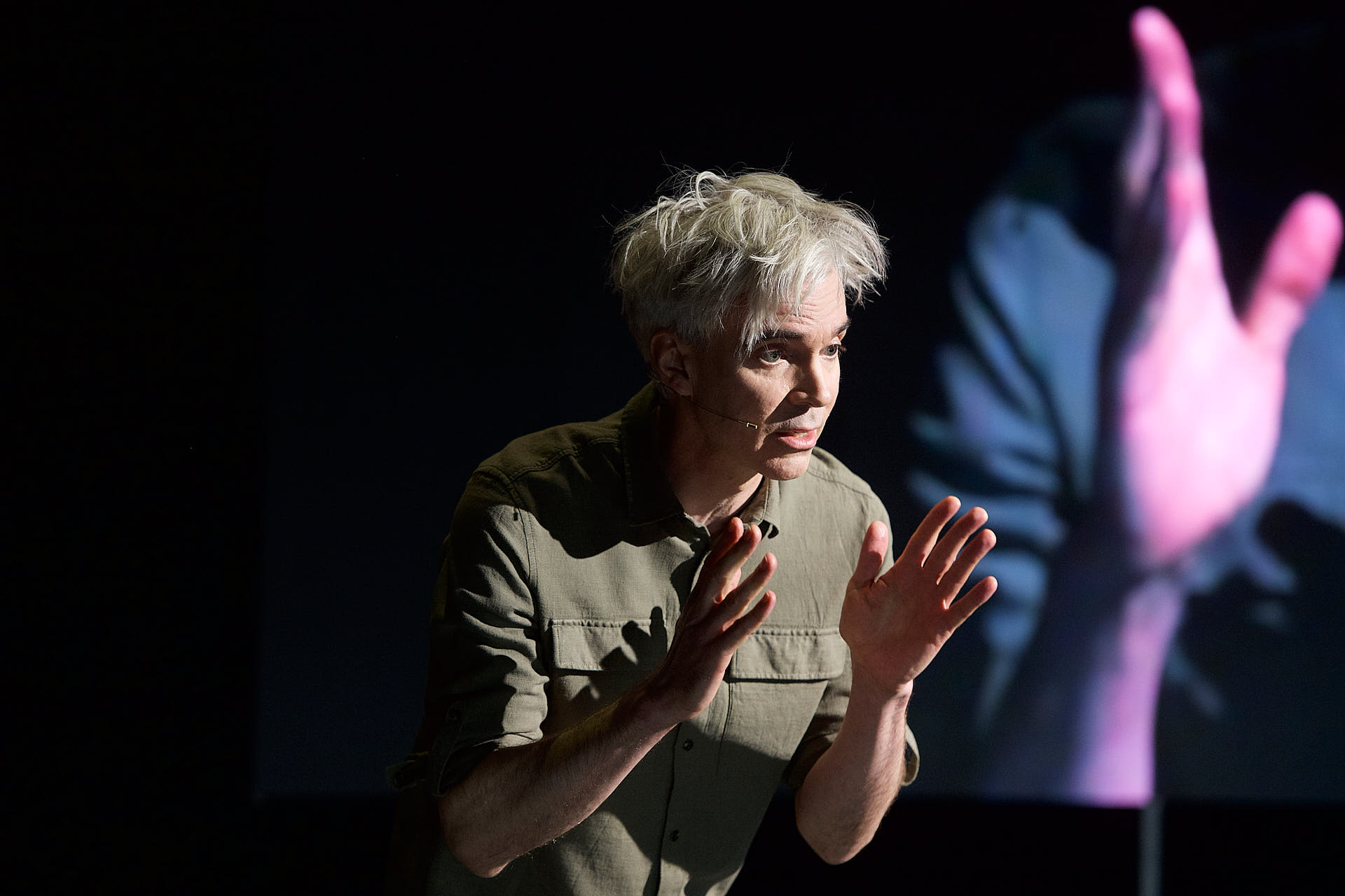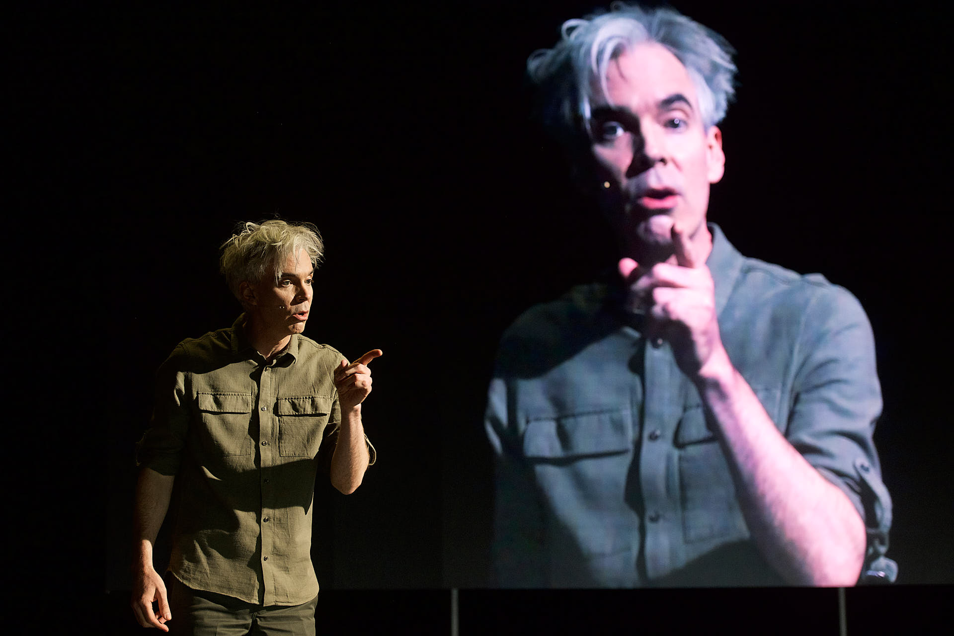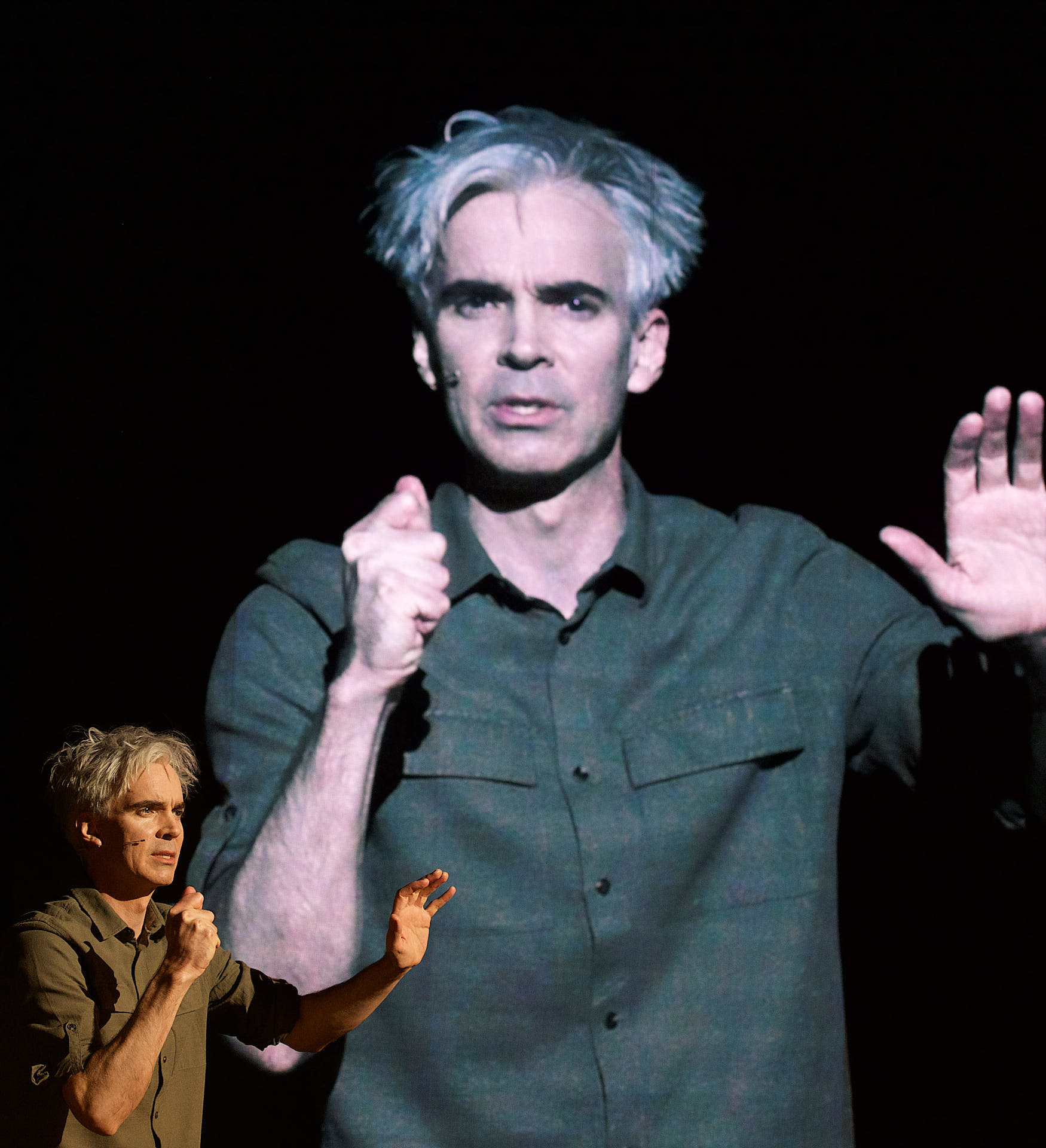 The dancers, actors and musicians are all dressed in muted shades of brown to match the mood. They all look into the cameras on stage and are mixed live on the video screen in relation to each other. Abstract video images in which the performers appear and disappear are also shown repeatedly.