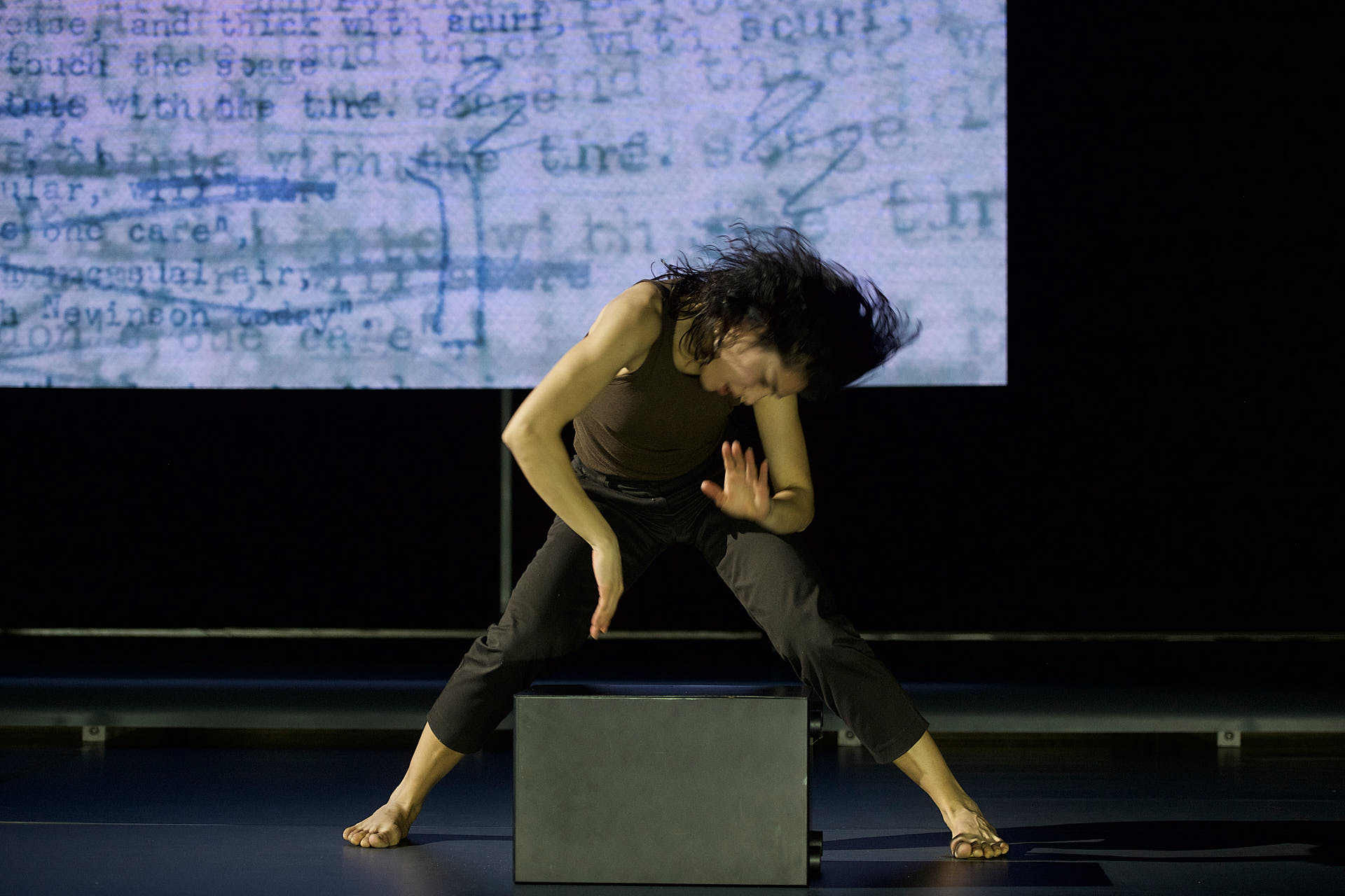 She creates an atmospheric tapestry in which language, music, video images and dance are interwoven.