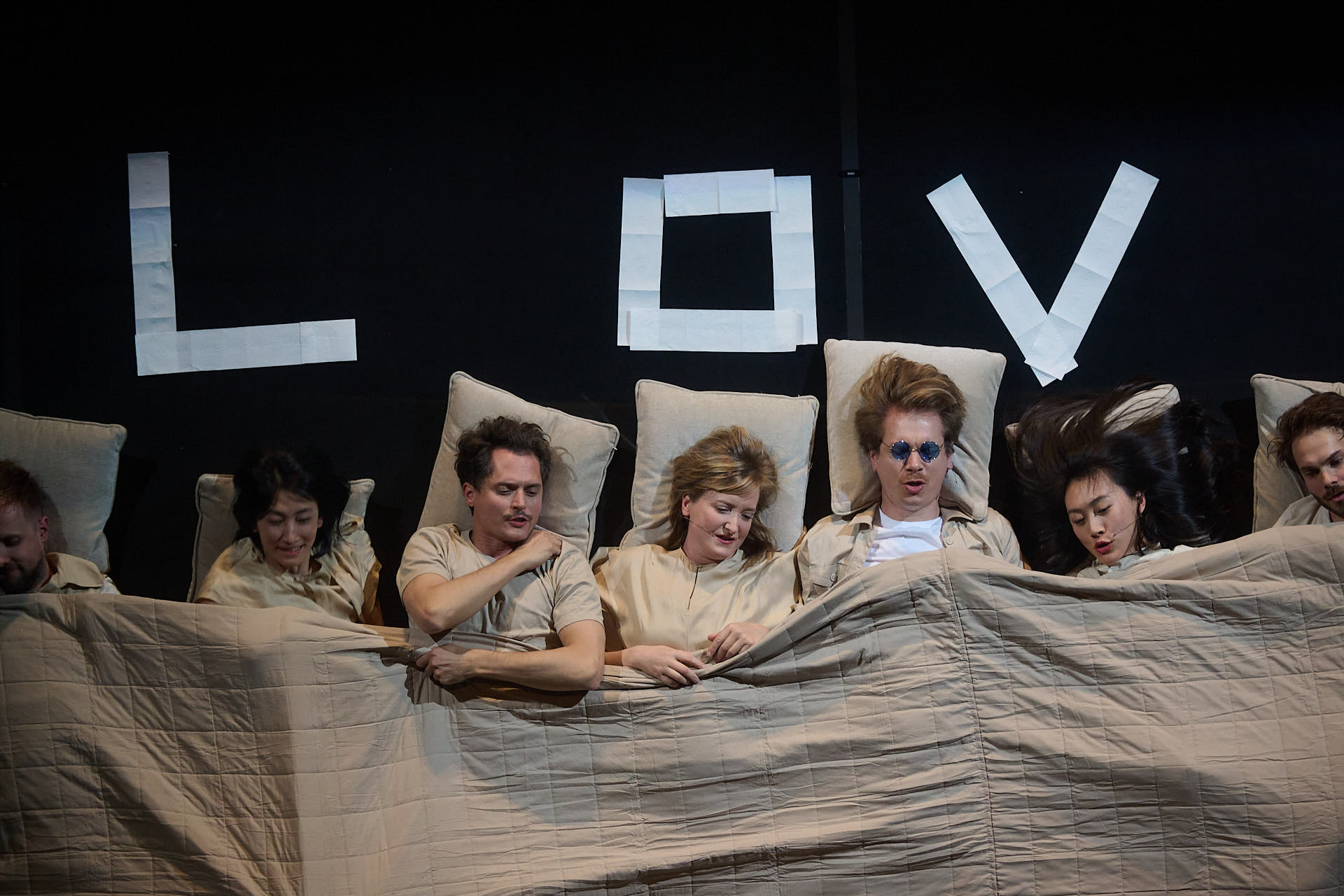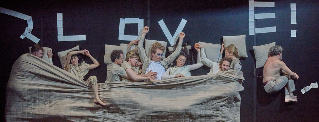For the finale, accompanied by John Lennon’s Gimme Some Truth, another powerful stage image unfolds: the performers roll in one by one, singing, and lie down side by side as if in a giant bed – each with a pillow beneath their head – and tear off strips of toilet paper to form the word “LOVE.” At the same time, they crawl under a massive sheet, finding comfort and closeness with those beside them. At the final note of the song, eight performers tear the sheet away from the Liar-character, leaving him uncovered and isolated at the edge of the stage.