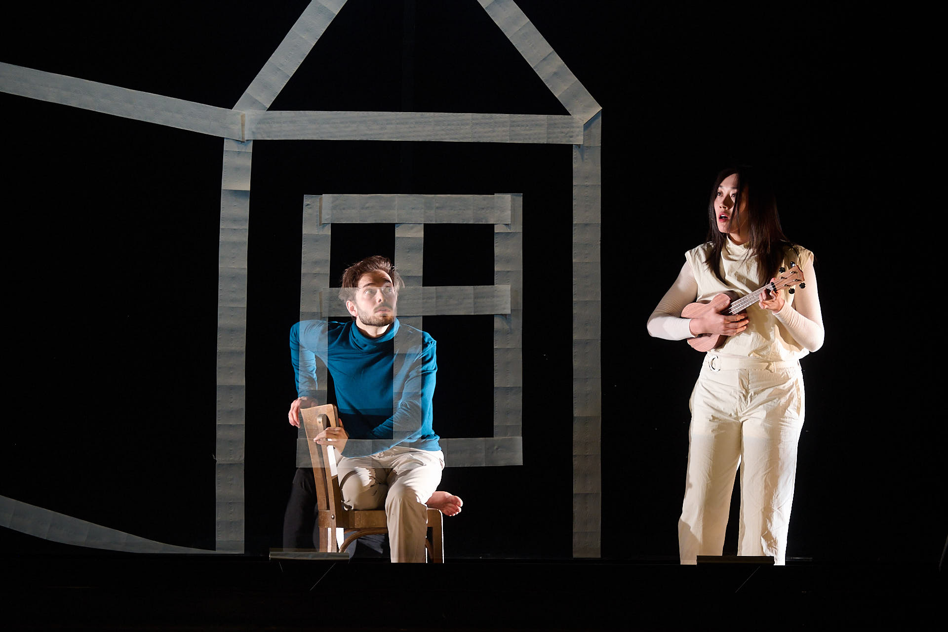 Aside from the AI-based mirror illusion, all other artistic effects on stage are created by human craft. One dancer outlines the shape of a house on the stage floor using toilet paper and then sits behind the mirror wall — in the projected reflection, it appears as if he is sitting by a window within that house. The dancer on the floor in front of the mirror — seemingly seated next to the house — and he act in separate dimensions, yet the mirror visibly connects them. The singer of the Doll Aria, who is in the same real space as the dancer (on the opposite side of the mirror), accompanies the scene with ukulele and vocals. For the audience, the dancer — who removes the house frame and repeatedly tries to break through the imaginary wall — now appears as the supposed ‘third figure’ in the triangle. But her attempts at connection are continually thwarted by the sound waves of the ukulele.