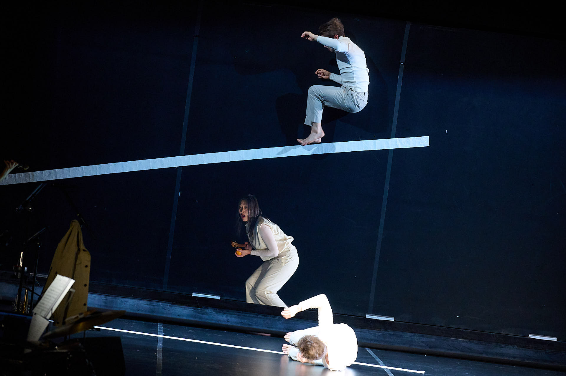 The entire piece thrives on the contrast between grounded reality on stage and the mirror images, along with the imaginary spaces behind them. At first, the relationship between floor and reflection seems clear: a simple mirror image, at most reversed and with a second of delay. But gradually it becomes clear how multifaceted and manipulative this apparent mirror world can be.
