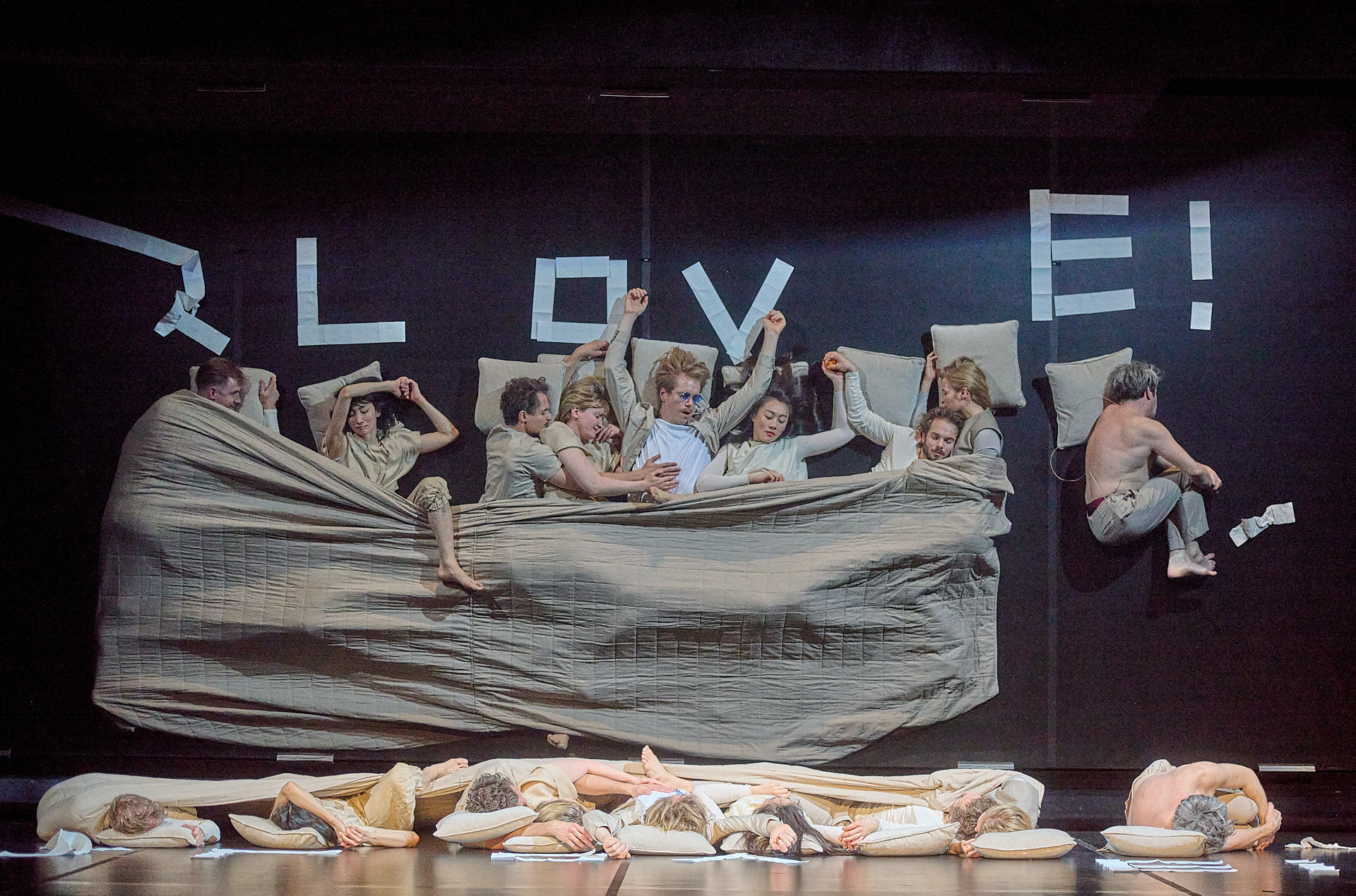 Of course, you can also ask about the relationship between lies and illusion or truth and reality, but then you simply have to call the end of the programme kitsch: To John Lennon's ‘Gimme some Truth’, the Berlin ensemble snuggled together under a large blanket and wrote the word ‘Love’ in capital letters across the scene.