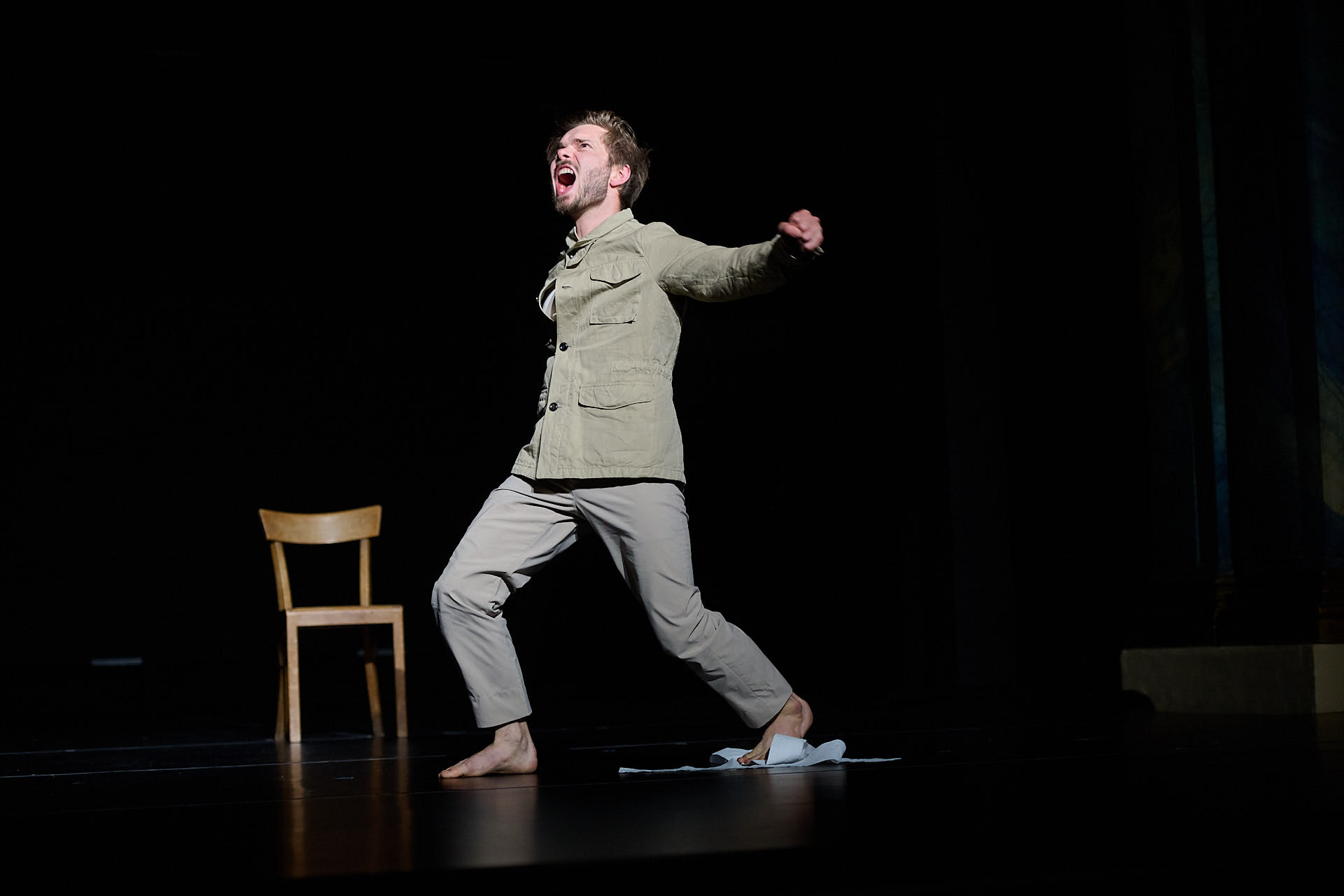 After another piano sonata by Chopin – the famous “Funeral March” – an actor appears shirtless on stage, symbolizing the concept of lies. He moves fanatically and expansively like a cult leader, gathering followers who surrender to him in an orgiastic frenzy.