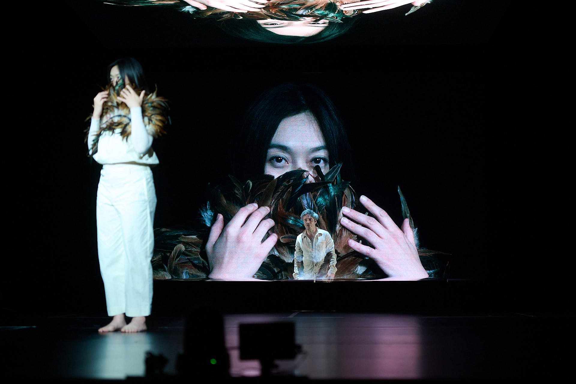 One of the truths about lies is this: lies often look or sound more beautiful than reality. Although the stage uses only simple props such as rolls of toilet paper, the images – thanks to live cameras integrated into the stage and AI-assisted projections – are transformed into aestheticized illusions on the mirror surface. A singer, dressed plainly in white, stands facing the audience and sings. Her partner drapes strands of toilet paper over her shoulders. But in the mirrored image, the AI transforms the scene: the paper becomes a traditional headdress and skirt ribbons – like a living oil painting from centuries past.