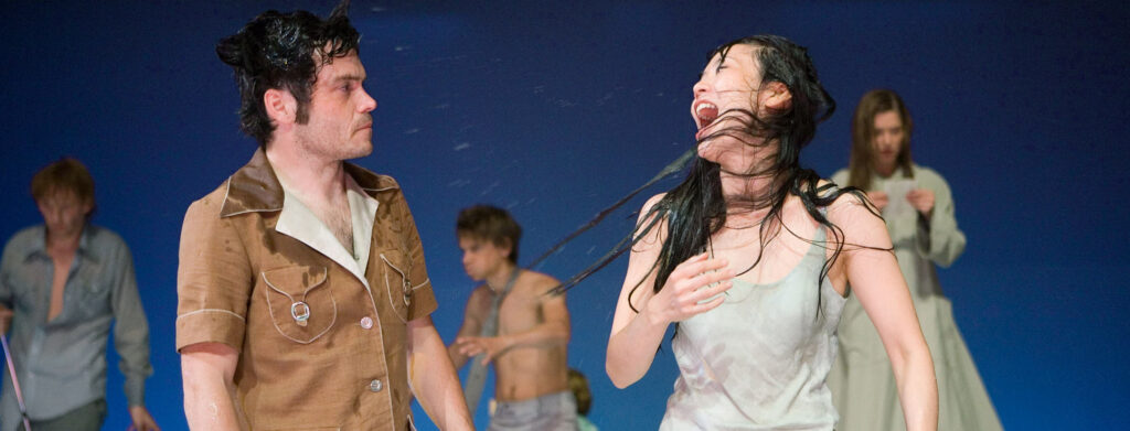 …Her theatre is political, poetic, wondrous, her Berlin troupe a gathering of physical-theatre creatures behaving in typical capital city manner… Though it all revolves round death, at end it is by no means depressing – touchingly beautiful rather. A violin plays the melody from “Abschied“ (Farewell) and sounds like a superhuman voice afloat.